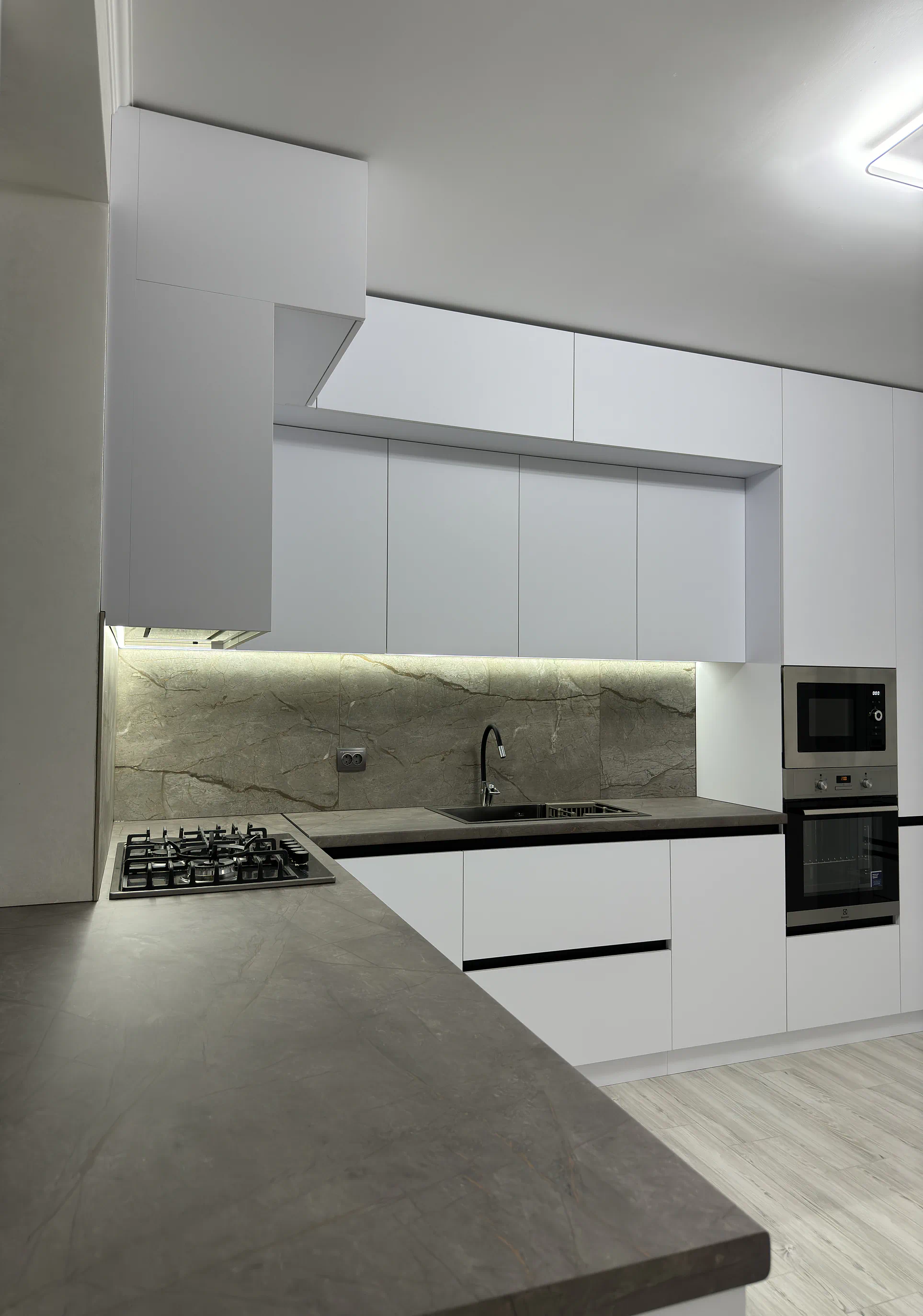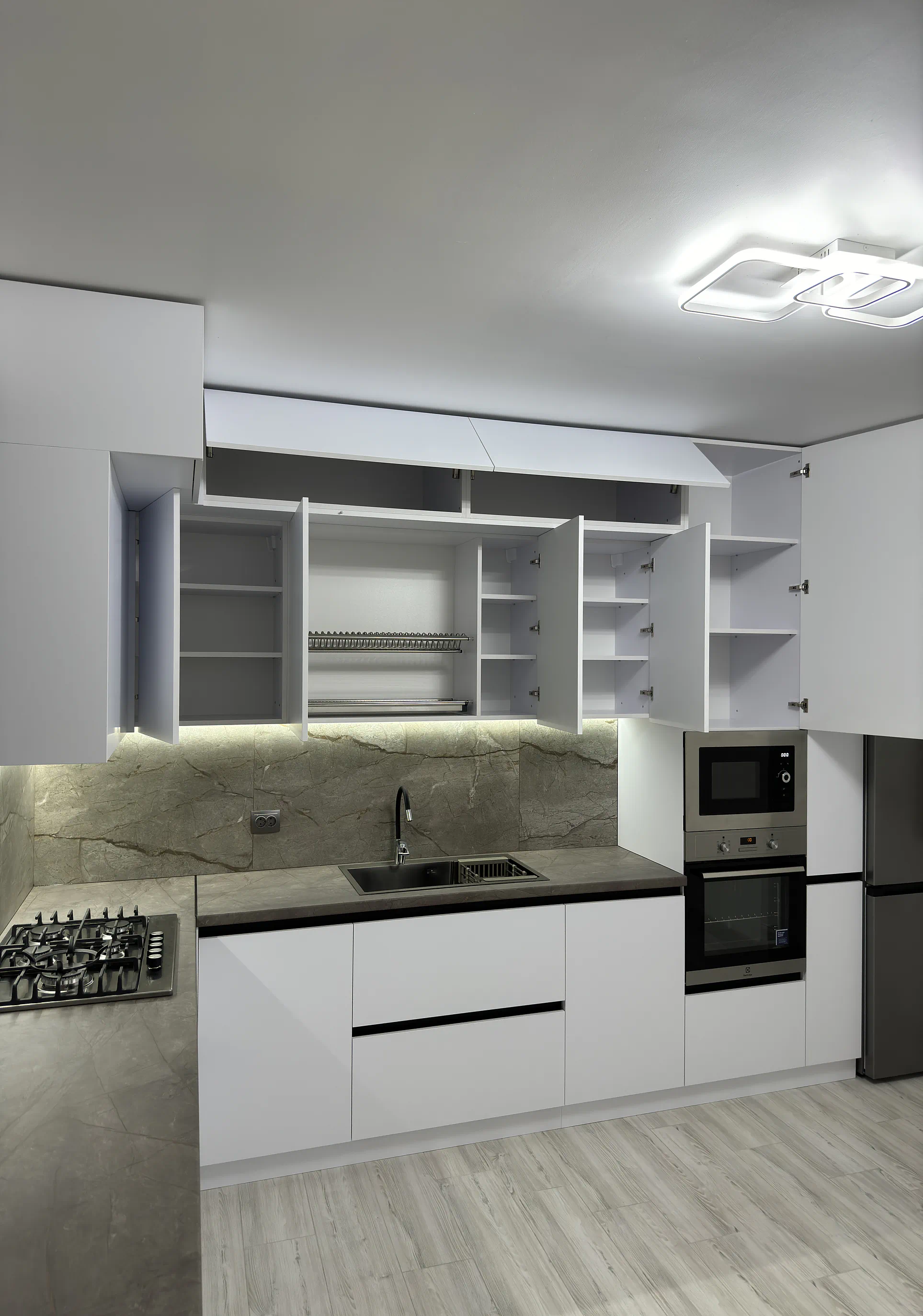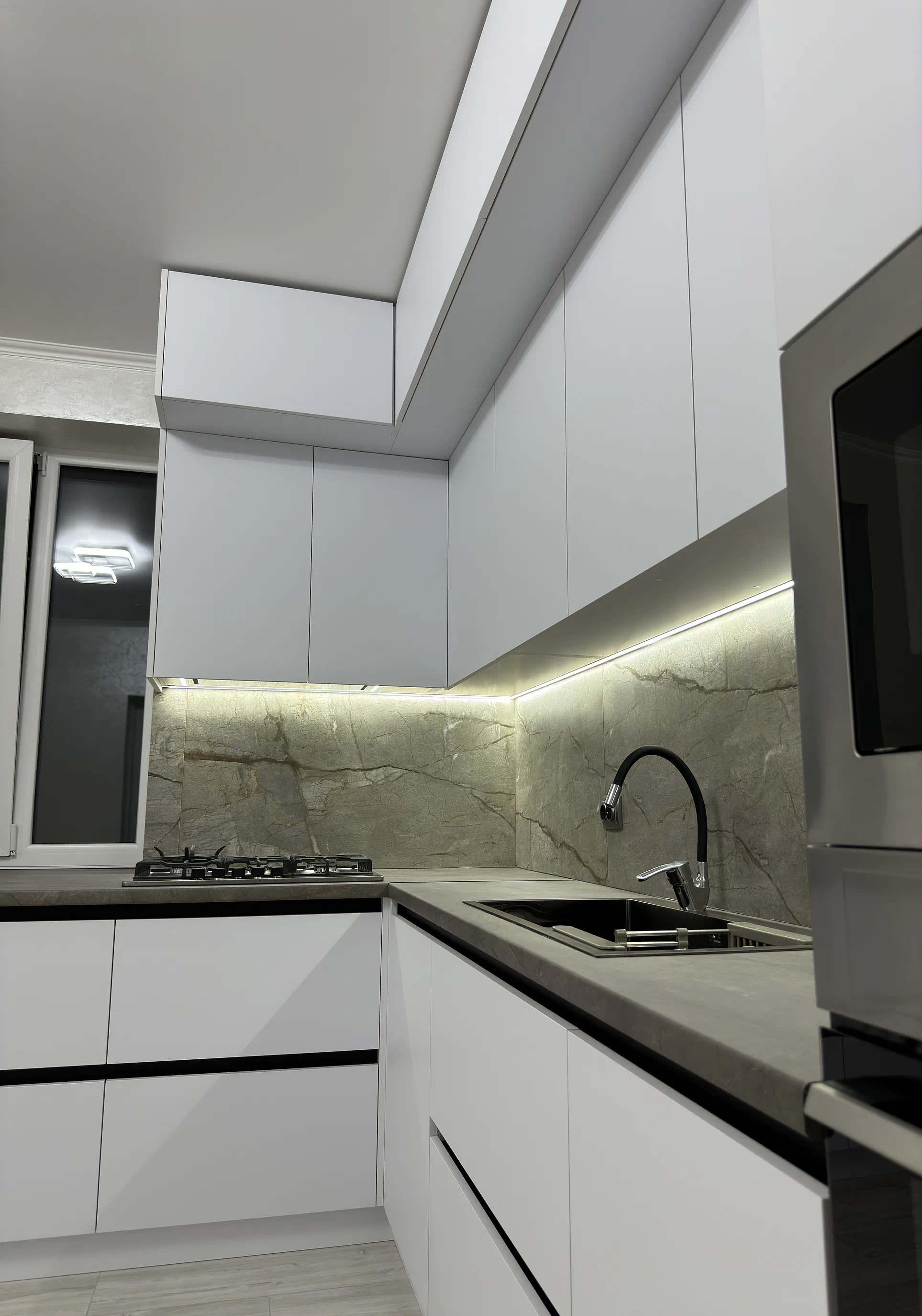 У цьому проєкті двоярусна кухня до стелі допомогла максимально використати простір і зробити всю композицію візуально рівною. Білі акрилові фасади формують чистий сучасний вигляд, профіль Gola підкреслює лаконічність, а великий фартух під камінь додає кухні глибини й характеру.