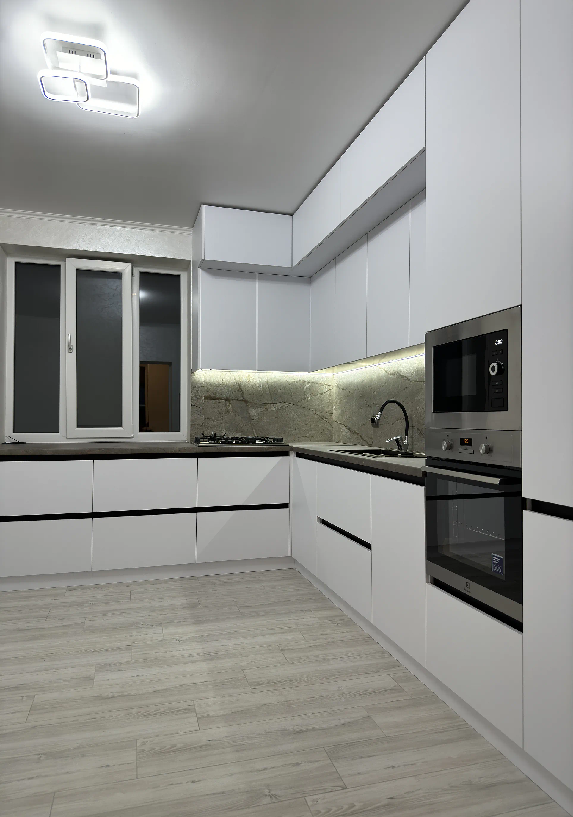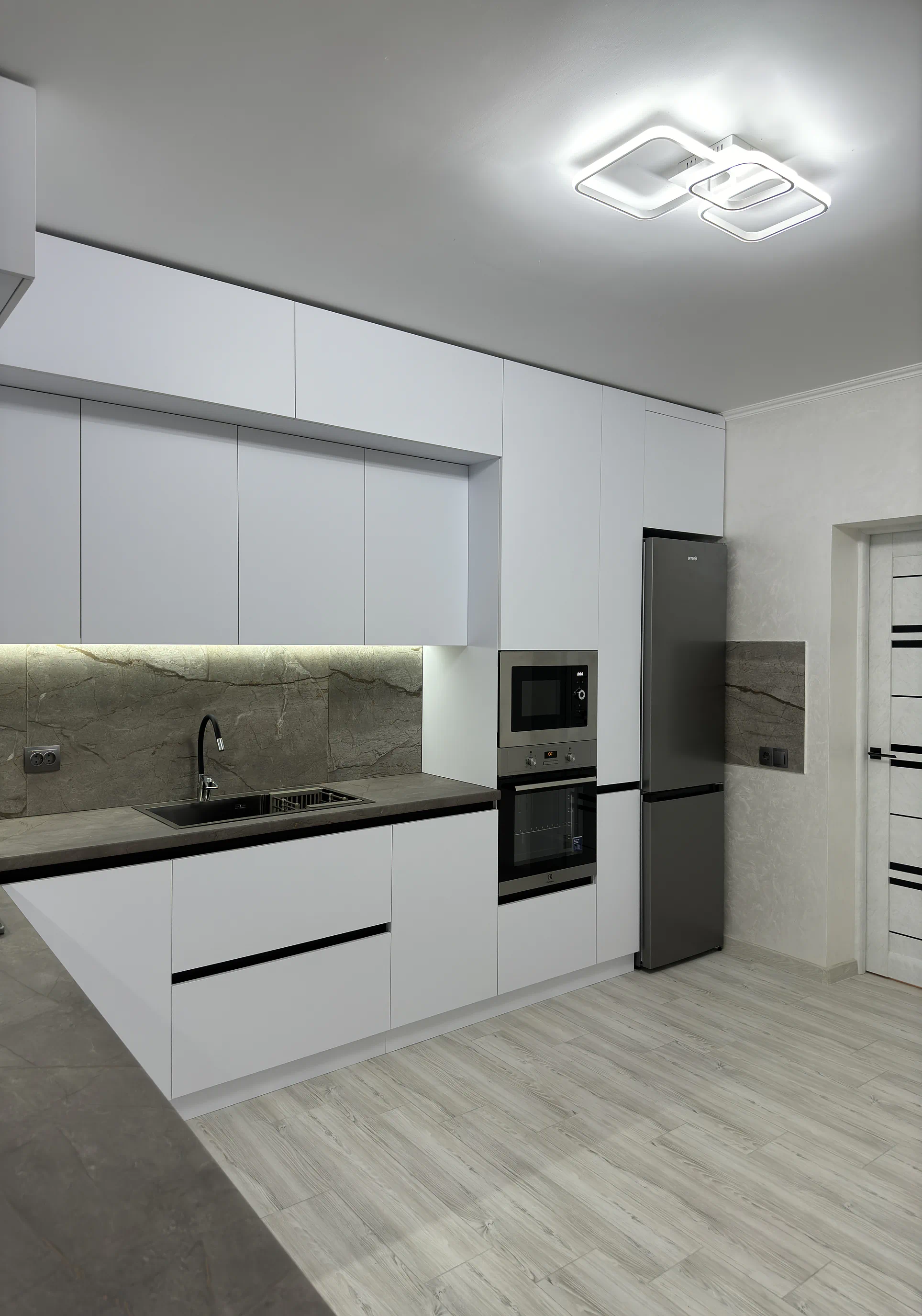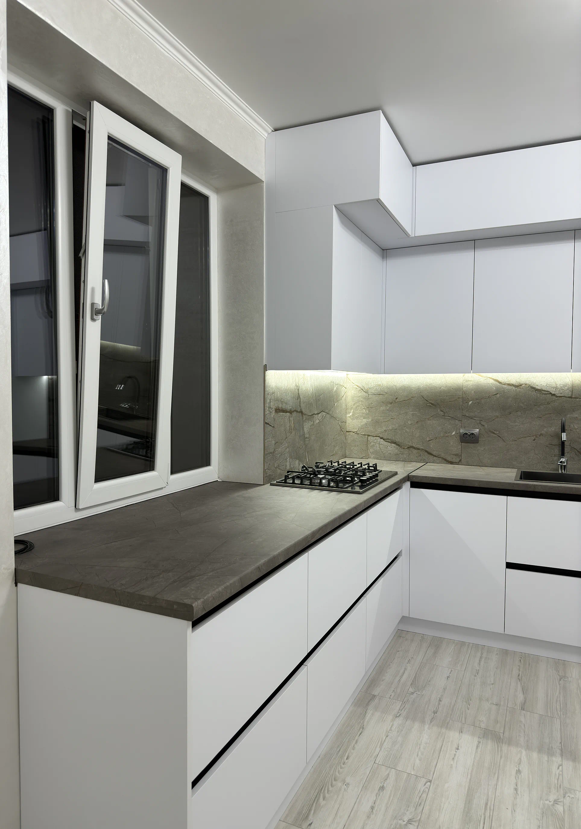 У цьому проєкті двоярусна кухня до стелі допомогла максимально використати простір і зробити всю композицію візуально рівною. Білі акрилові фасади формують чистий сучасний вигляд, профіль Gola підкреслює лаконічність, а великий фартух під камінь додає кухні глибини й характеру.