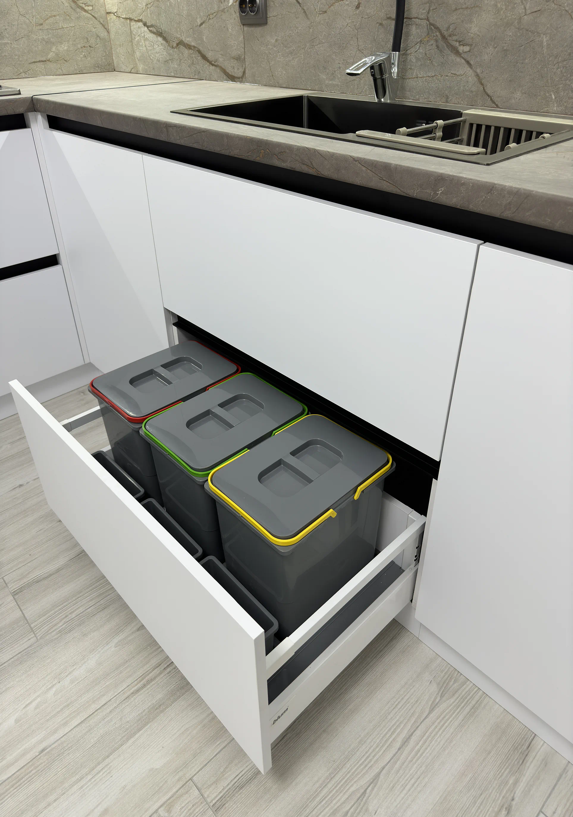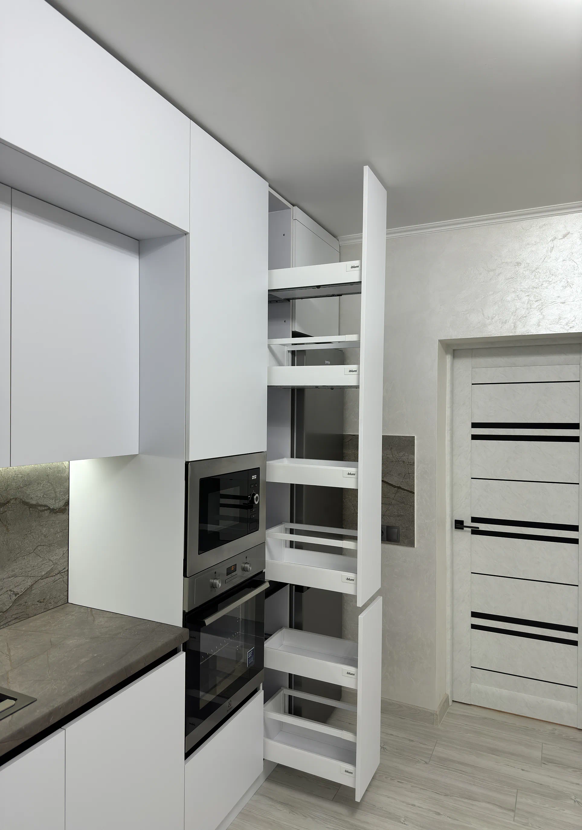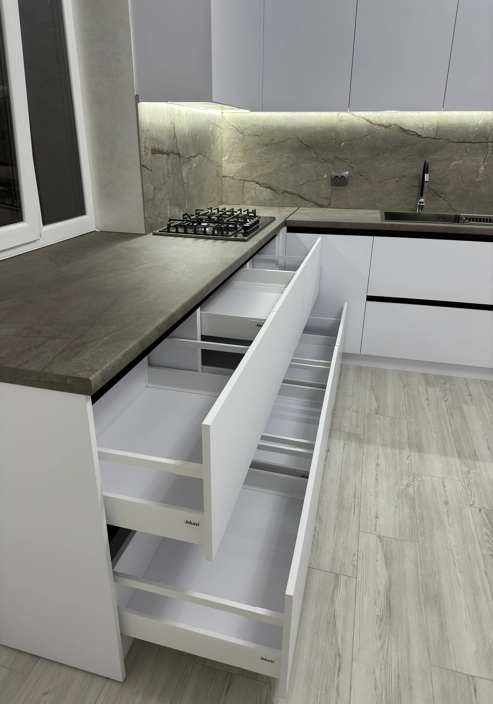 Окрема фішка цієї кухні — стільниця нестандартного розміру, яка заходить на підвіконня. Таке рішення виглядає цілісно, додає корисної площі й добре працює саме в реальному побуті. Усередині кухня також продумана дуже практично: високе карго, прихована шухляда для столових приборів, система для сміття, шухляди Tandembox Antaro та механізм AVENTOS HK-XS роблять користування зручним щодня.