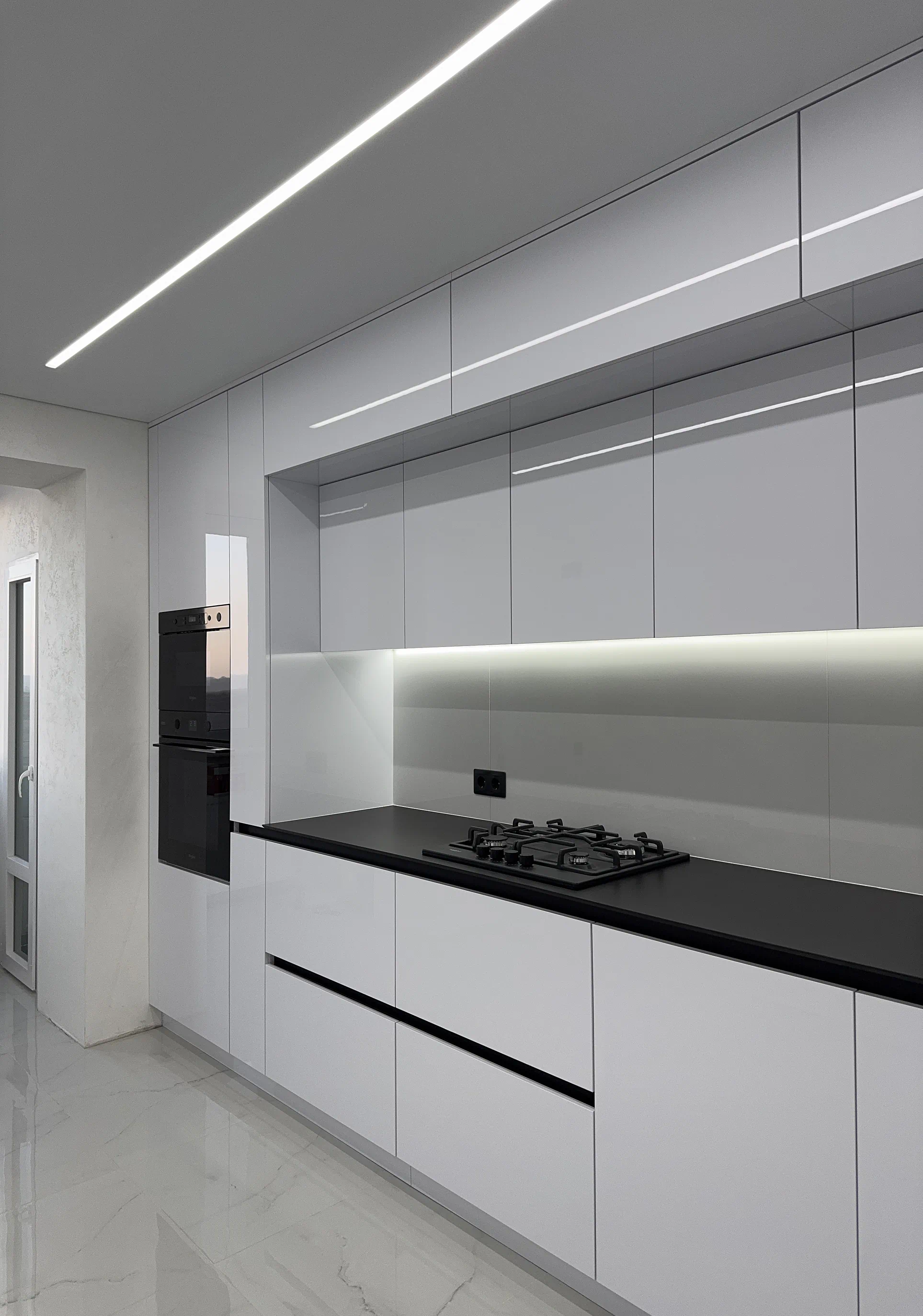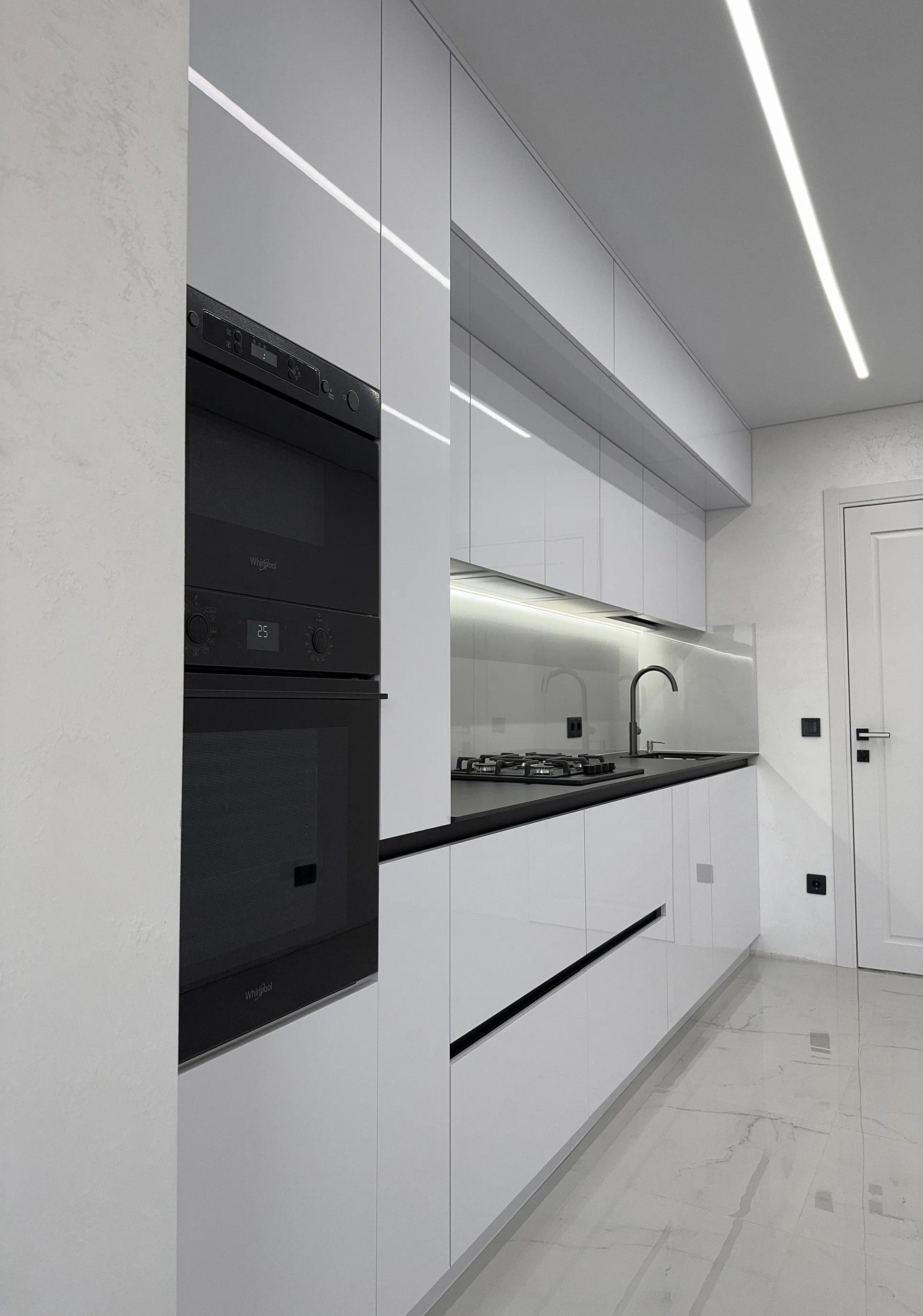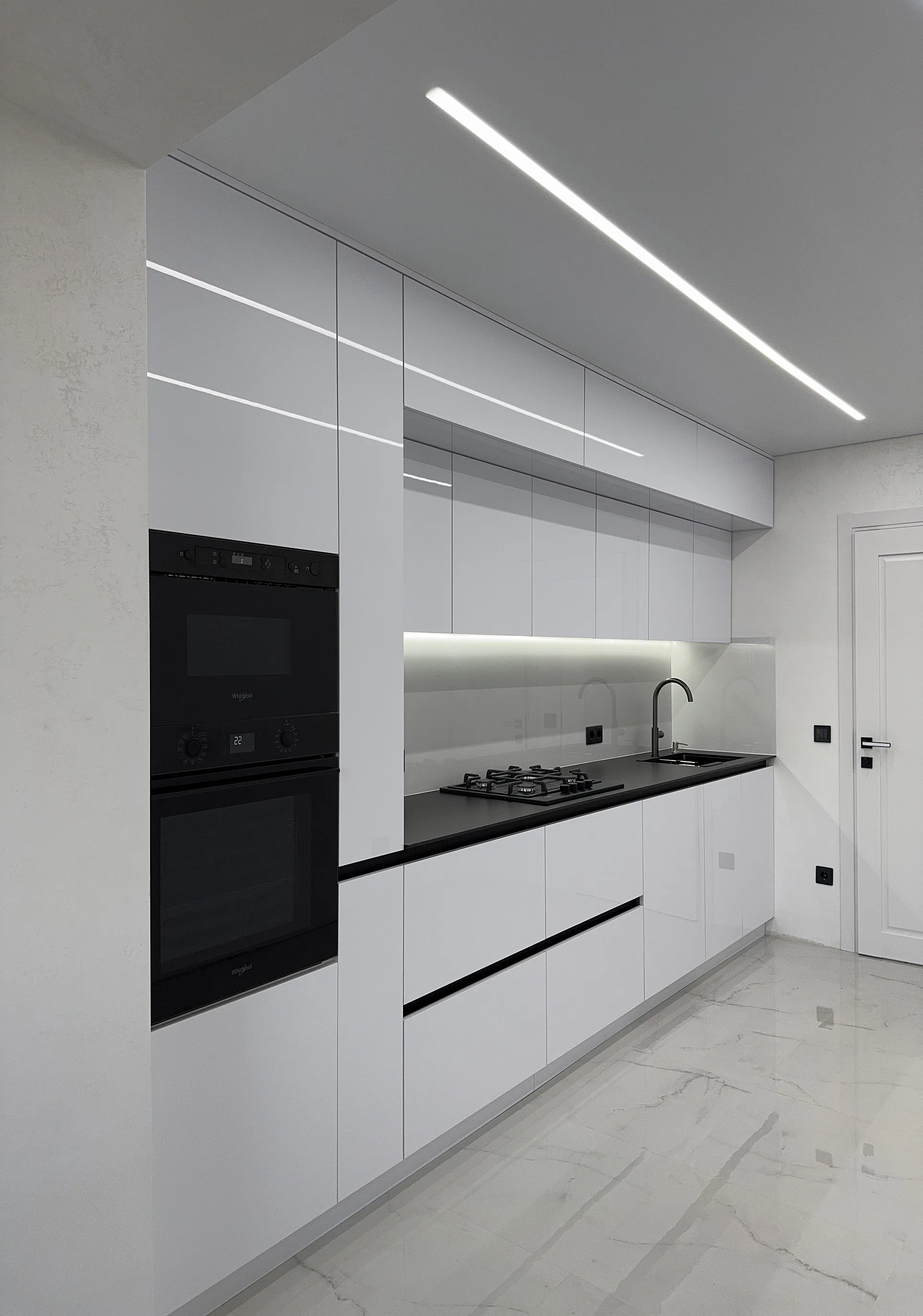 Кухня виконана у сучасному стилі з акцентом на білий колір, глянець і чітку геометрію фасадів. Саме світлі глянцеві поверхні допомагають зробити простір візуально легшим, додають відчуття чистоти та добре працюють у поєднанні з вбудованою технікою й мінімалістичними рішеннями без класичних ручок.