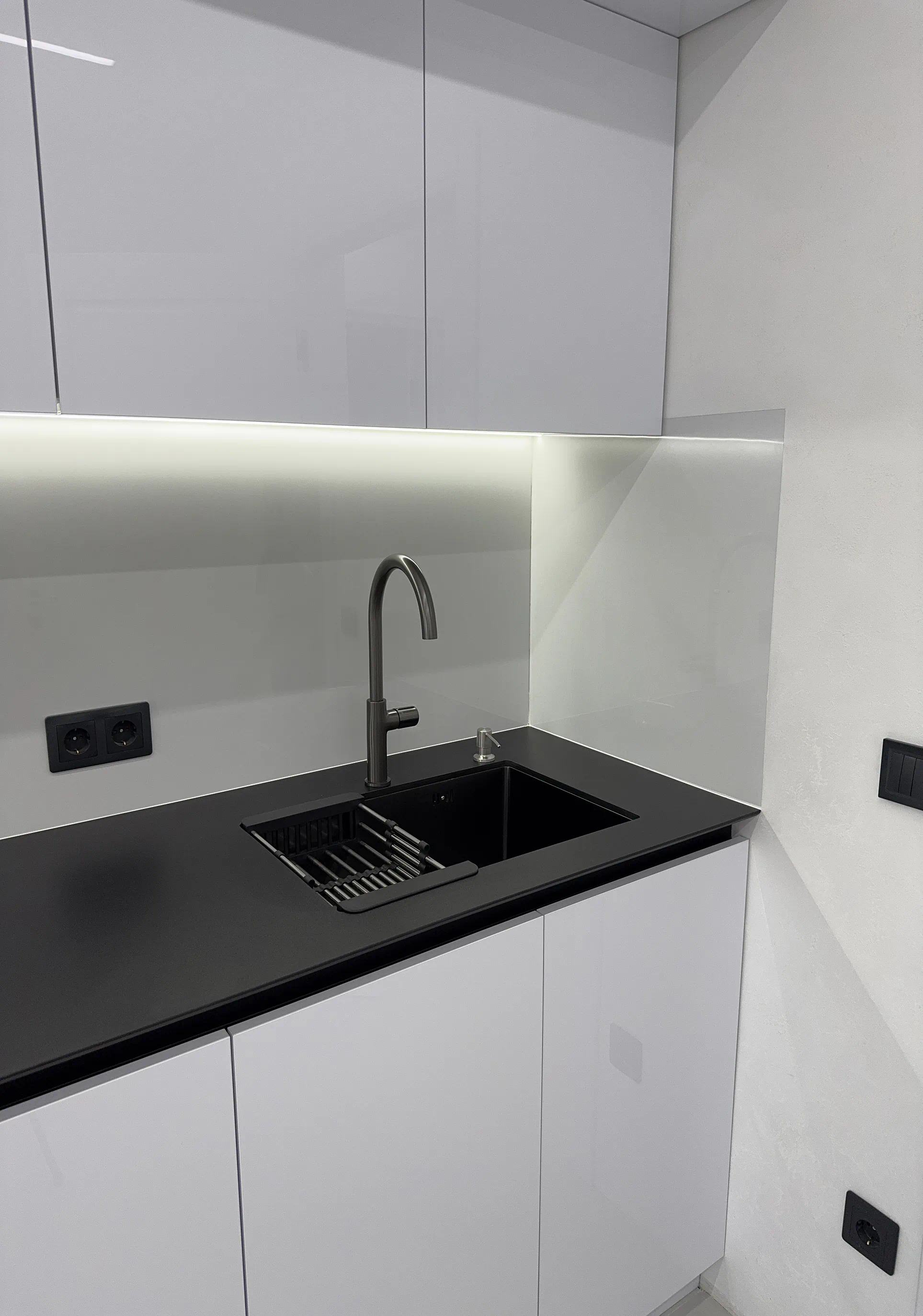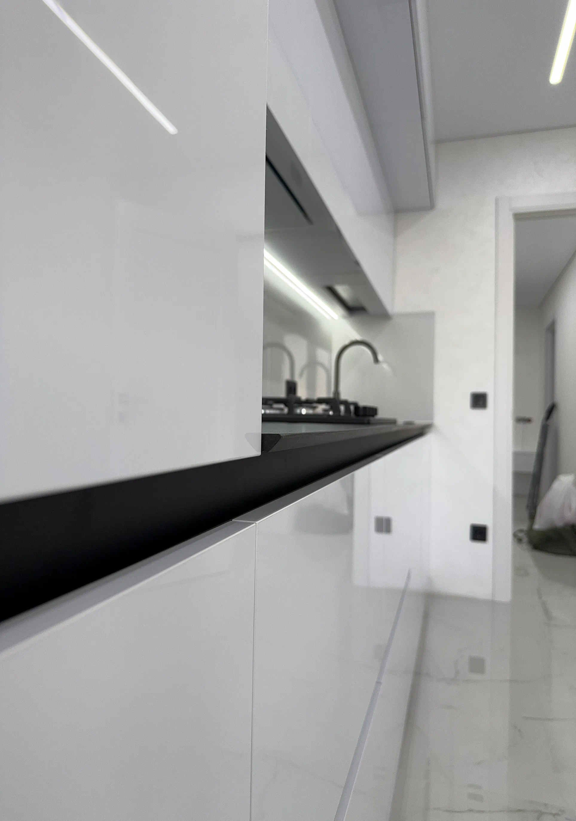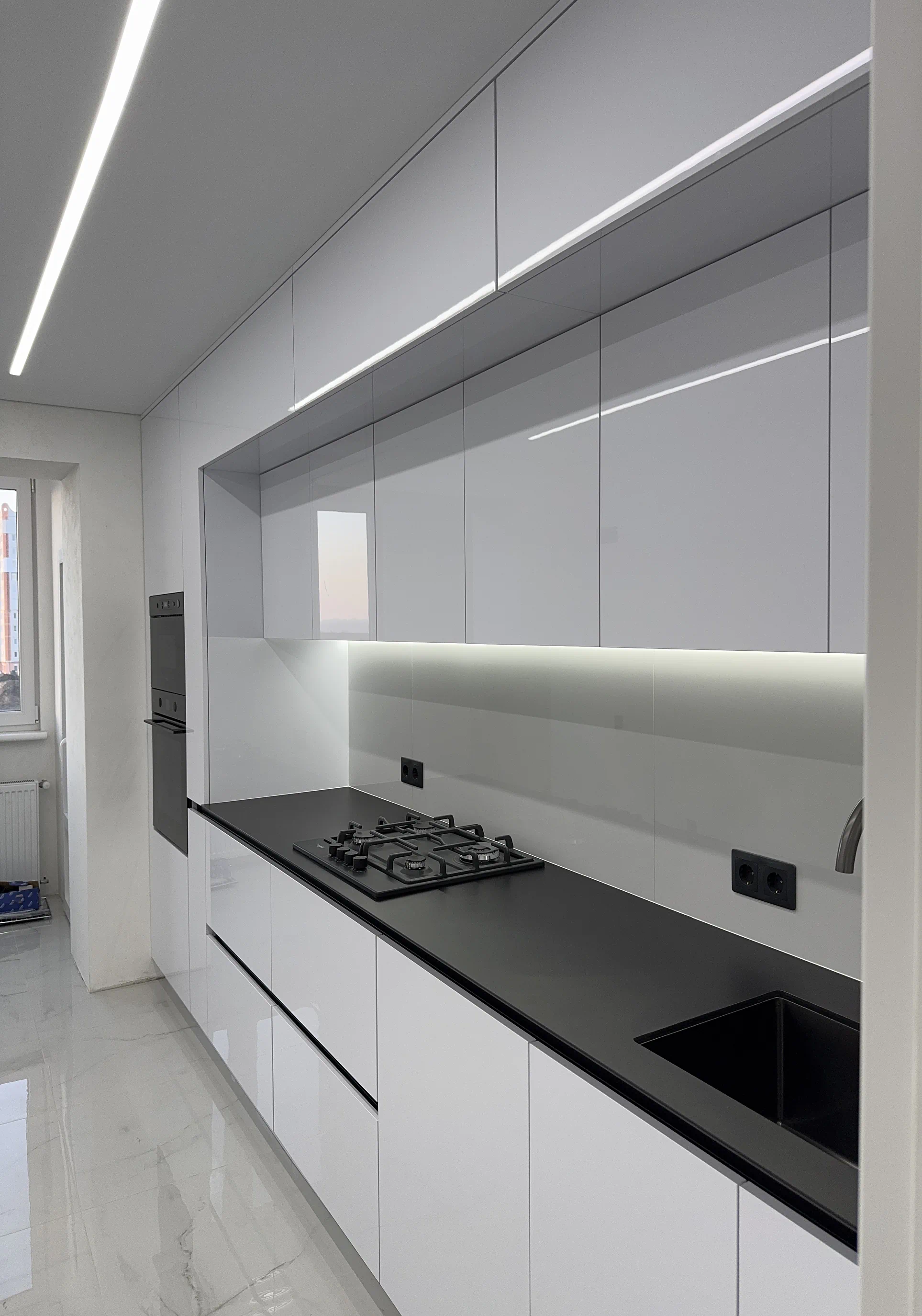 Кухня виконана у сучасному стилі з акцентом на білий колір, глянець і чітку геометрію фасадів. Саме світлі глянцеві поверхні допомагають зробити простір візуально легшим, додають відчуття чистоти та добре працюють у поєднанні з вбудованою технікою й мінімалістичними рішеннями без класичних ручок.