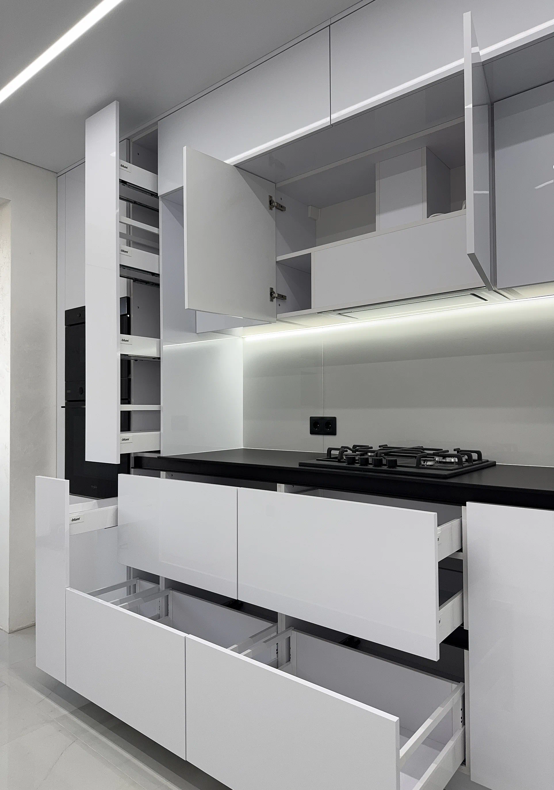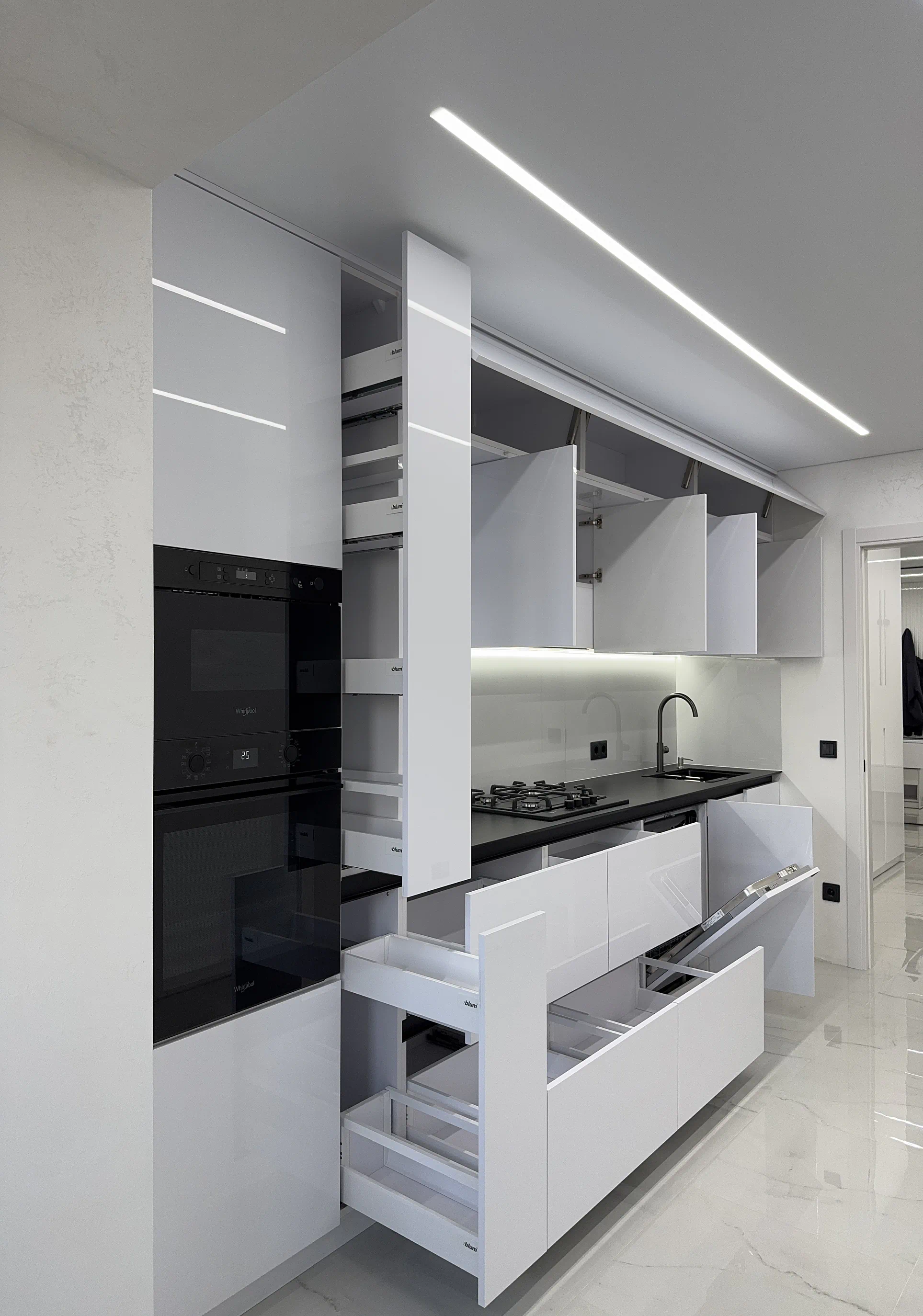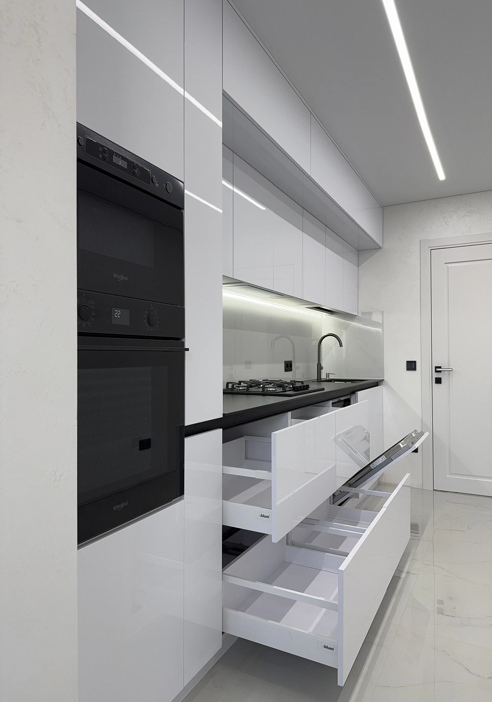 Окрему роль у цьому проєкті відіграє продумане наповнення. Фурнітура Blum забезпечує плавну та надійну роботу механізмів, шухляди TANDEMBOX Antaro додають зручності в організації зберігання, а підіймальні механізми AVENTOS HK-XS роблять користування верхніми модулями комфортним. Висувне карго, мийка нижнього монтажу, вмонтована техніка, профіль Gola та LED-підсвічування робочої зони підсилюють відчуття сучасної, продуманої кухні, де все на своєму місці.