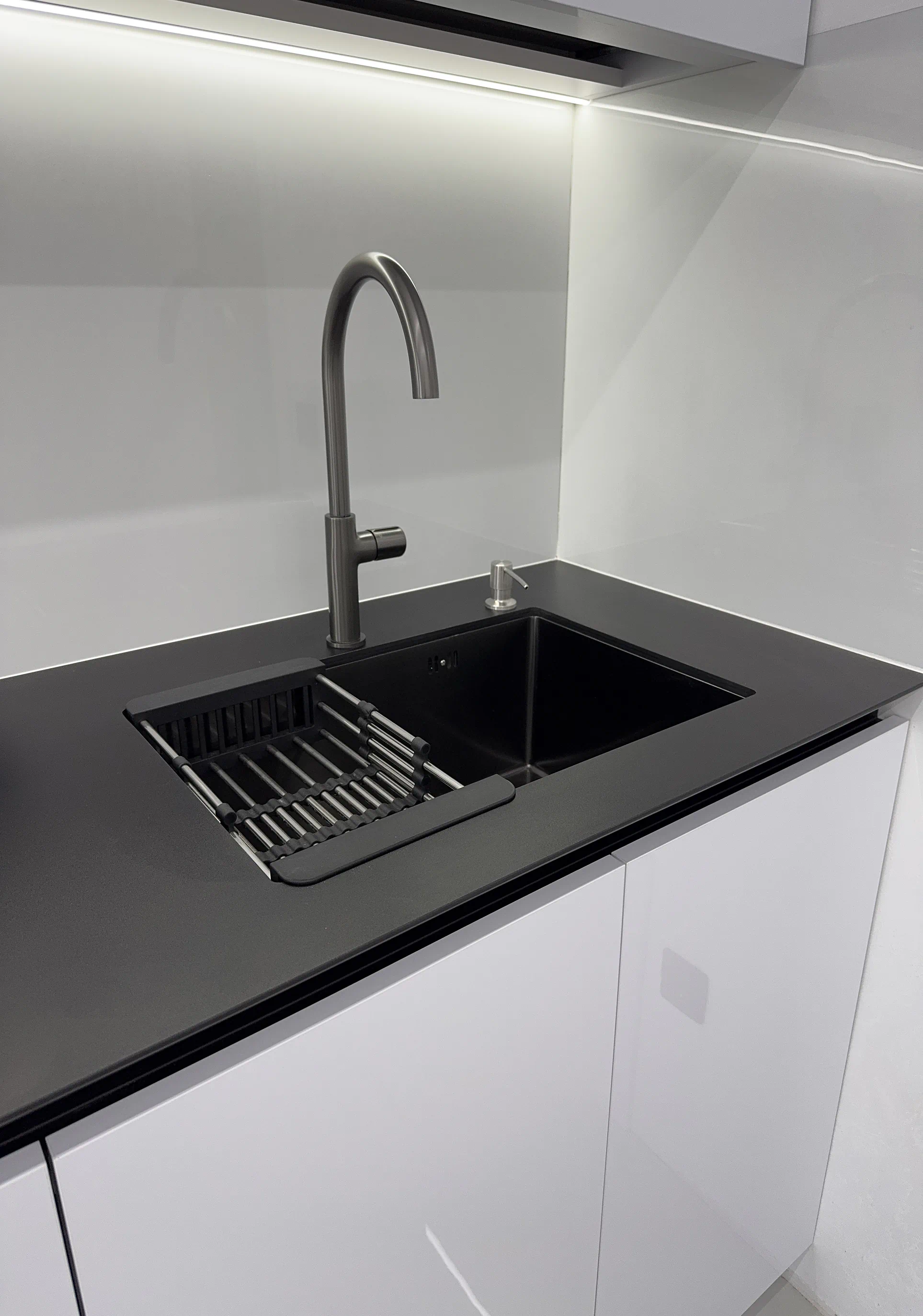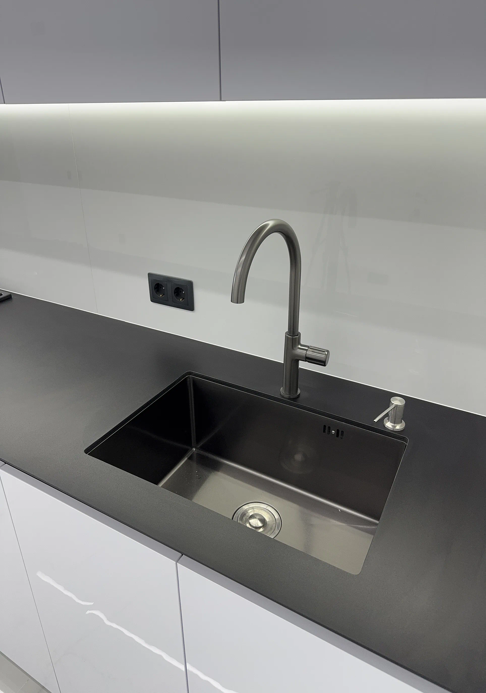 Акрилові фасади LuxeForm мають сучасний вигляд, рівну виразну поверхню та добре підходять для кухонь, де важливі естетика і практичність. Стільниця з компакт-плити HPL 12 мм Termopal — це міцне й вологостійке рішення для щоденного користування. Такий матеріал добре витримує кухонне навантаження, а завдяки тонкому профілю виглядає сучасно й акуратно.