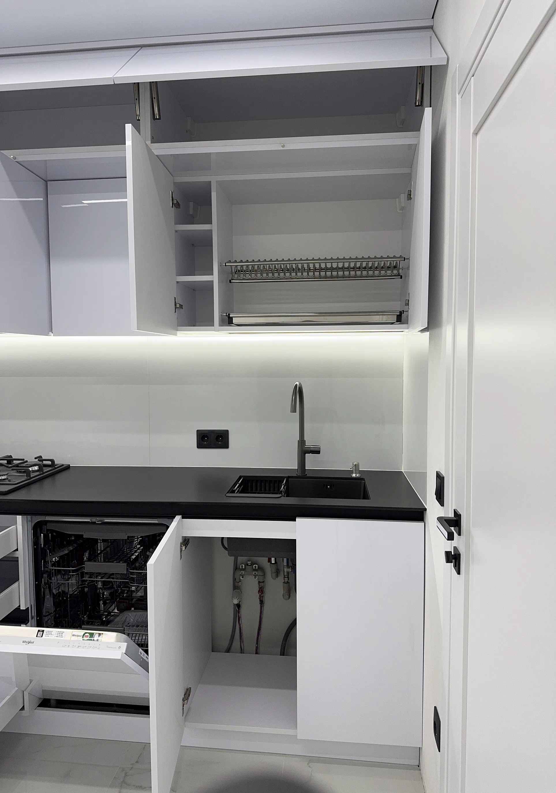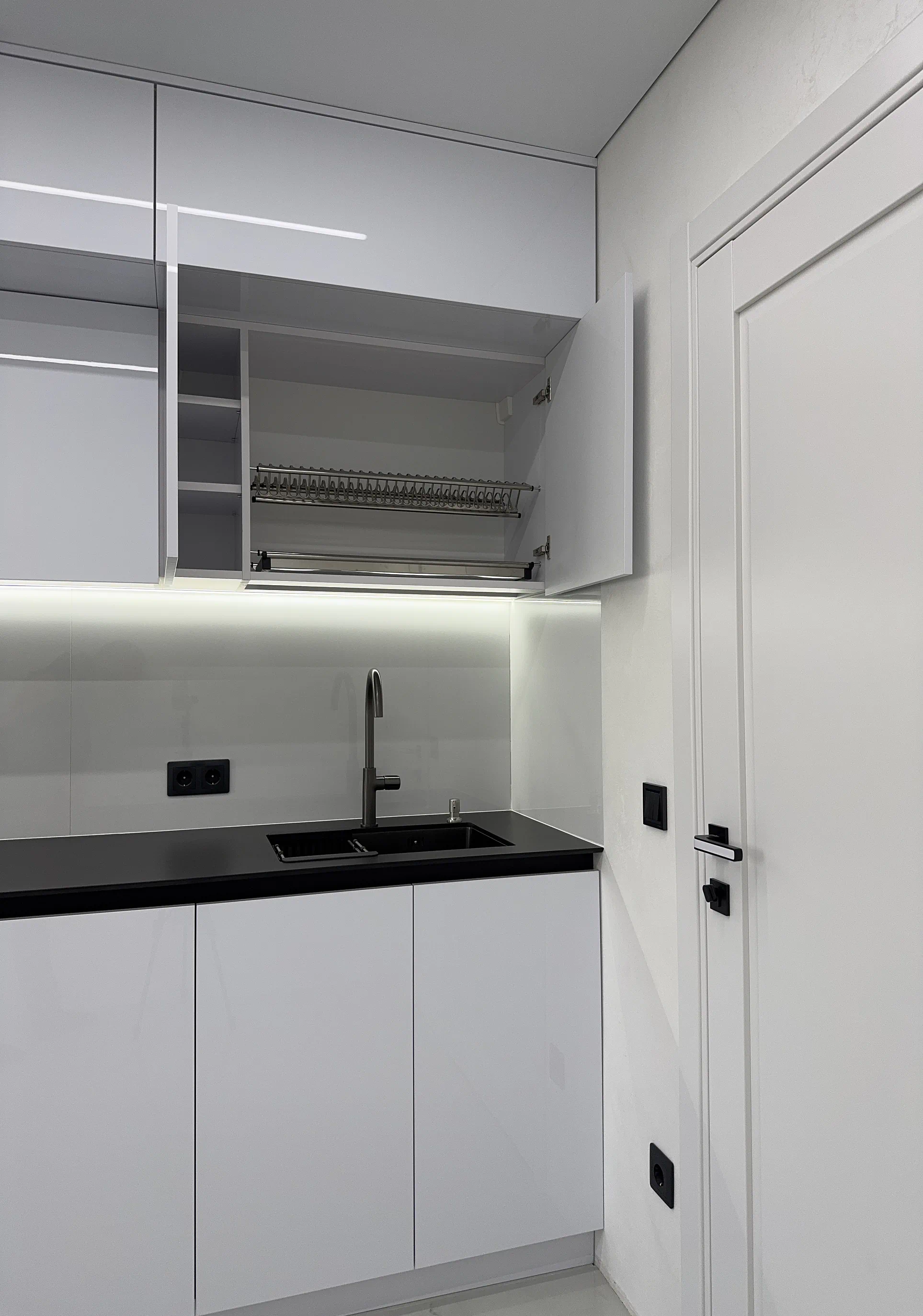 Світла двоярусна кухня до стелі — це рішення для тих, хто хоче поєднати сучасний вигляд, функціональність і відчуття чистого, акуратного простору. У цьому проєкті акцент зроблено на білому кольорі, глянцевих акрилових фасадах та лаконічних лініях, які візуально полегшують кухню й роблять її більш просторою на вигляд.
