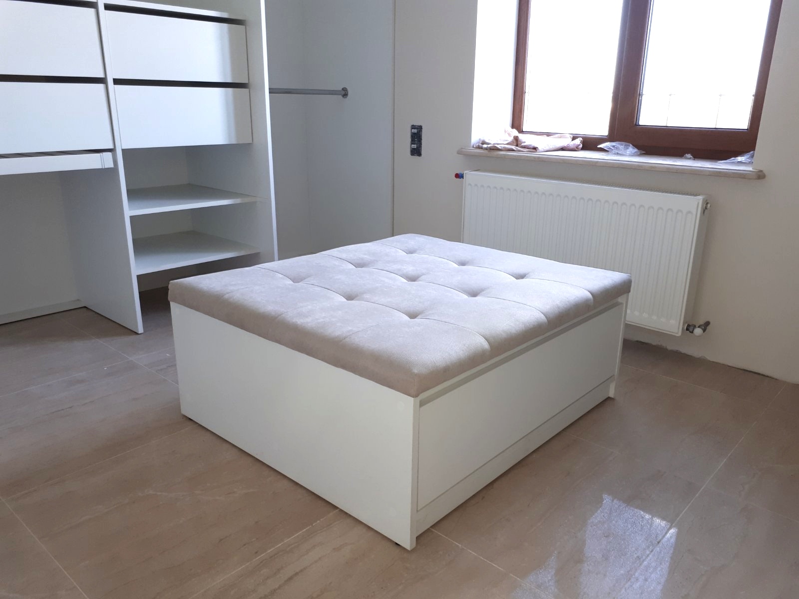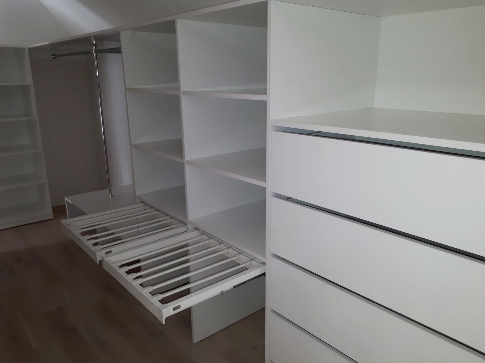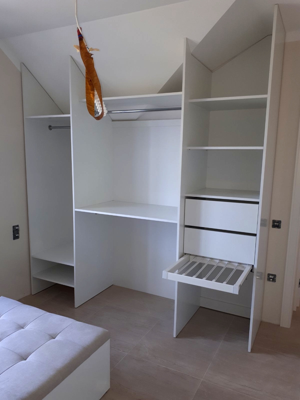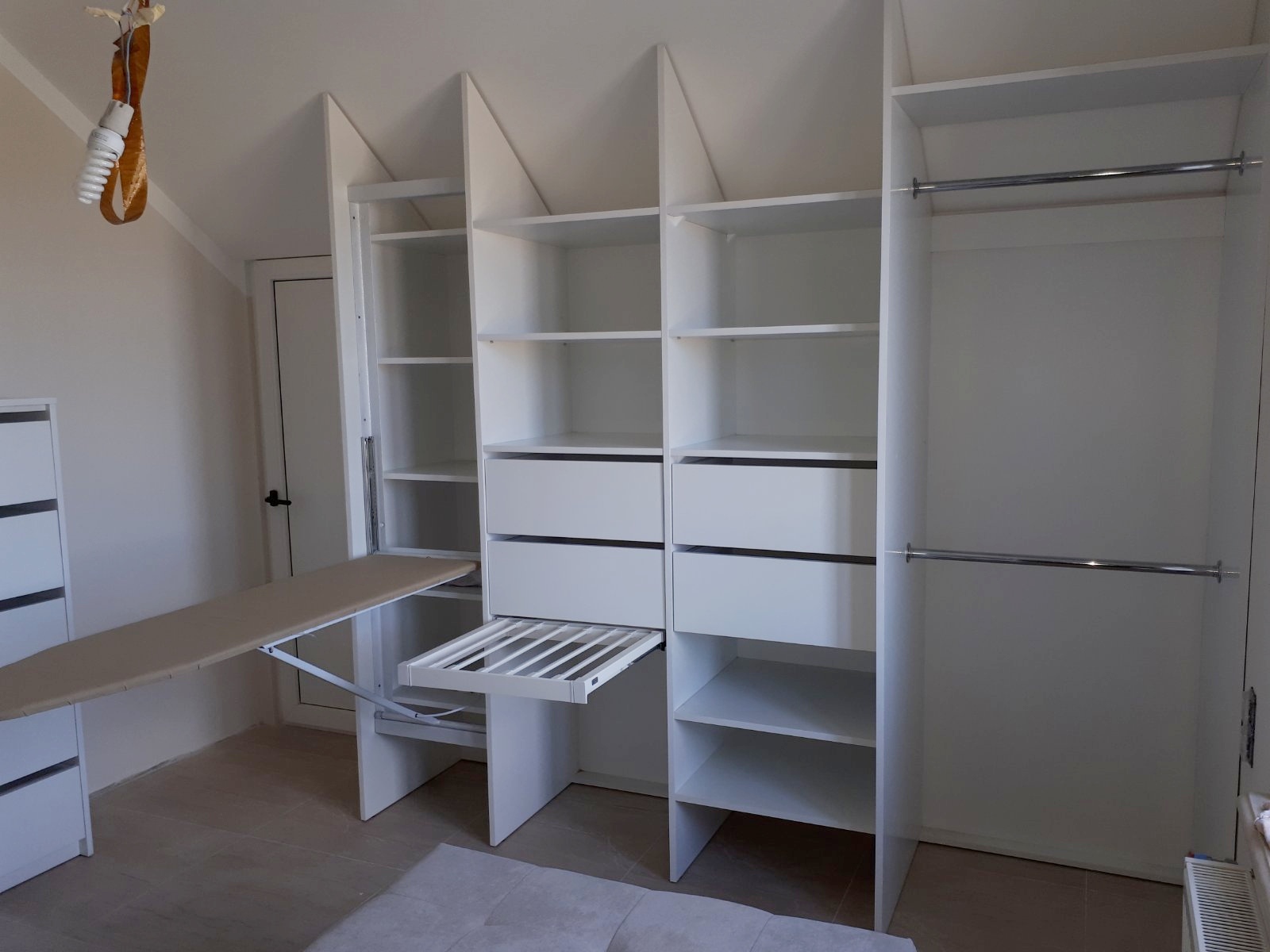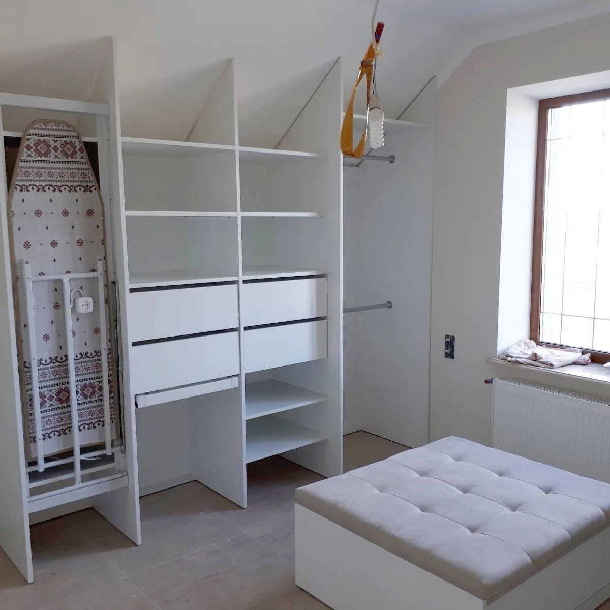Гардеробна кімната за індивідуальним замовленням в мансардній кімнаті. Матеріали -ЛДСП. Вмонтована гладильна дошка, брючниці. Пуф з м'яким сидінням та висувною шухлядою.