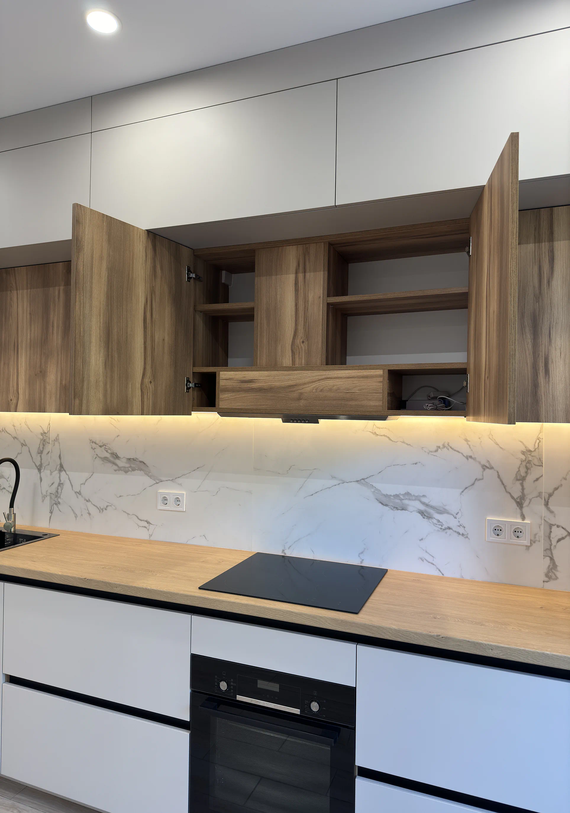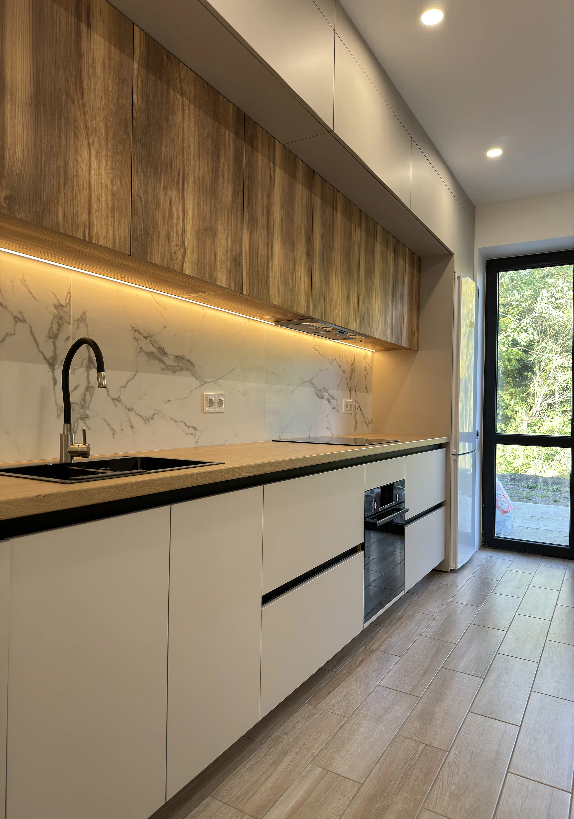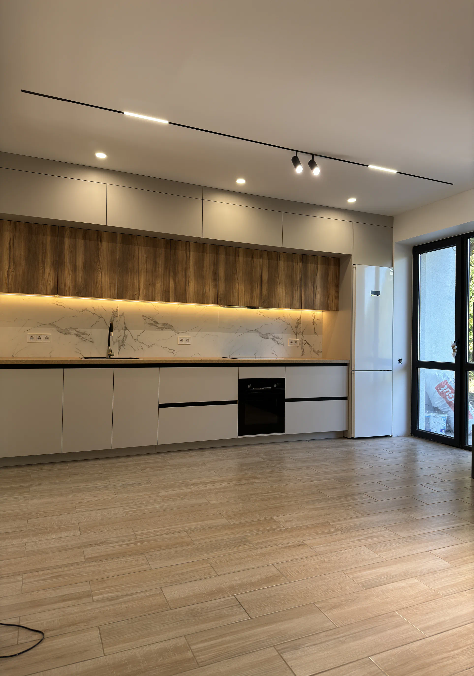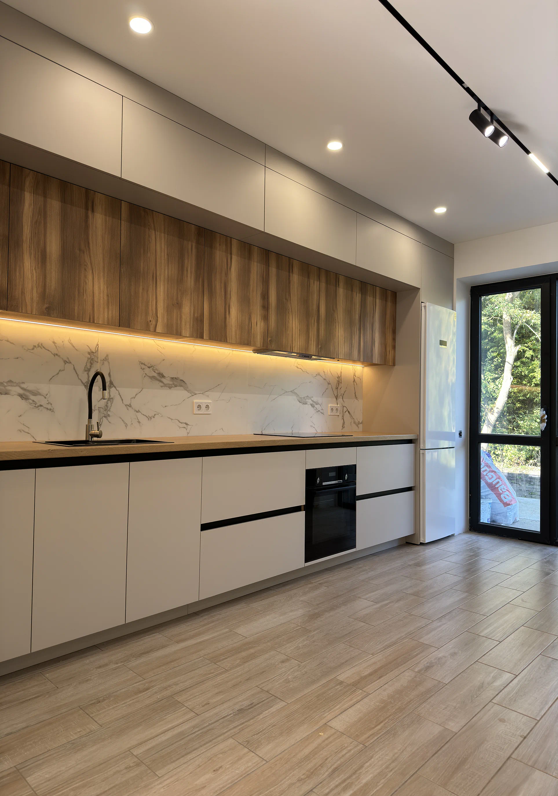 Кухня для котеджу має виглядати цілісно, спокійно й дорого, але водночас бути зручною в щоденному житті. У цьому проєкті головний акцент зроблено на двоярусну композицію до самої стелі, стриману сучасну подачу та продумане наповнення, яке добре працює в просторі приватного будинку.