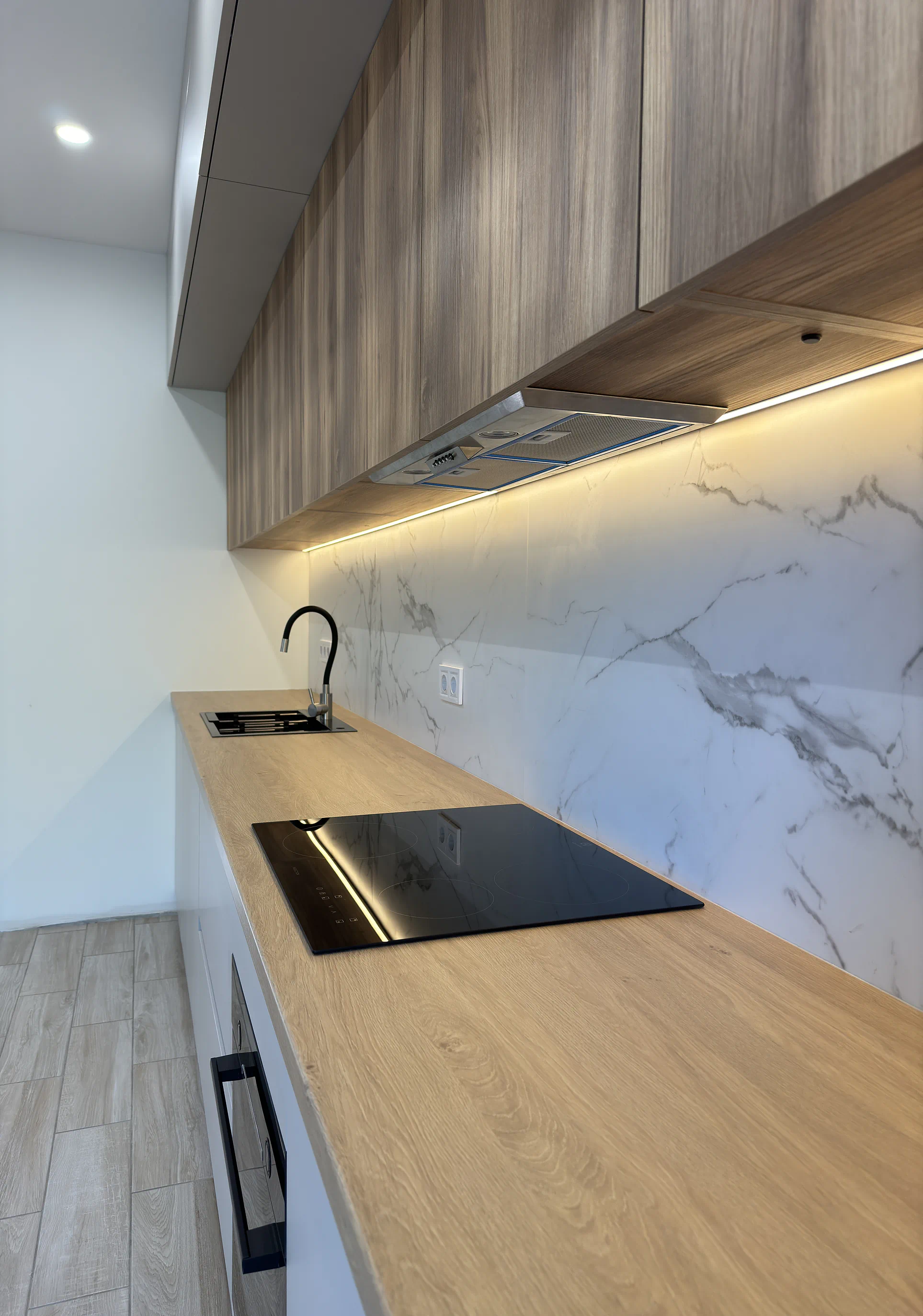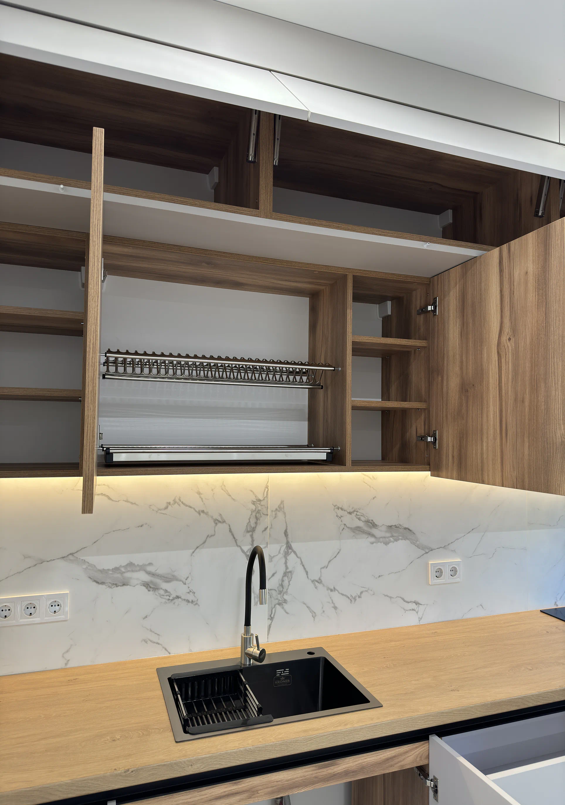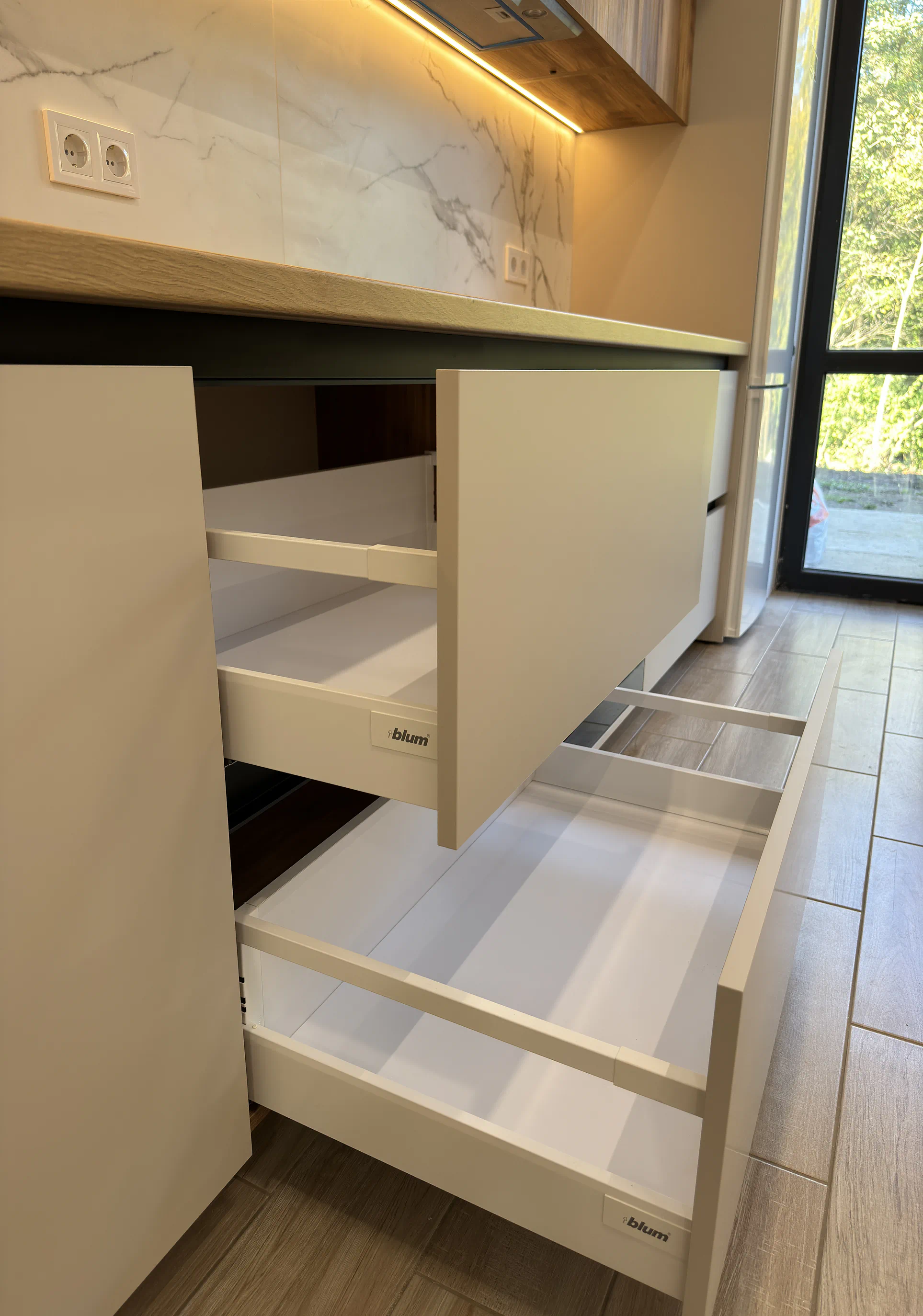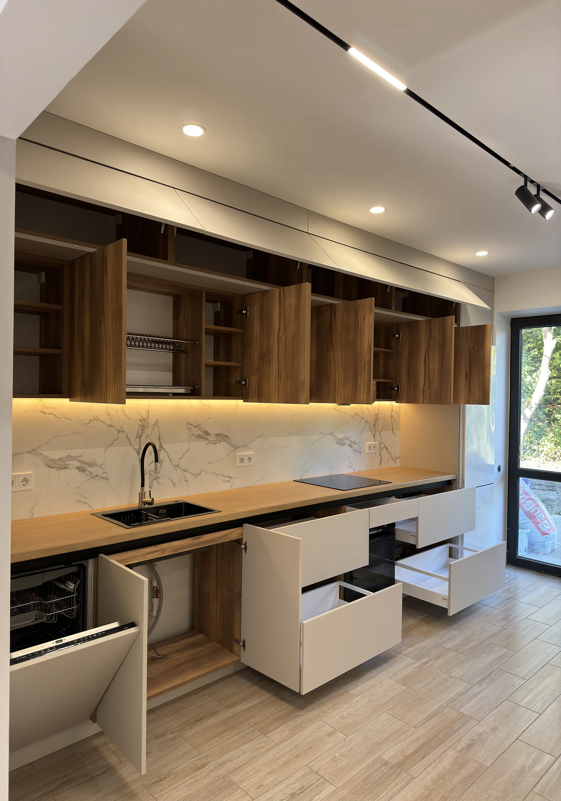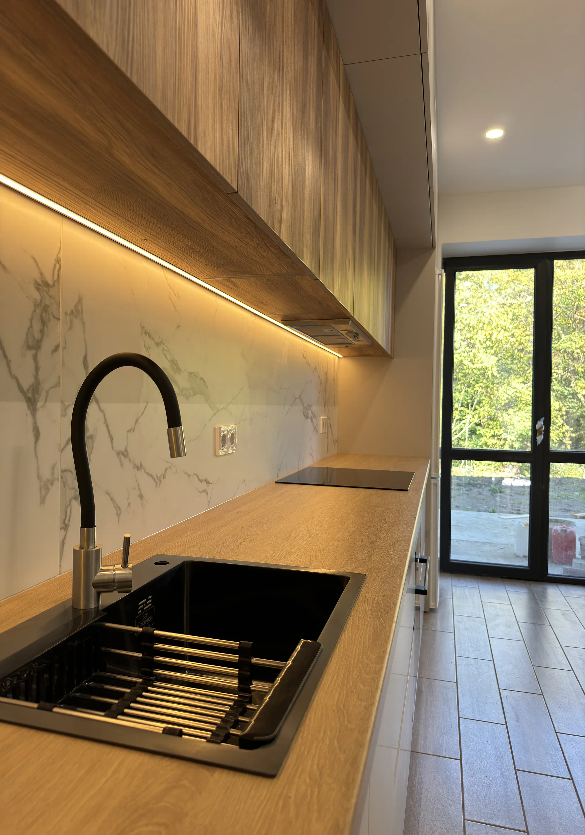 Кухня для котеджу має виглядати цілісно, спокійно й дорого, але водночас бути зручною в щоденному житті. У цьому проєкті головний акцент зроблено на двоярусну композицію до самої стелі, стриману сучасну подачу та продумане наповнення, яке добре працює в просторі приватного будинку.