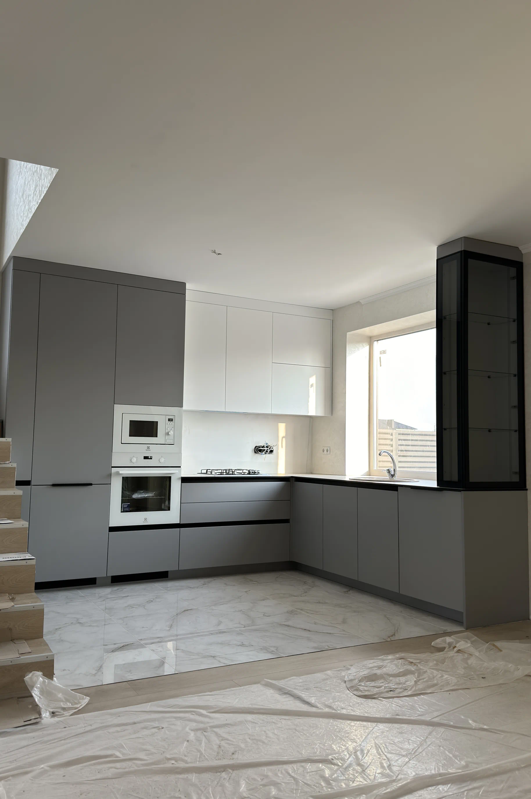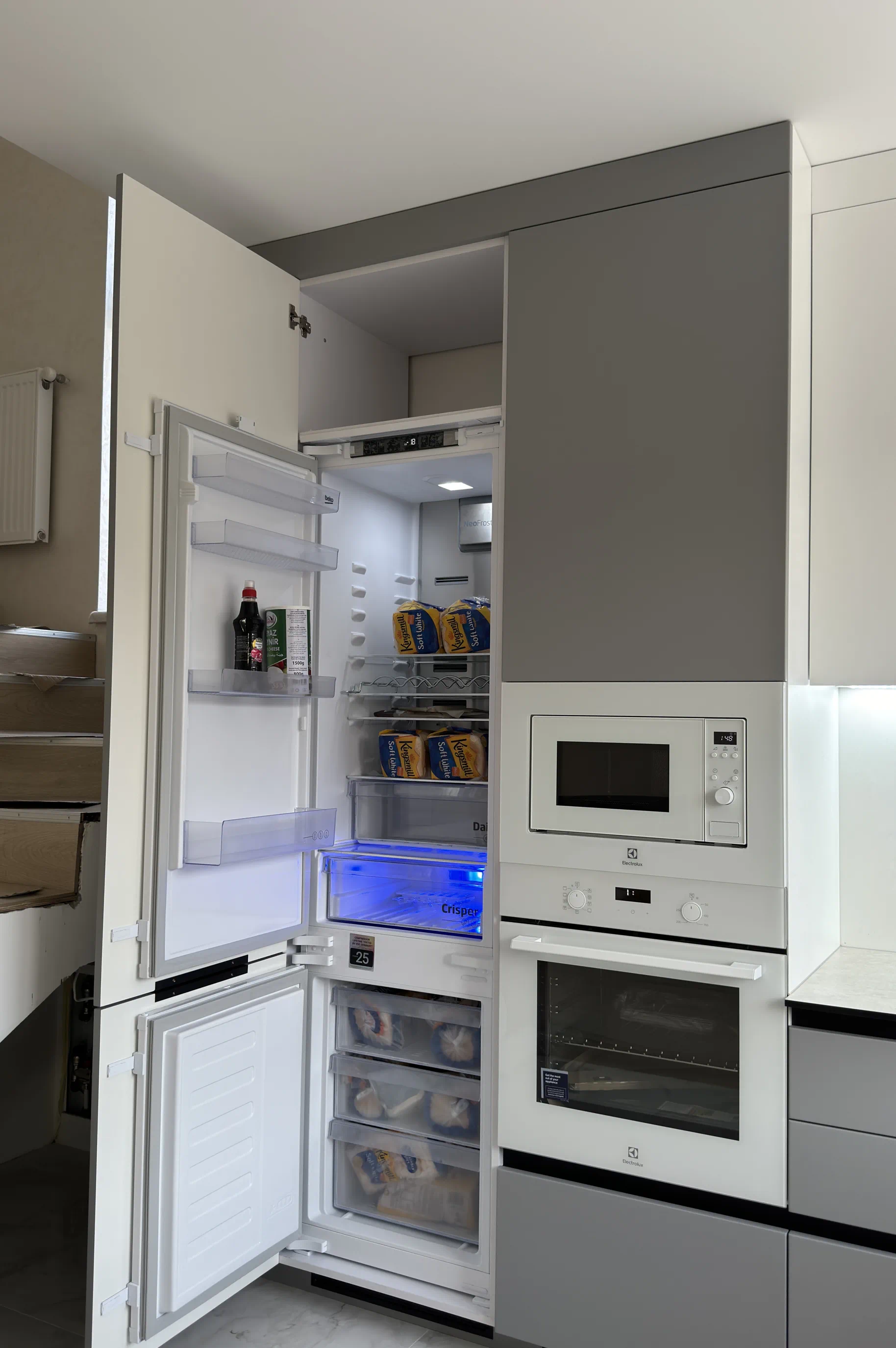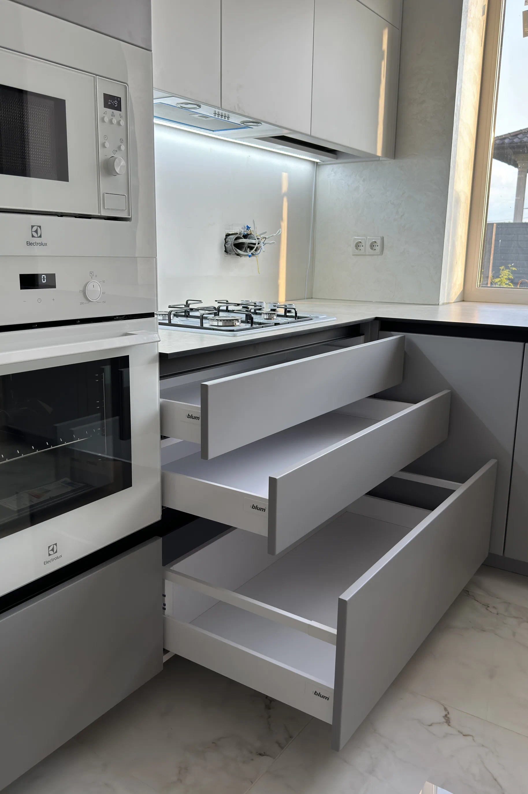Фурнітура Blum забезпечує плавне відкривання та закривання шухляд і дверцят, а вбудована техніка дозволяє зберегти акуратний та цілісний дизайн кухонного простору.