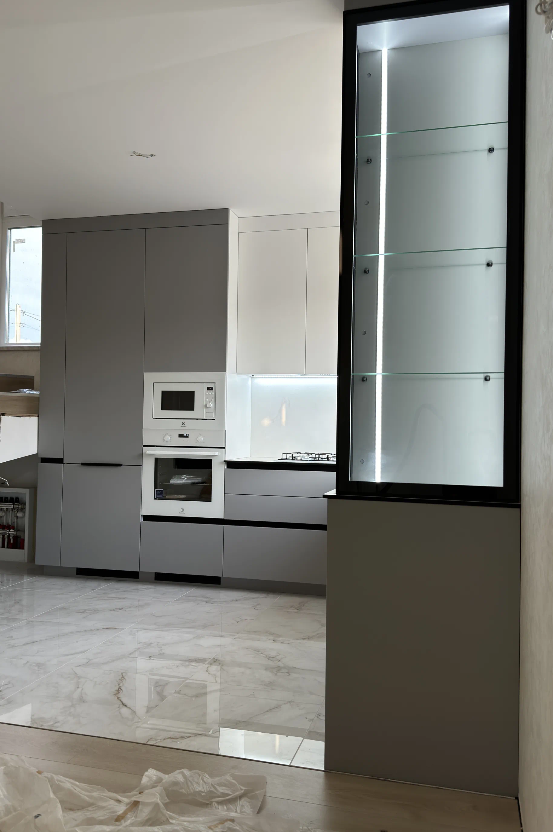 Особливістю цієї кухні є скляна вітрина з LED-підсвіткою, яка додає інтер’єру легкості та підкреслює декоративні елементи кухні.