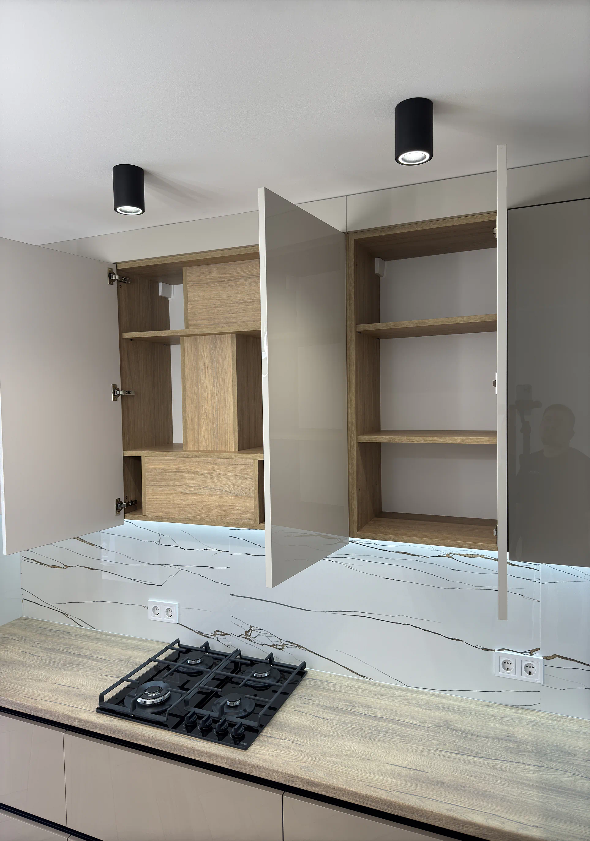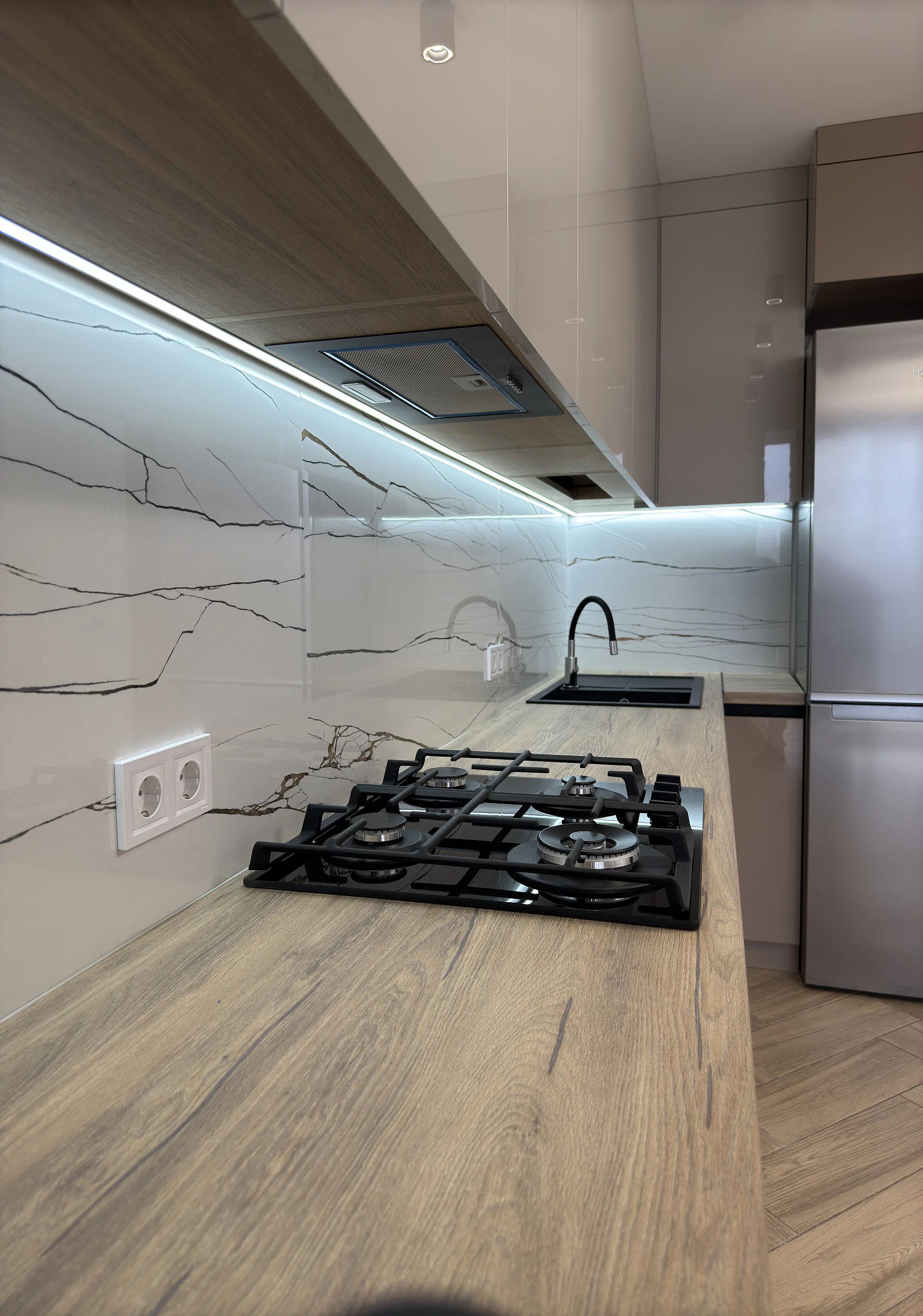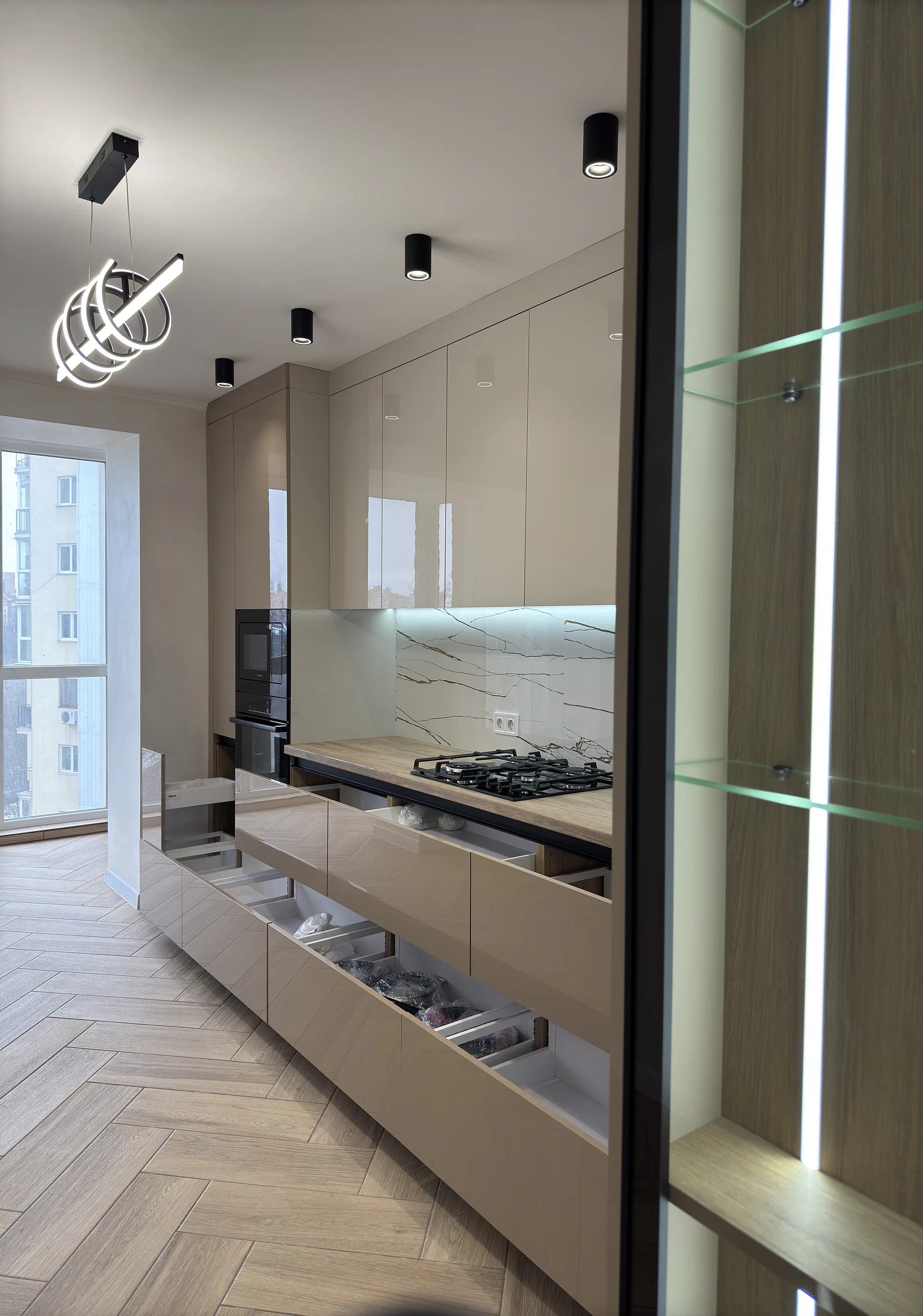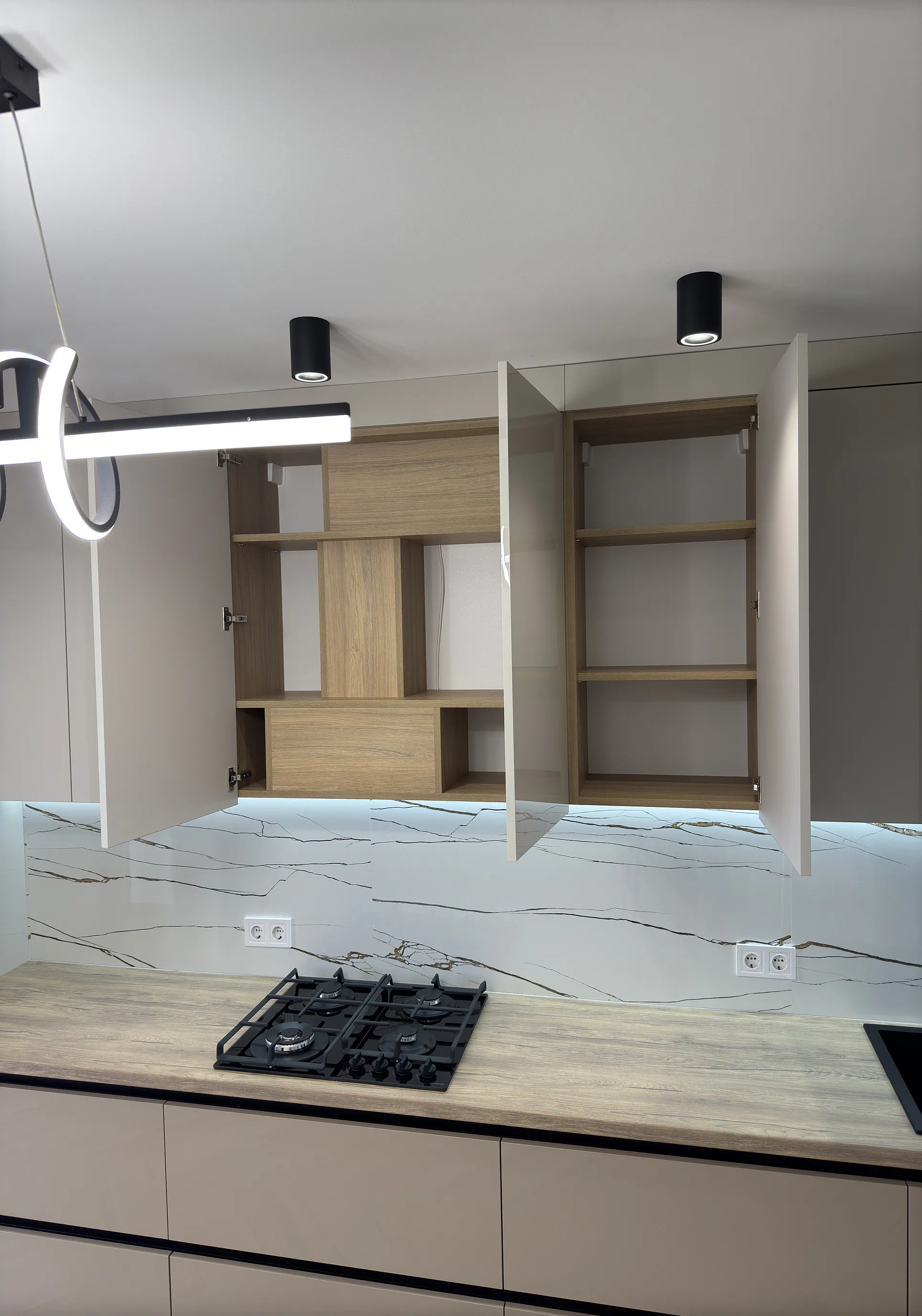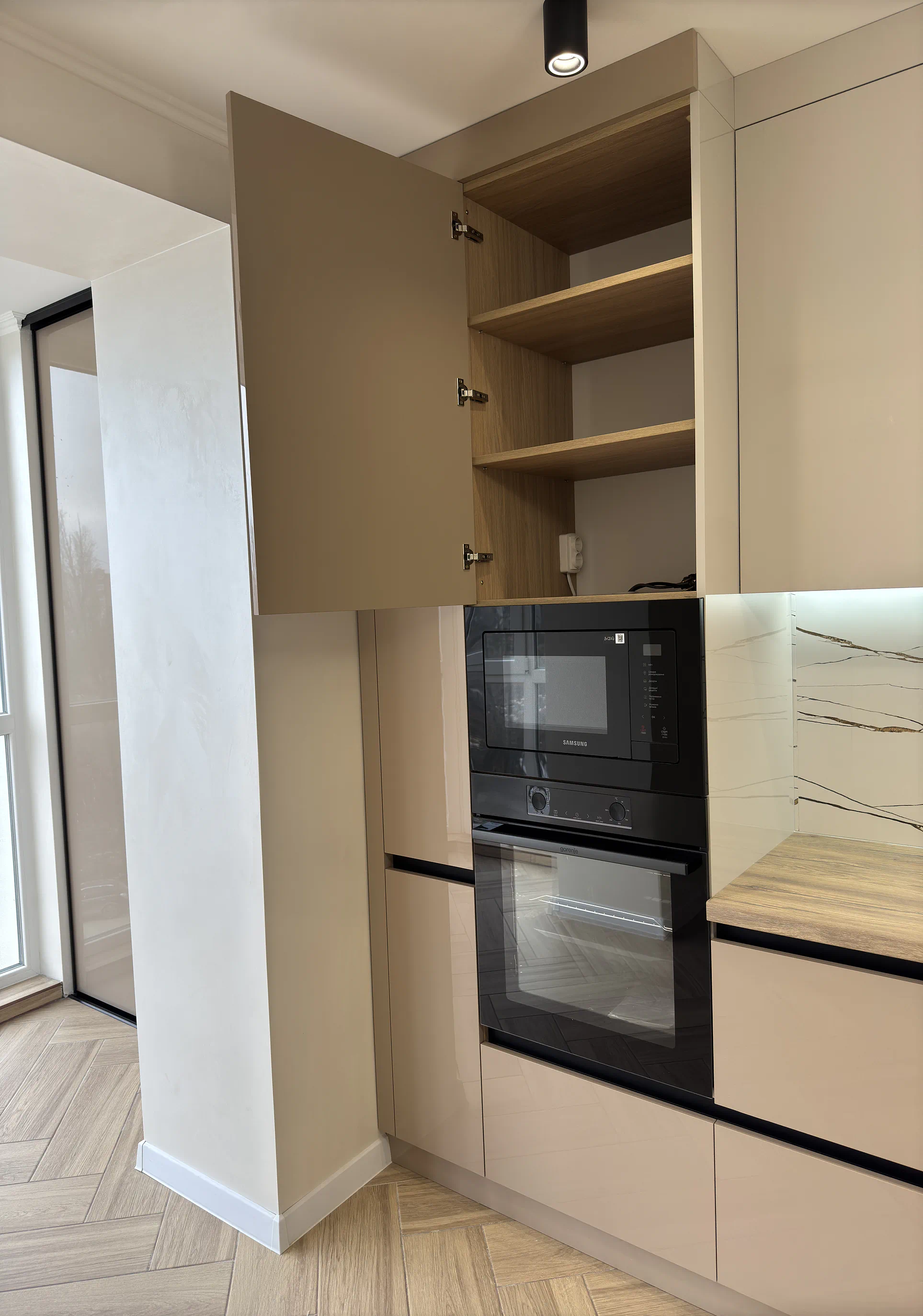 Окрему роль у цьому проєкті відіграє продумане наповнення. Фурнітура Blum, шухляди TANDEMBOX Antaro, завіси з дотягом, висувне карго, ручка-профіль Gola та LED-підсвічування робочої зони роблять кухню зручною й комфортною в користуванні щодня.