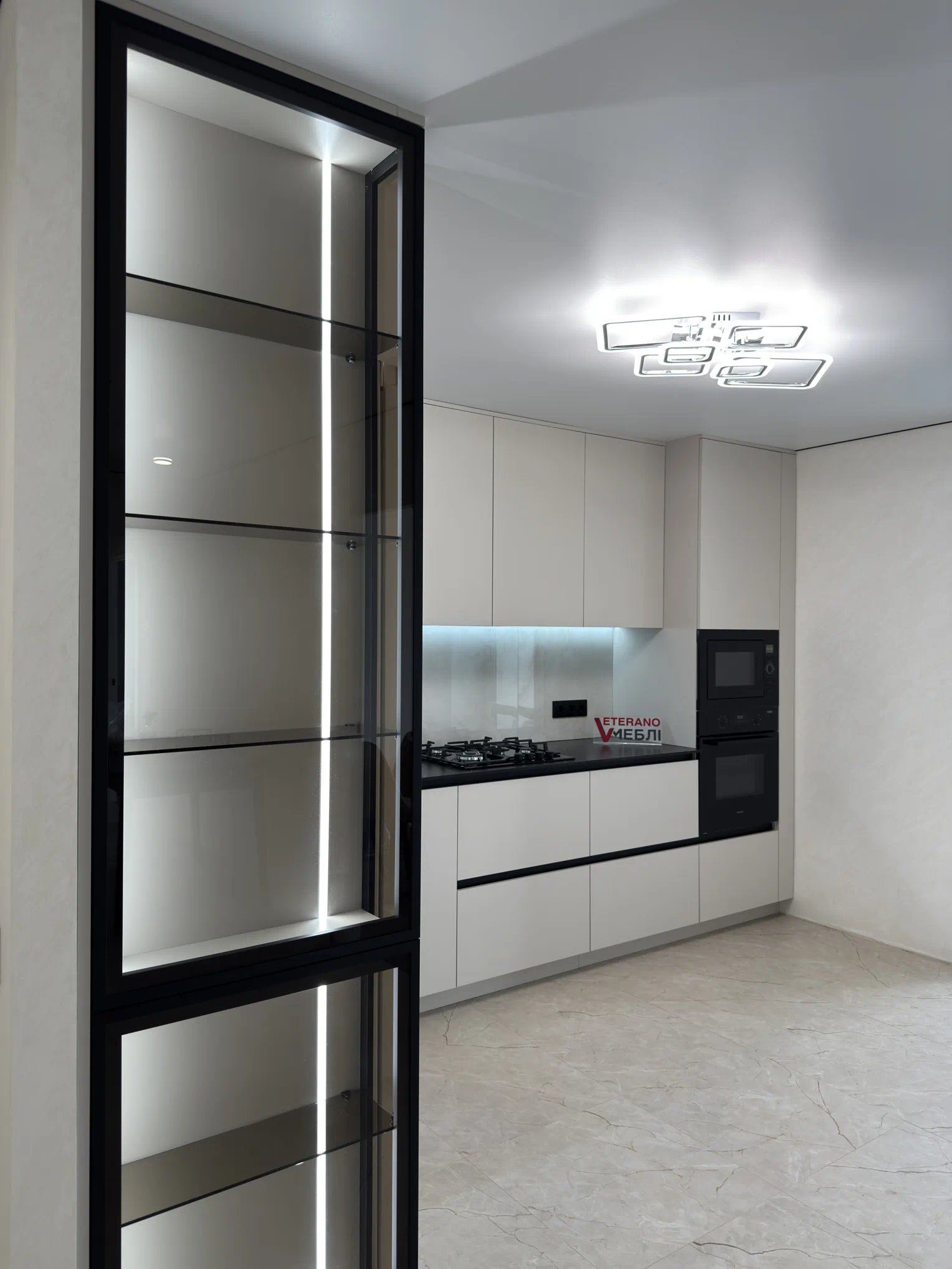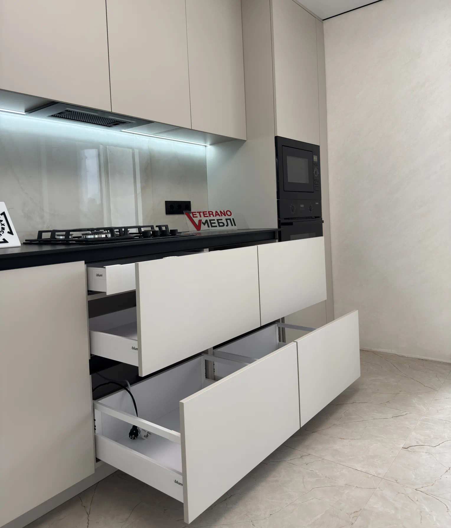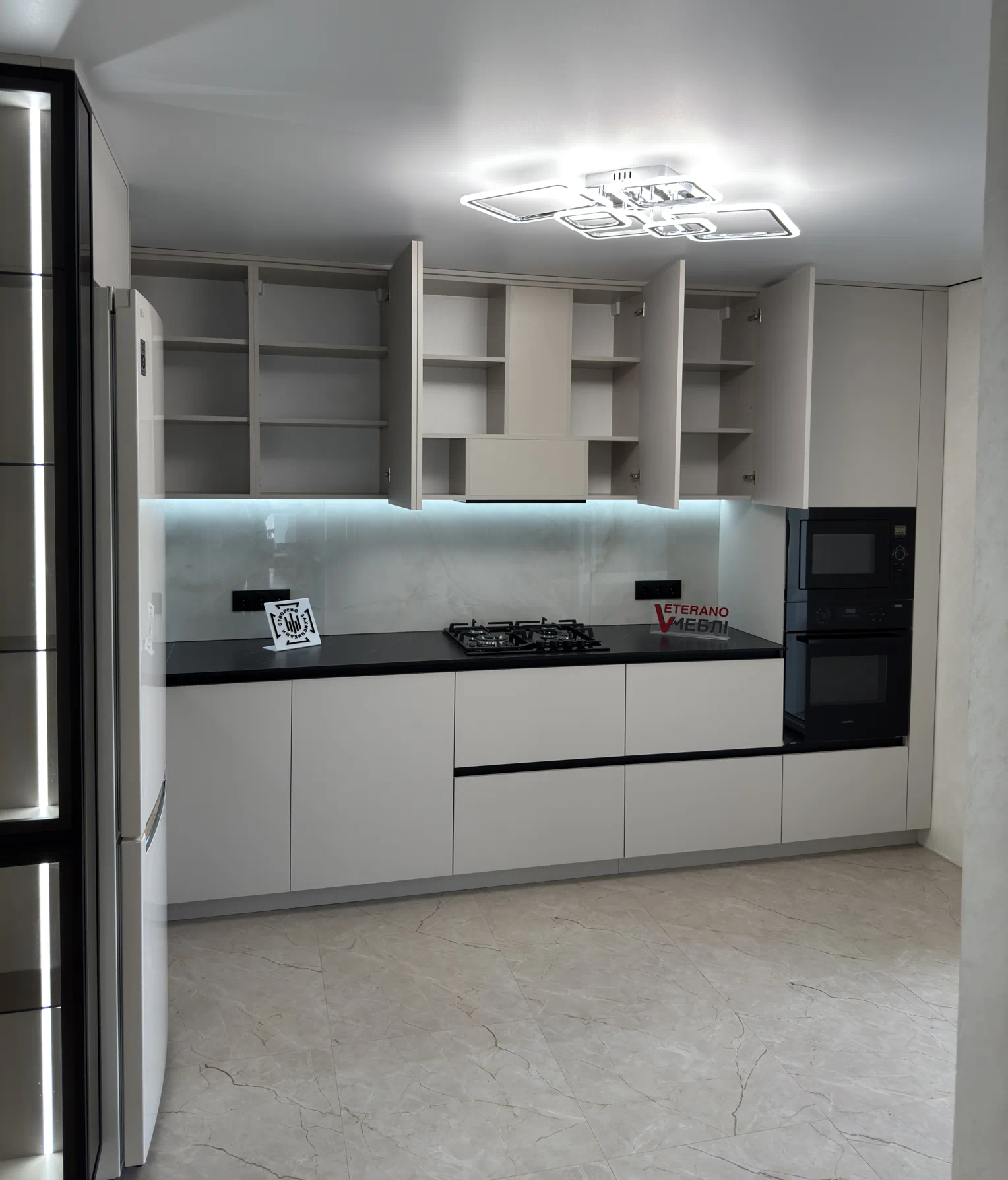 У цій сучасній кухні на замовлення використані акрилові фасади LuxeForm, які формують рівну сучасну поверхню та добре підходять для інтер’єрів у сучасному стилі. Стільниця з HPL компакт-плити 12 мм відзначається вологостійкістю, міцністю та практичністю у щоденному користуванні. Фурнітура Blum забезпечує плавне відкривання шухляд і дверцят, а профіль Gola підкреслює лаконічний вигляд кухні без класичних ручок. Додаткову функціональність у цьому проєкті забезпечують мийка нижнього монтажу, повновбудована витяжка, скляна вітрина з LED-підсвіткою та підсвітка робочої зони. Усе це формує кухню, де поєднані дизайн, комфорт і продумане наповнення.