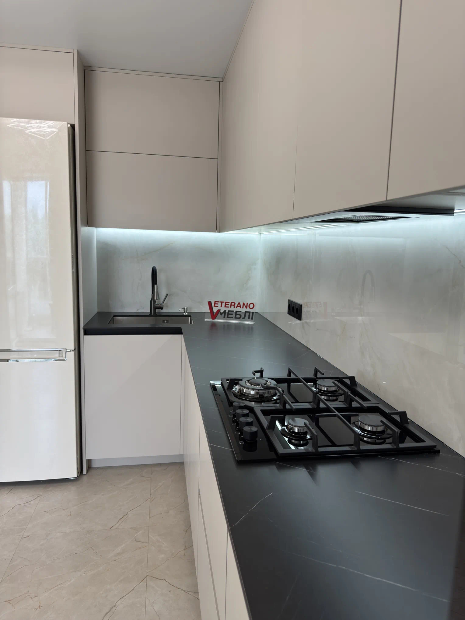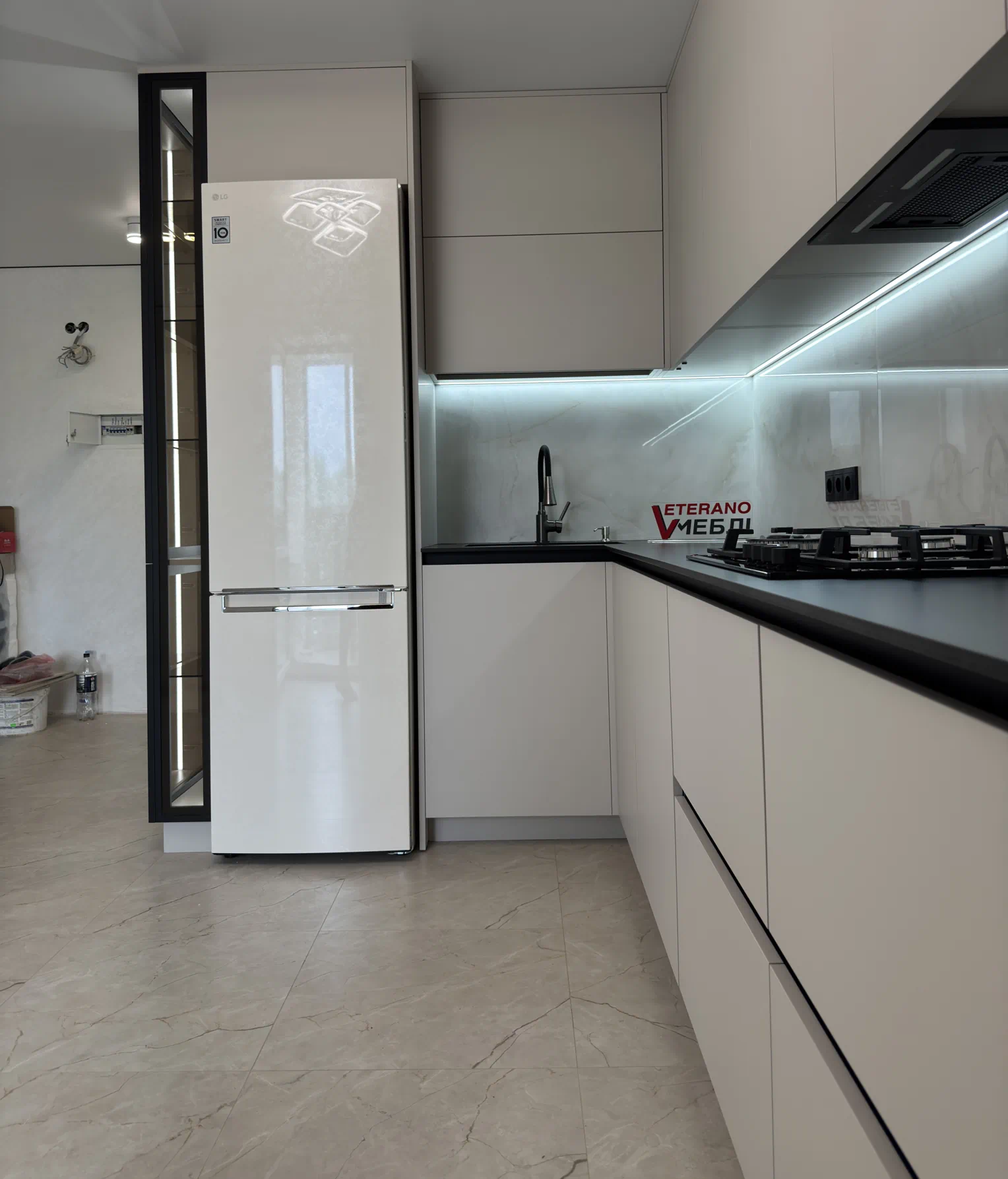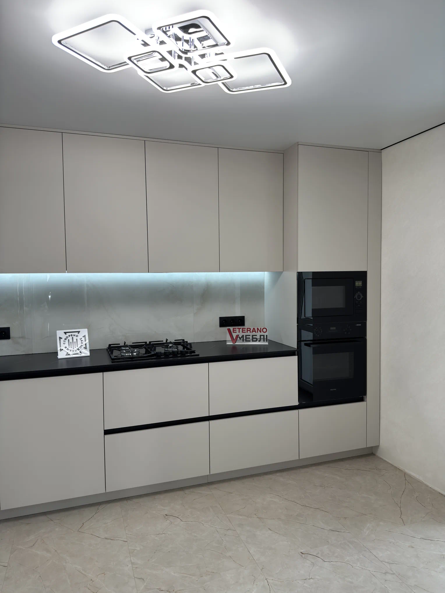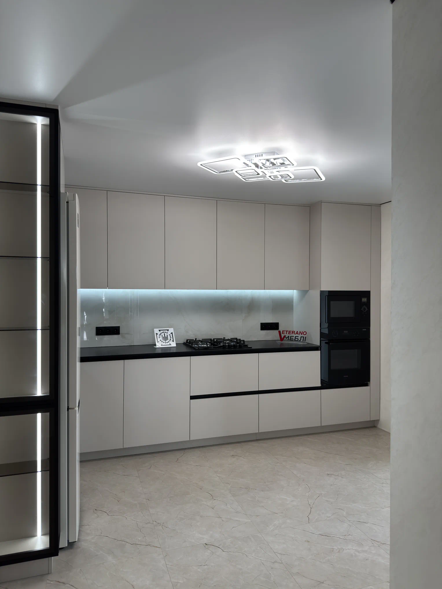 У цій сучасній кухні на замовлення використані акрилові фасади LuxeForm, які формують рівну сучасну поверхню та добре підходять для інтер’єрів у сучасному стилі. Стільниця з HPL компакт-плити 12 мм відзначається вологостійкістю, міцністю та практичністю у щоденному користуванні. Фурнітура Blum забезпечує плавне відкривання шухляд і дверцят, а профіль Gola підкреслює лаконічний вигляд кухні без класичних ручок. Додаткову функціональність у цьому проєкті забезпечують мийка нижнього монтажу, повновбудована витяжка, скляна вітрина з LED-підсвіткою та підсвітка робочої зони. Усе це формує кухню, де поєднані дизайн, комфорт і продумане наповнення.