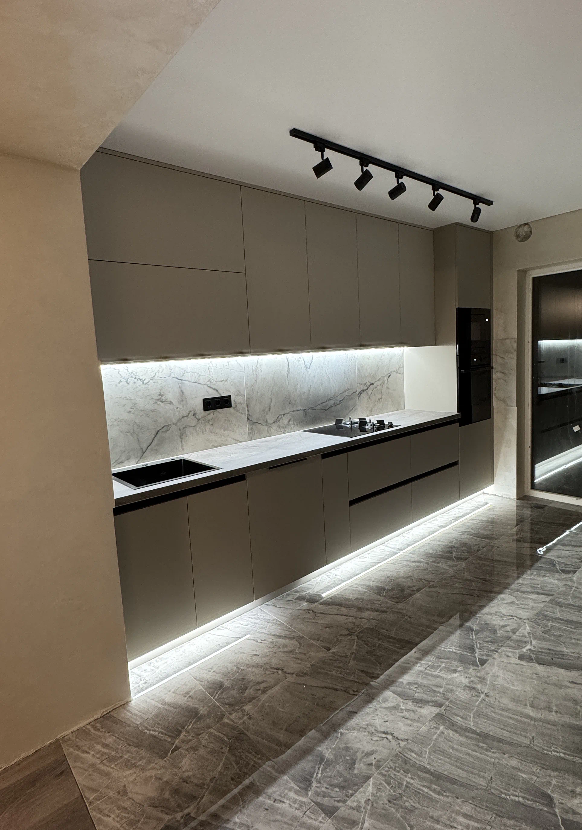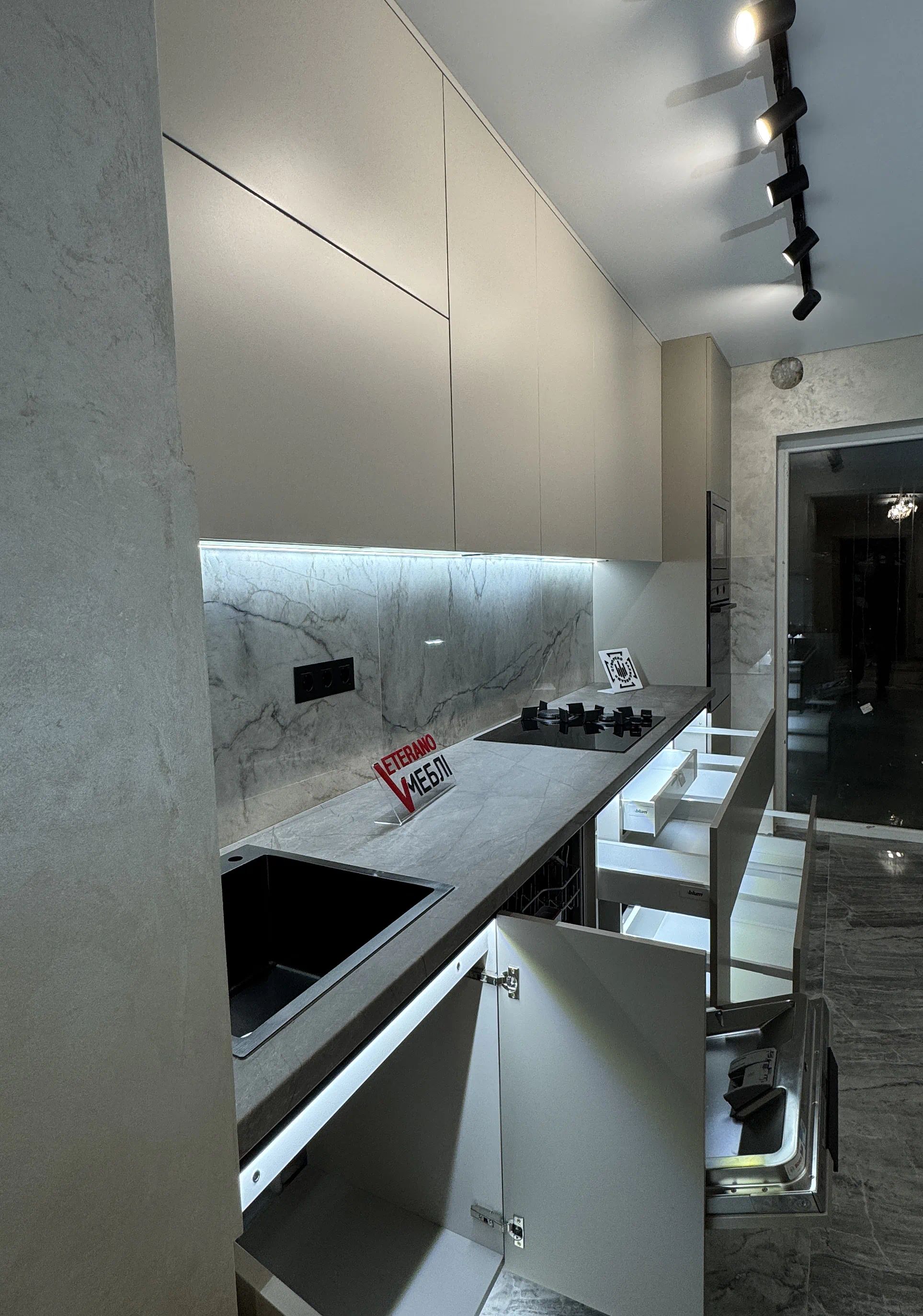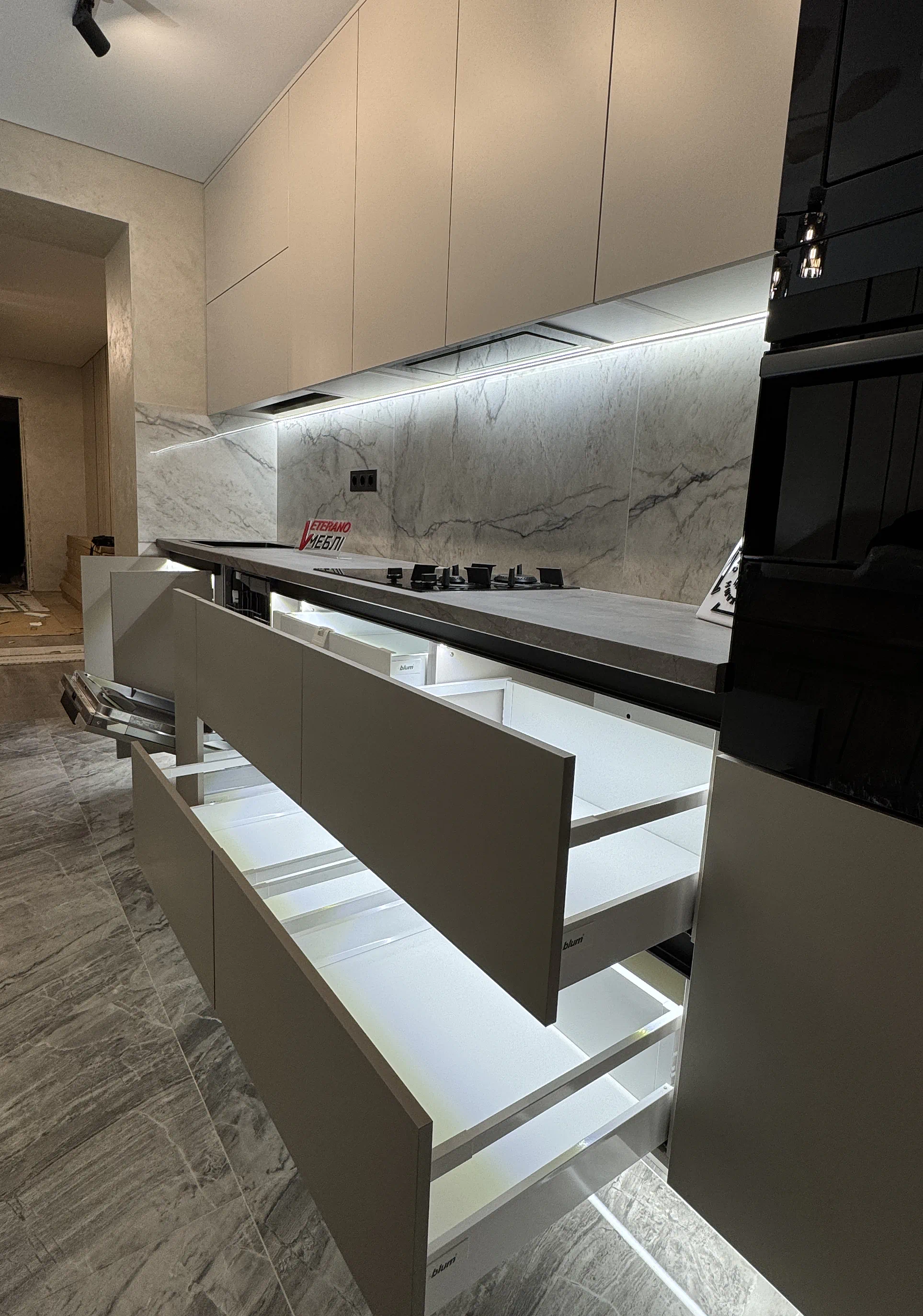 У цьому проєкті кухня виконана у сучасному стилі з використанням якісних матеріалів та надійної фурнітури. Фурнітура Blum забезпечує плавну та довговічну роботу механізмів, а фасади AGT Supramat мають приємну матову текстуру та сучасний вигляд. Особливу атмосферу створює LED-підсвітка у шухлядах та цоколі — вона виглядає ефектно і робить користування кухнею значно зручнішим у вечірній час.