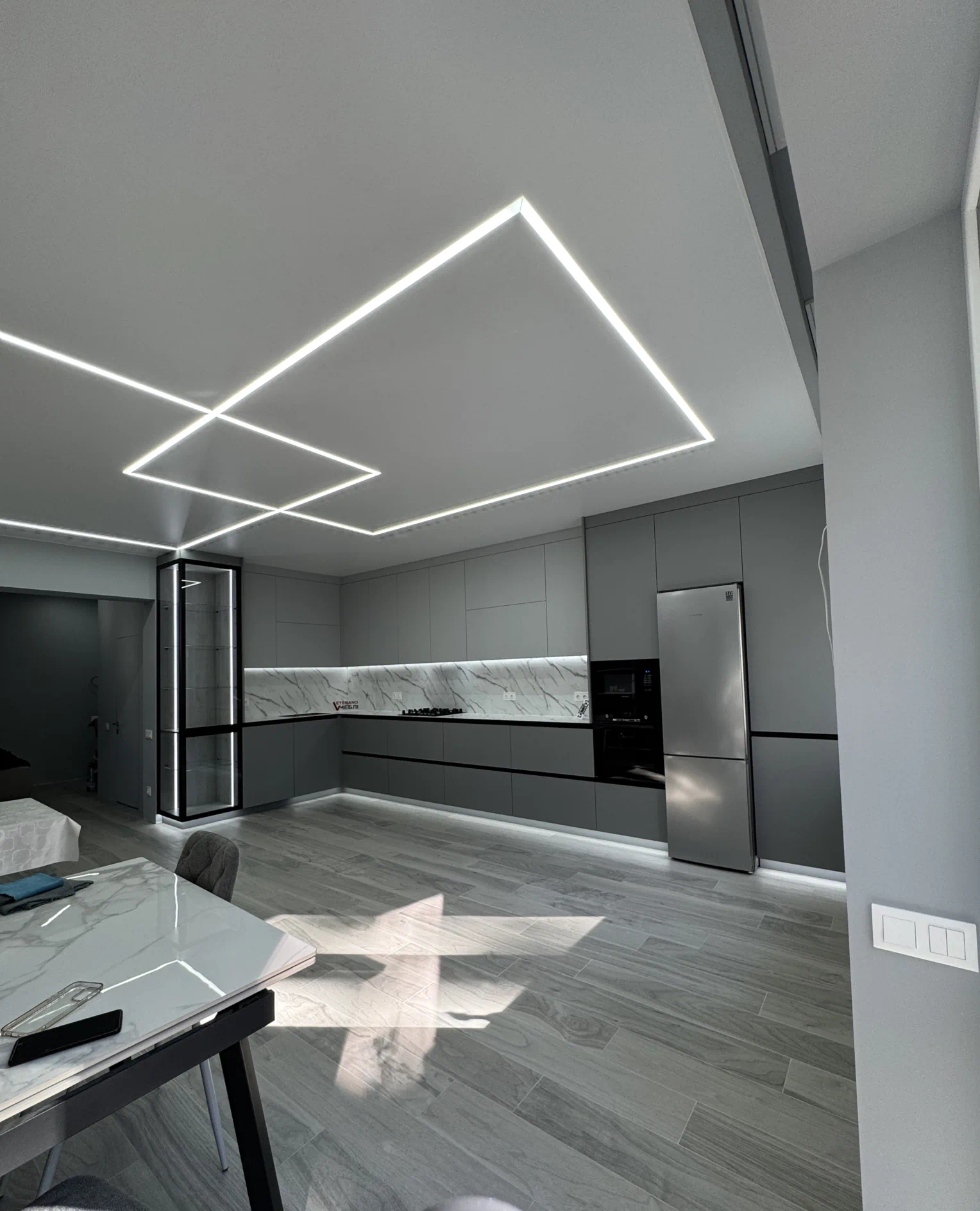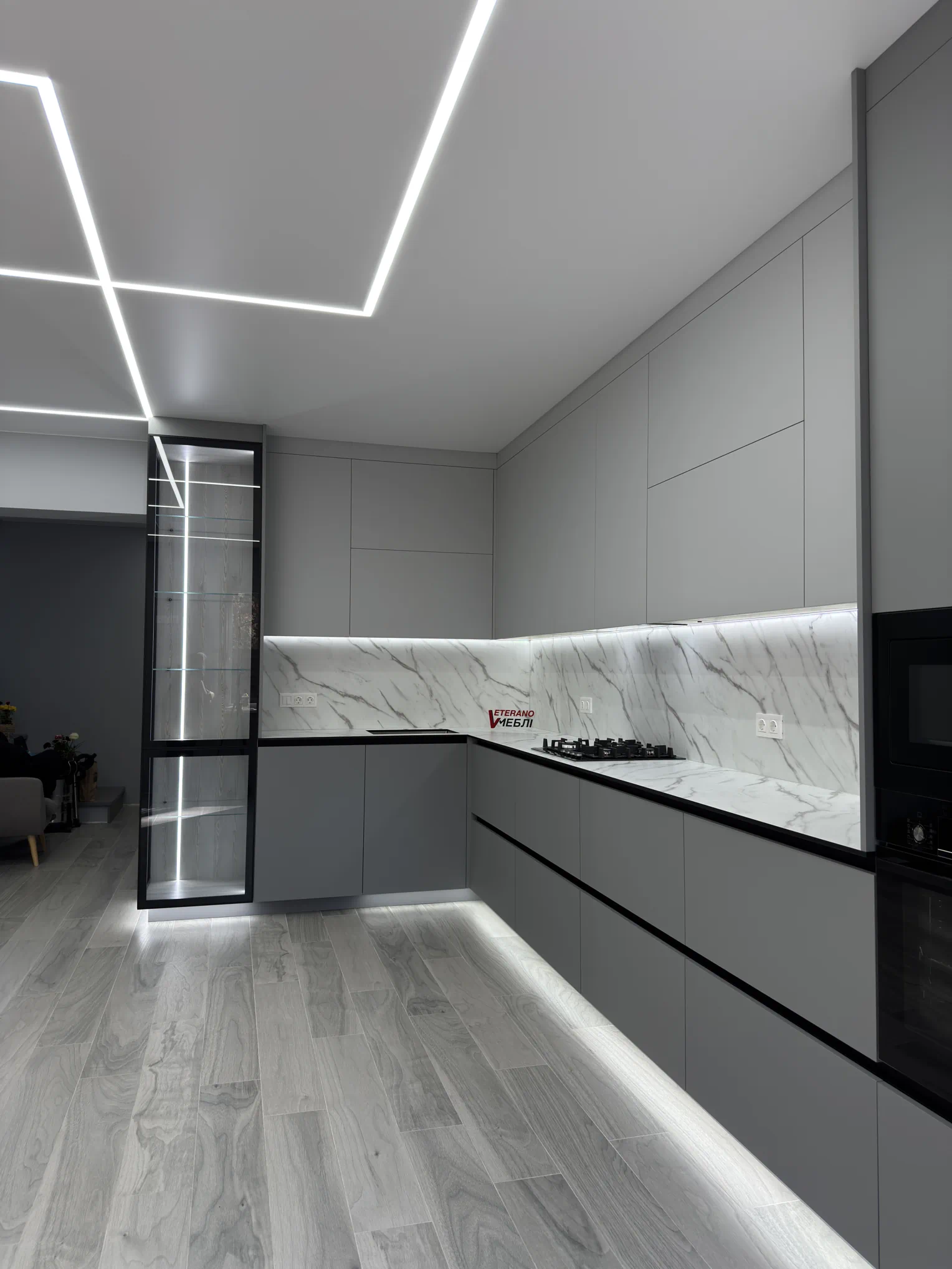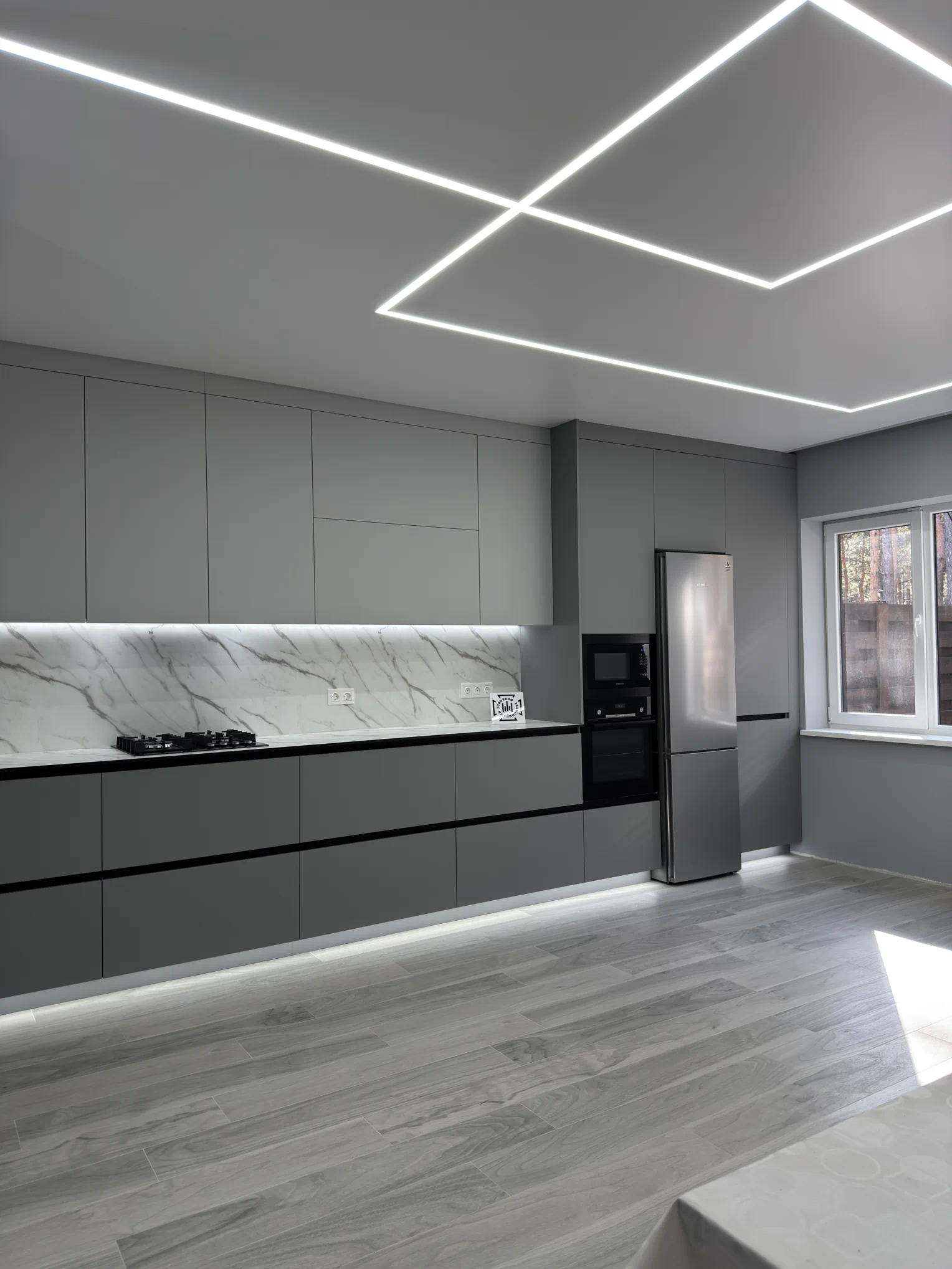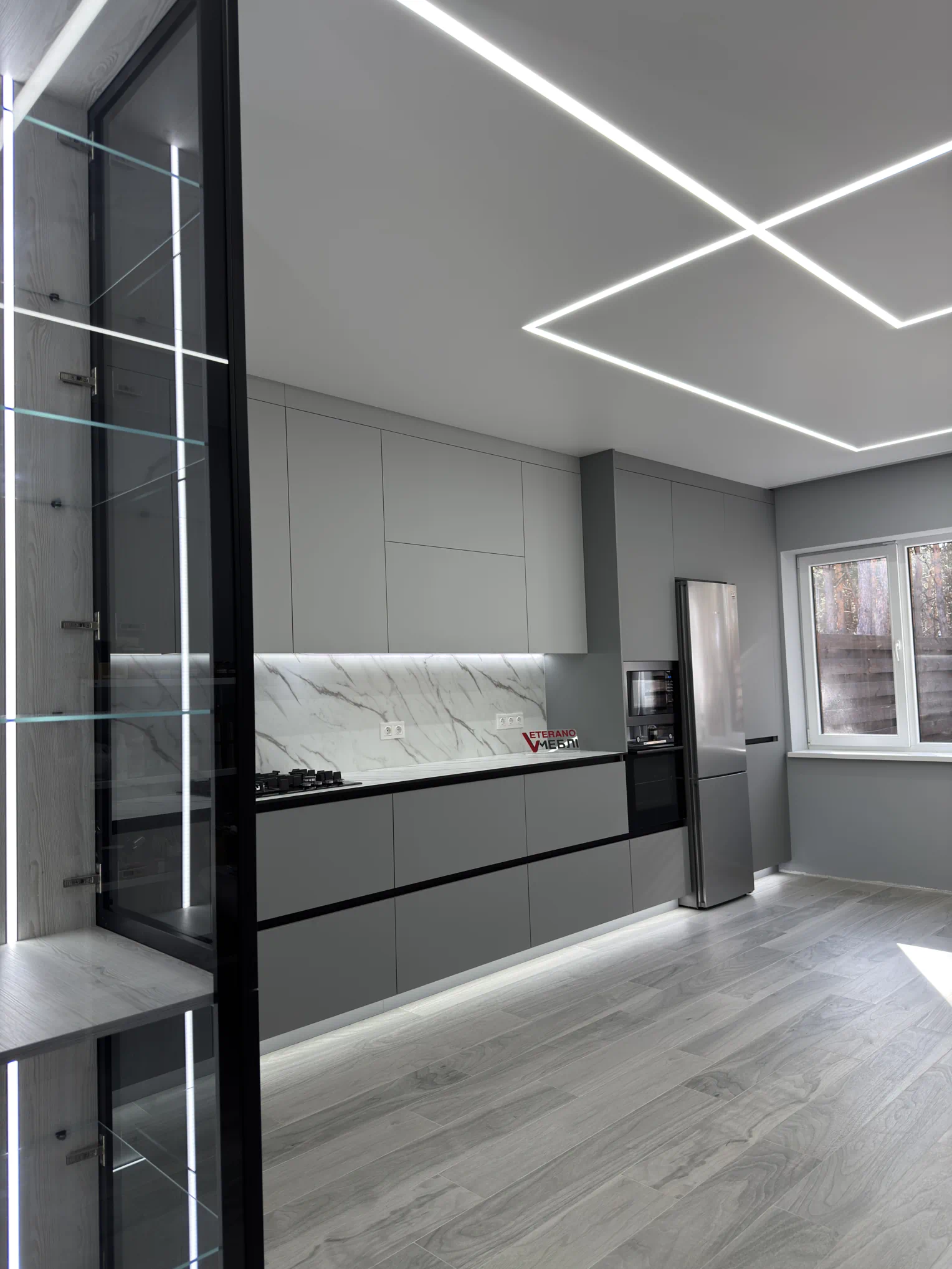 У цьому проєкті реалізована сучасна кухня на замовлення для таунхауса. Кухня виготовлена за індивідуальними розмірами з урахуванням планування приміщення, розташування техніки та побажань власниці.