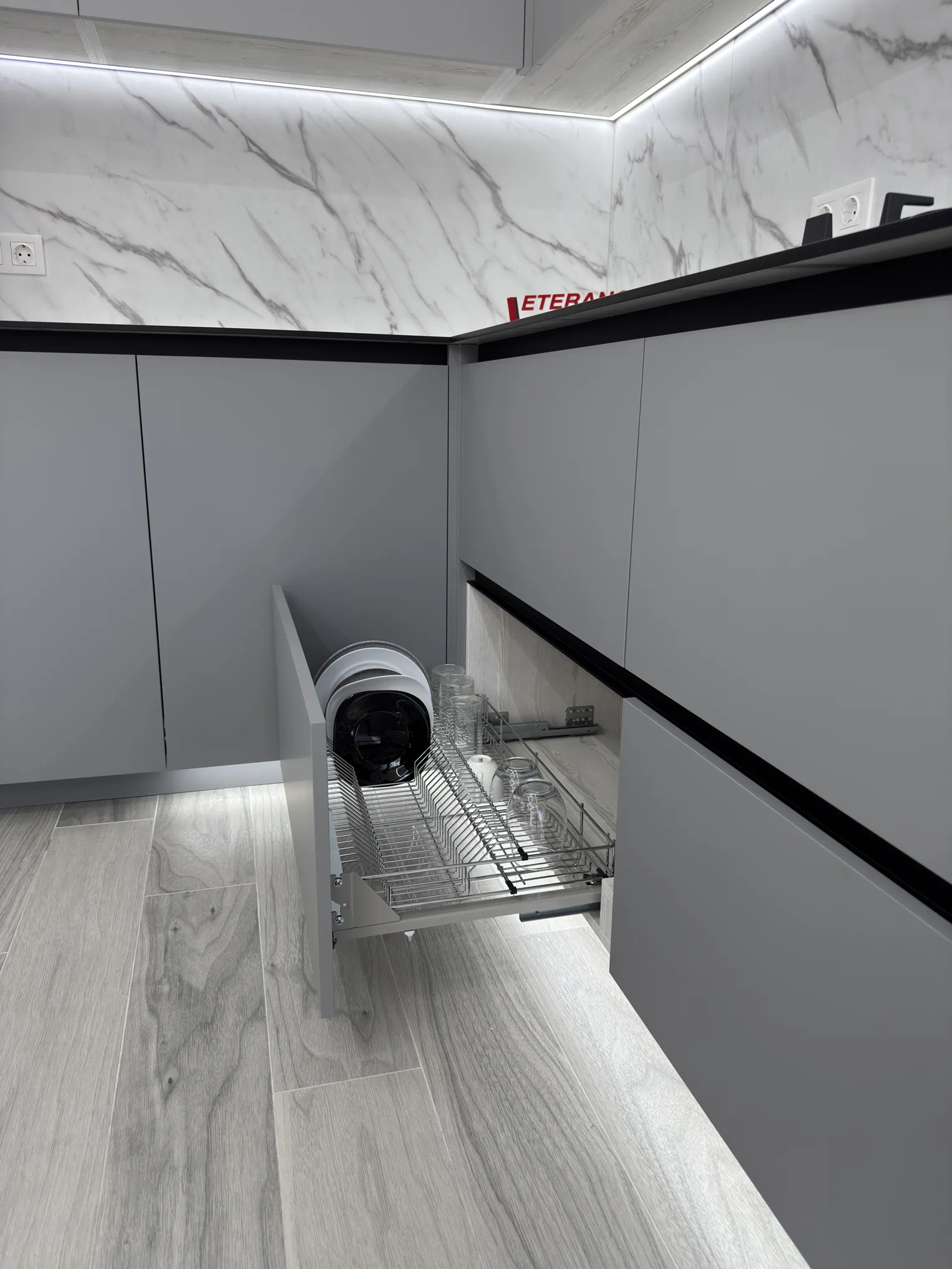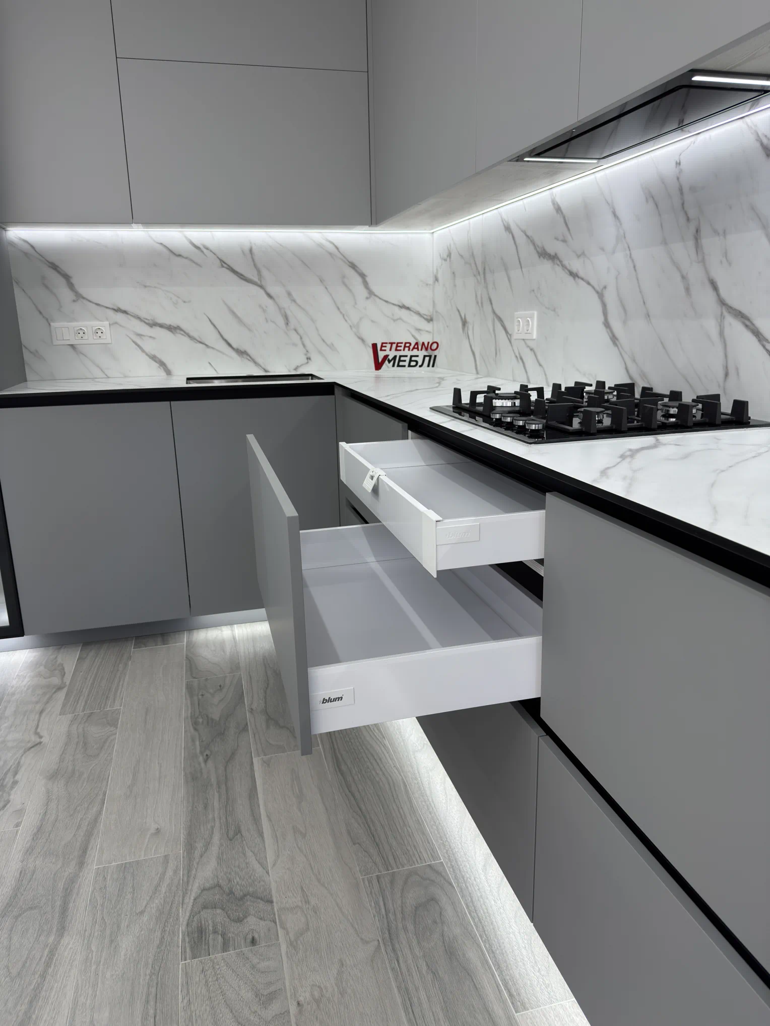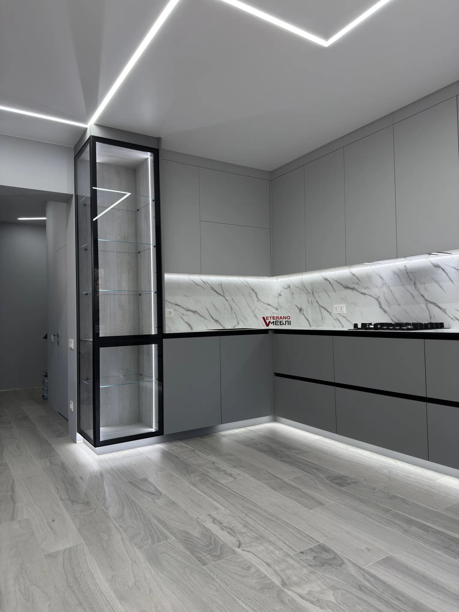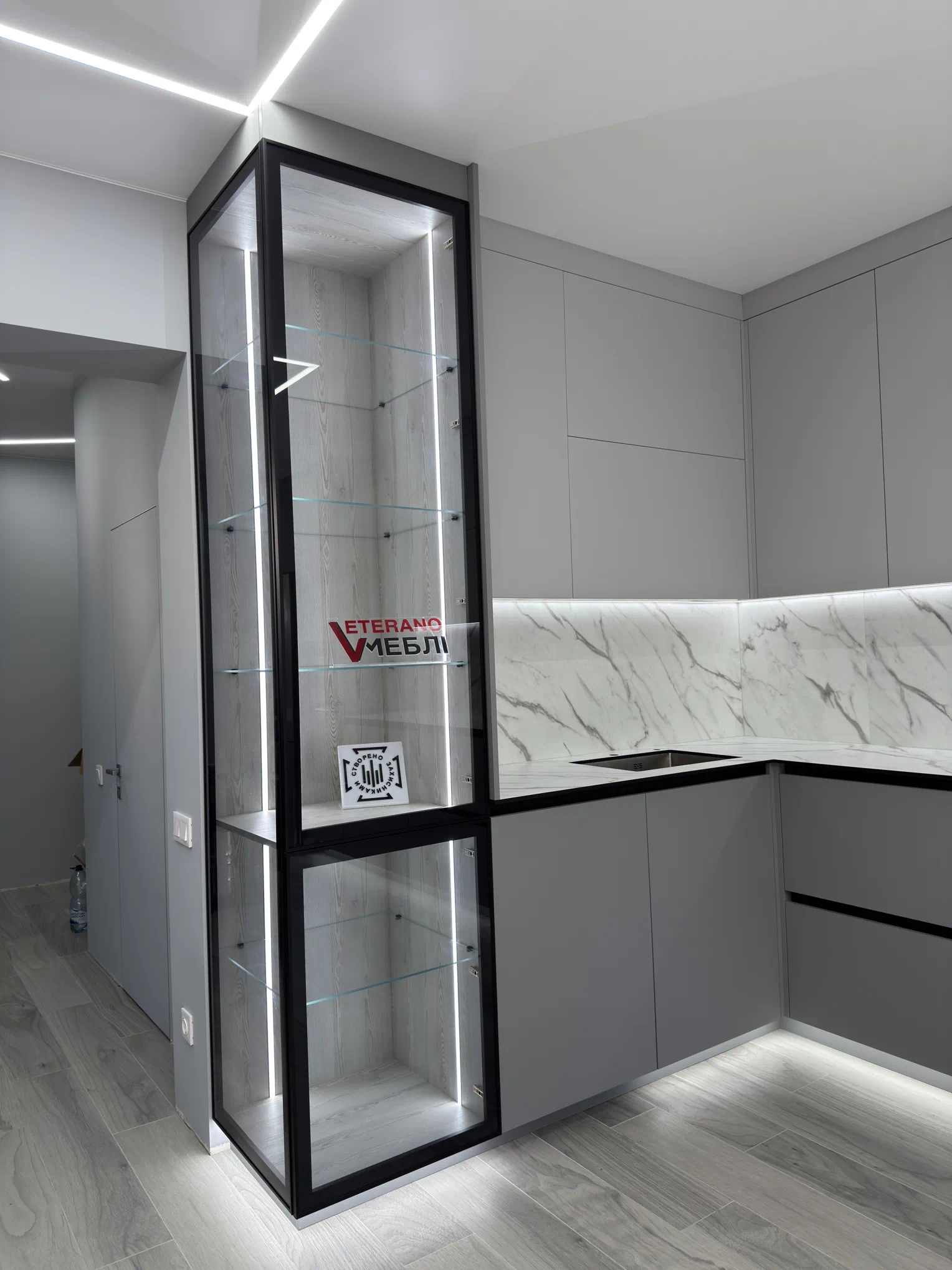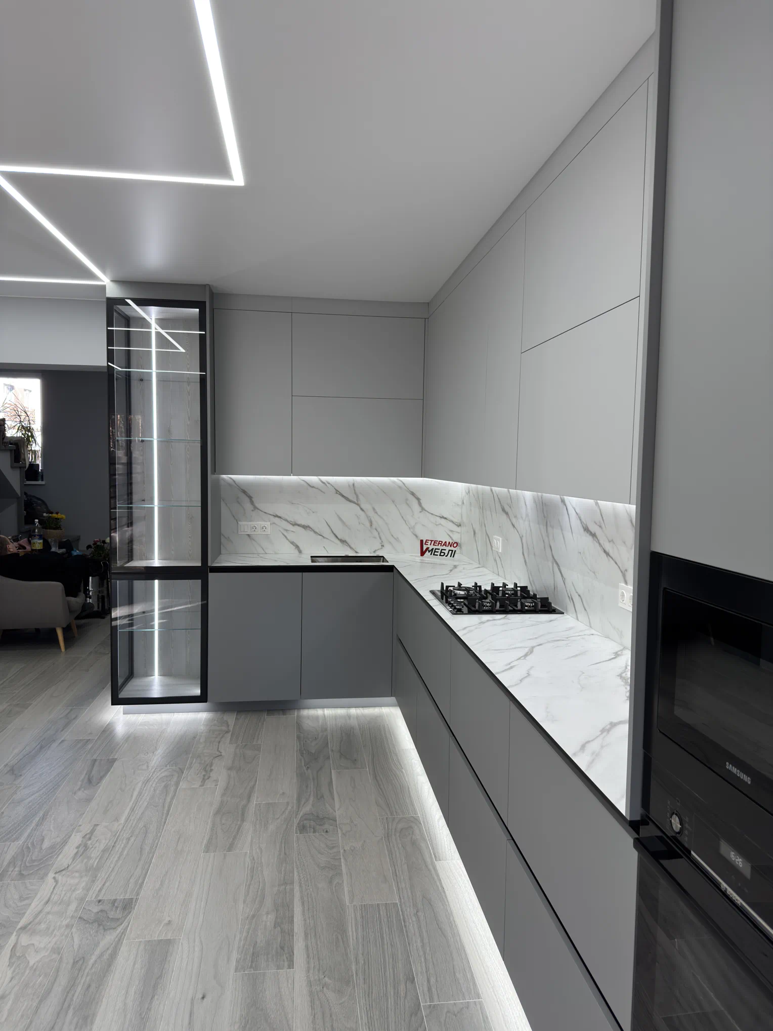 У цьому проєкті використані сучасні матеріали та надійна фурнітура, які добре показують себе у щоденному користуванні. Фасади AGT Supramat мають приємну суперматову поверхню та сучасний вигляд. Стільниця та фартух з HPL компакт-плити відрізняються високою міцністю та вологостійкістю. Фурнітура Blum забезпечує плавне відкривання шухляд та довговічність кухонних механізмів. Особливістю кухні є скляна вітрина з LED-підсвіткою, яка додає кухонному простору легкості та підкреслює декоративні елементи інтер’єру.