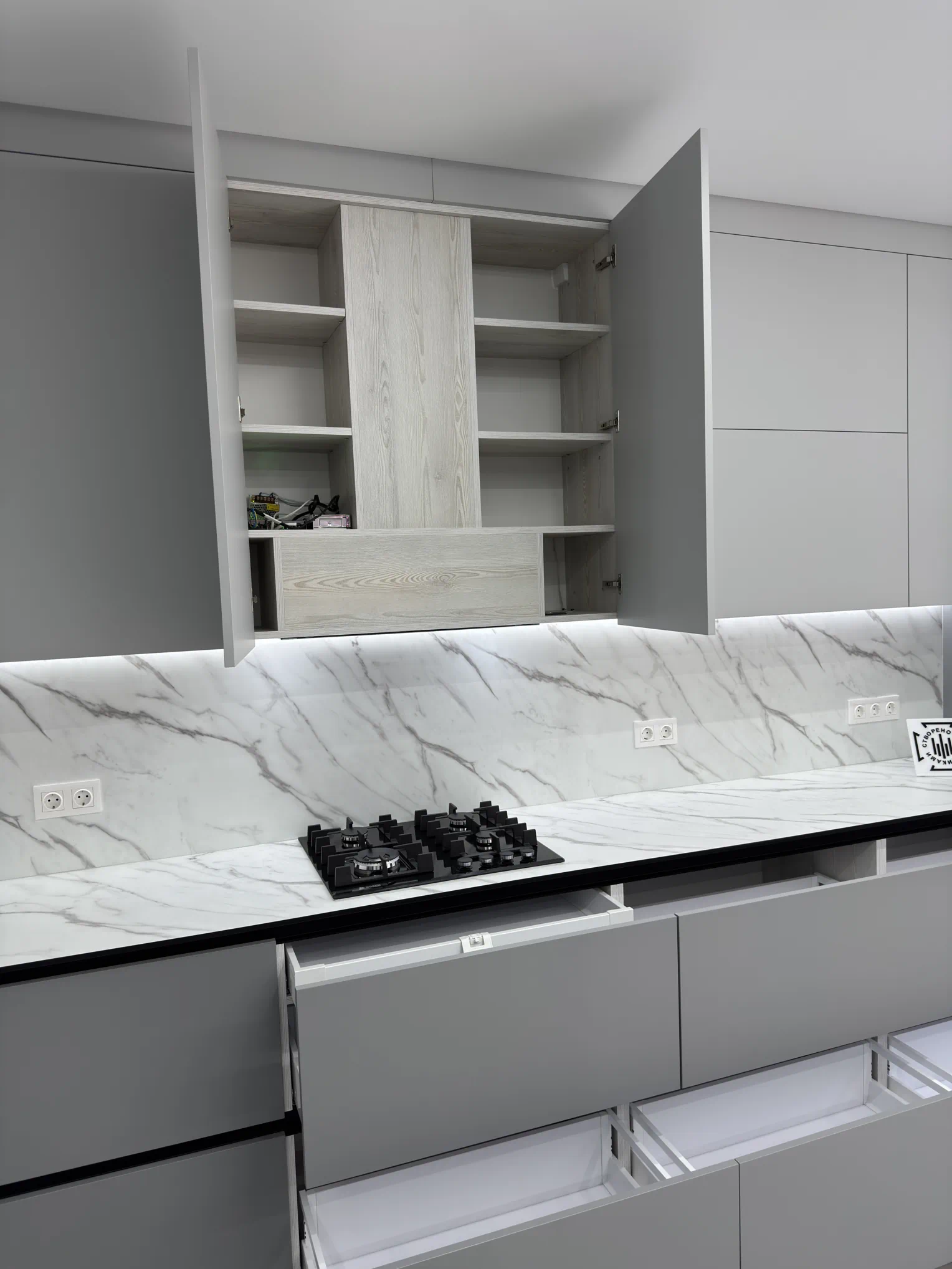 Однією з особливостей цієї кухні є збільшена висота нижніх тумб — 1 метр. Таке рішення забезпечує більш комфортну висоту робочої поверхні та було обране з урахуванням побажань замовниці.