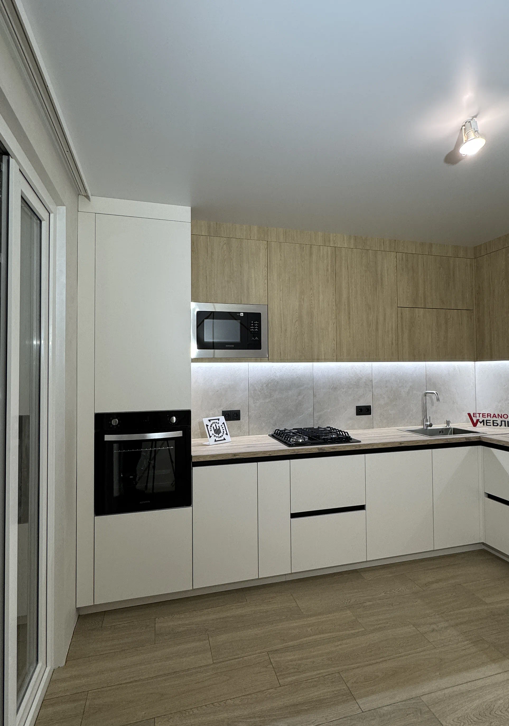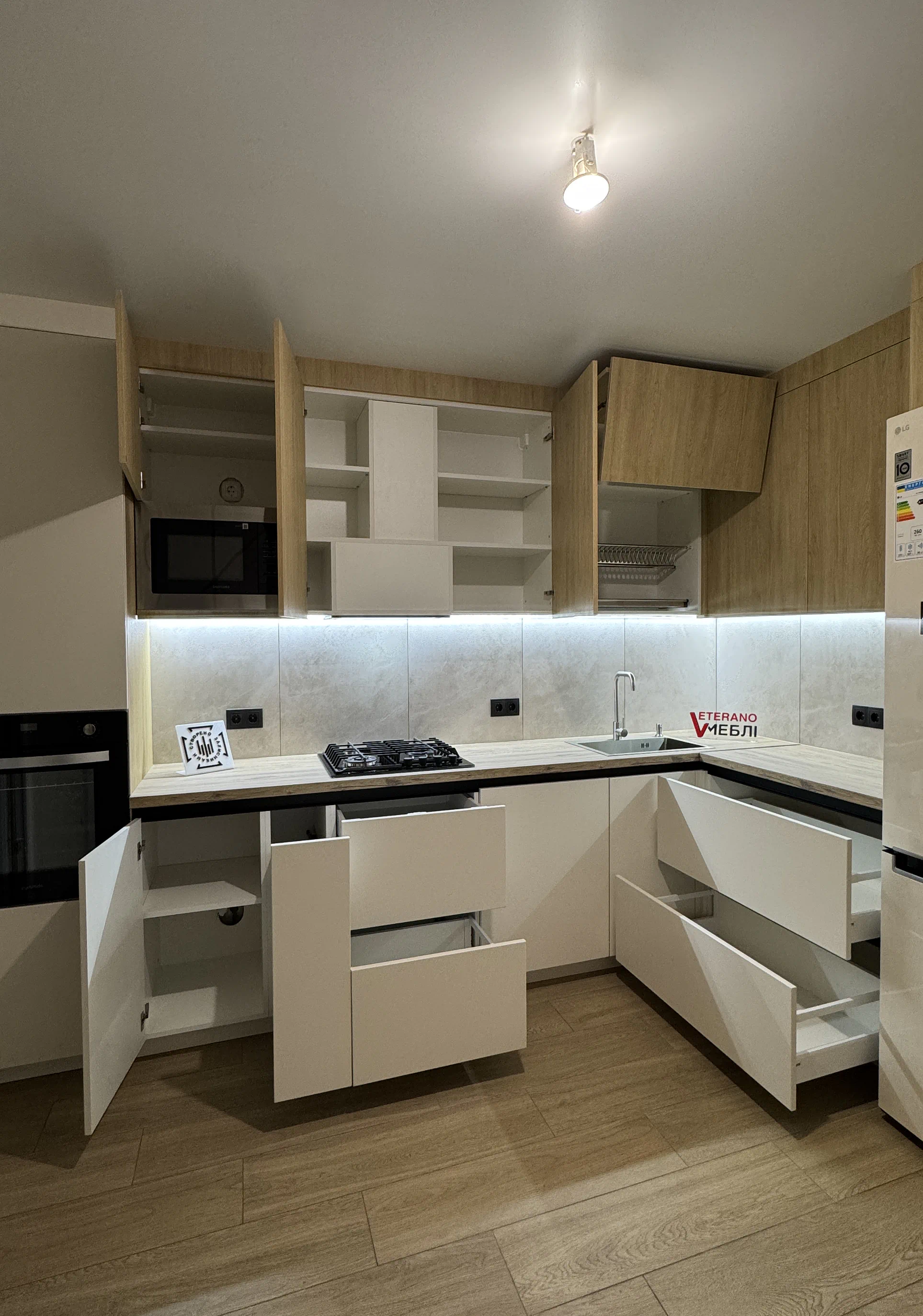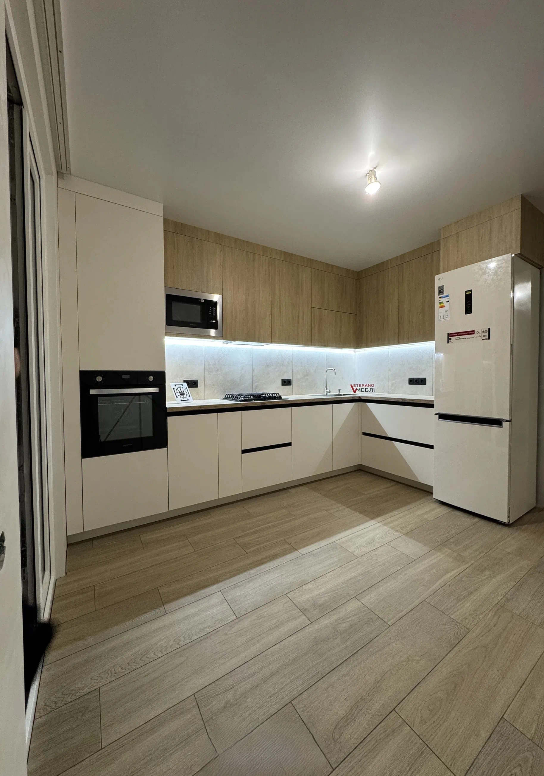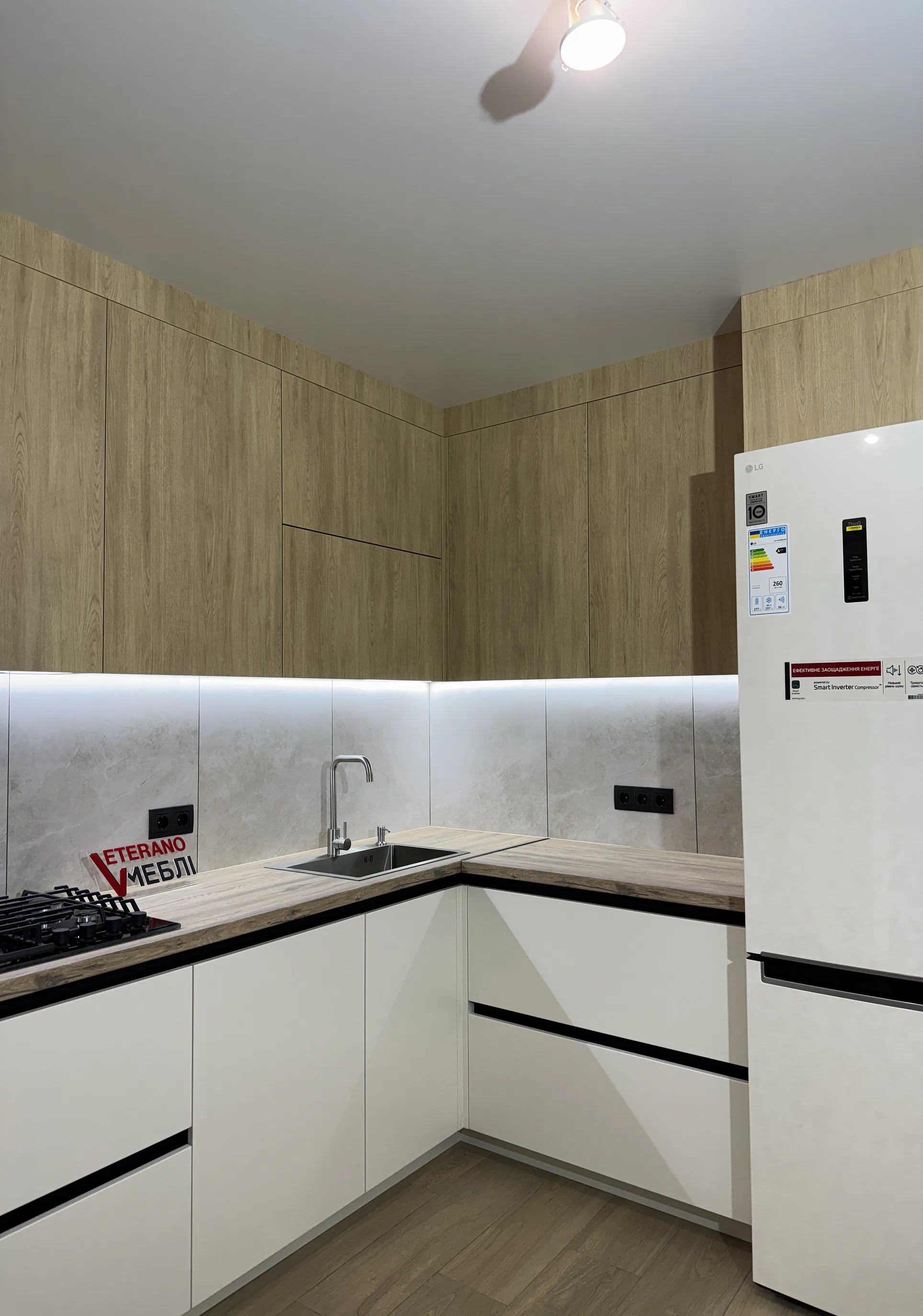 Кутове планування дозволило зручно організувати робочу зону, а високий пенал допоміг компактно вбудувати техніку та зберегти цілісну композицію. Стільниця Kronospan 38 мм добре поєднується з деревним верхом,а LED-підсвітка робочої зони підкреслює фактуру матеріалів і додає комфорту у щоденному користуванні.