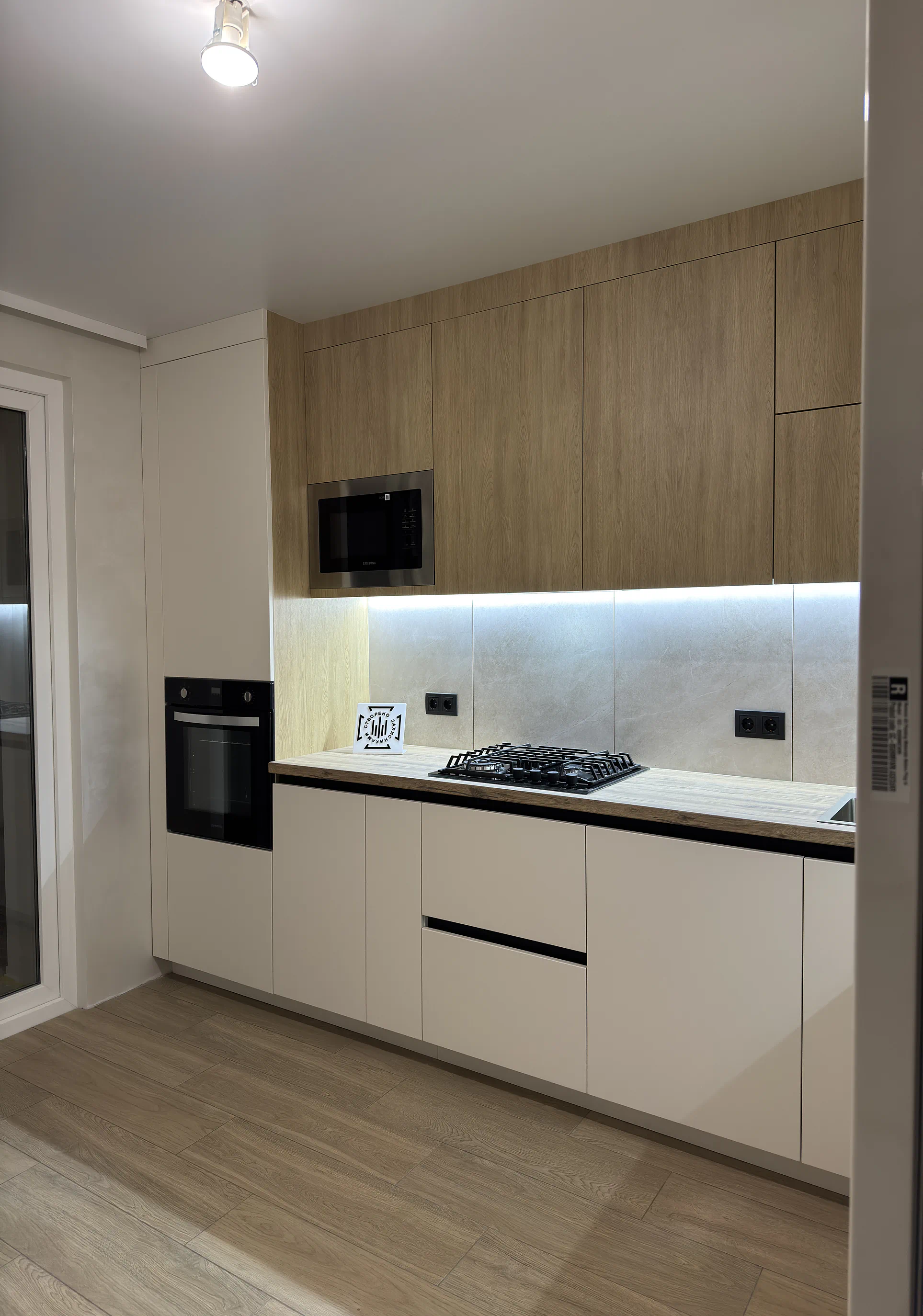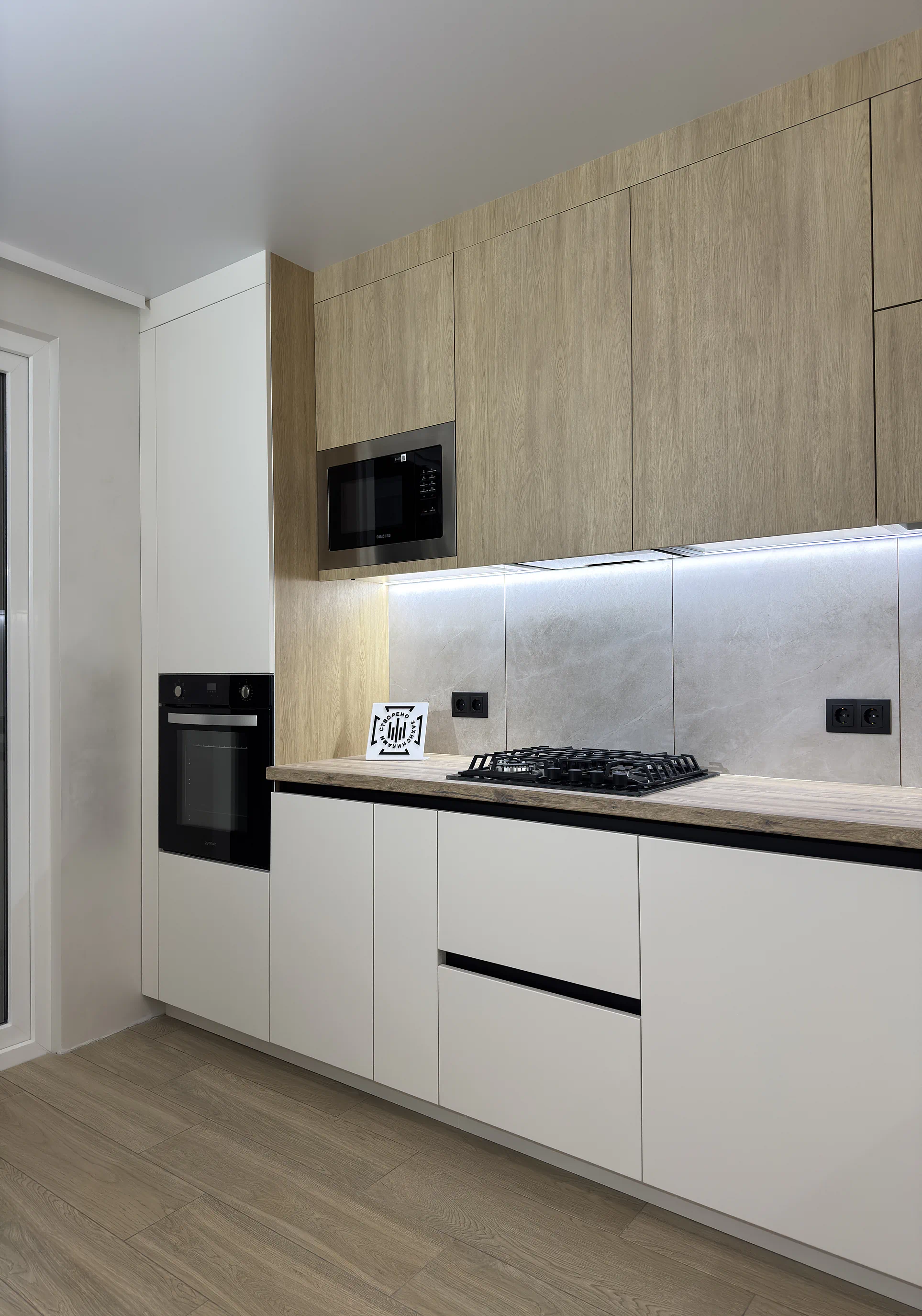 У цій кухні на замовлення поєднані світлий низ, високий пенал із вбудованою технікою та верхні фасади з деревною текстурою. Саме таке рішення робить кухню візуально теплішою, живішою і менш стерильною, ніж повністю однотонні варіанти.