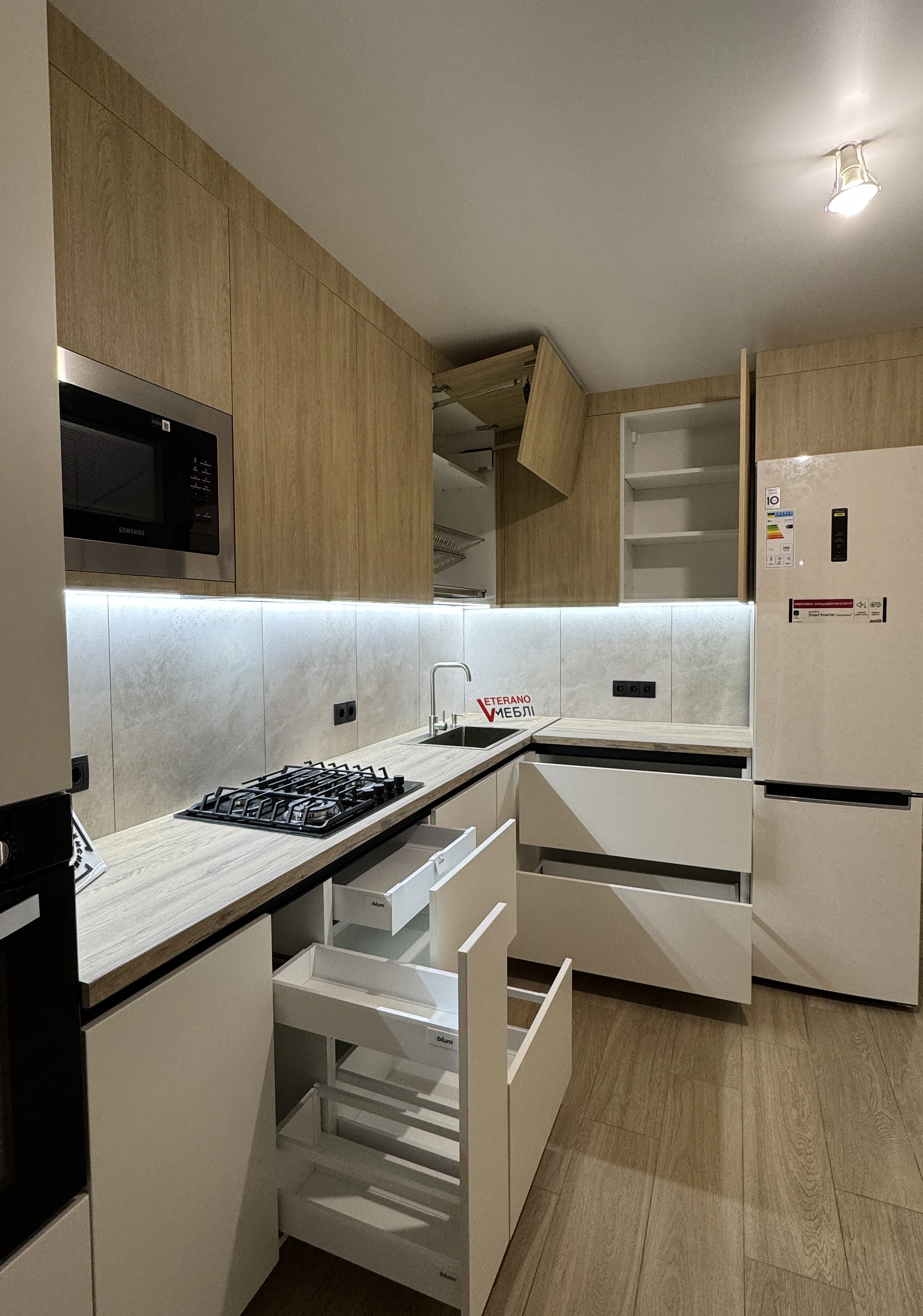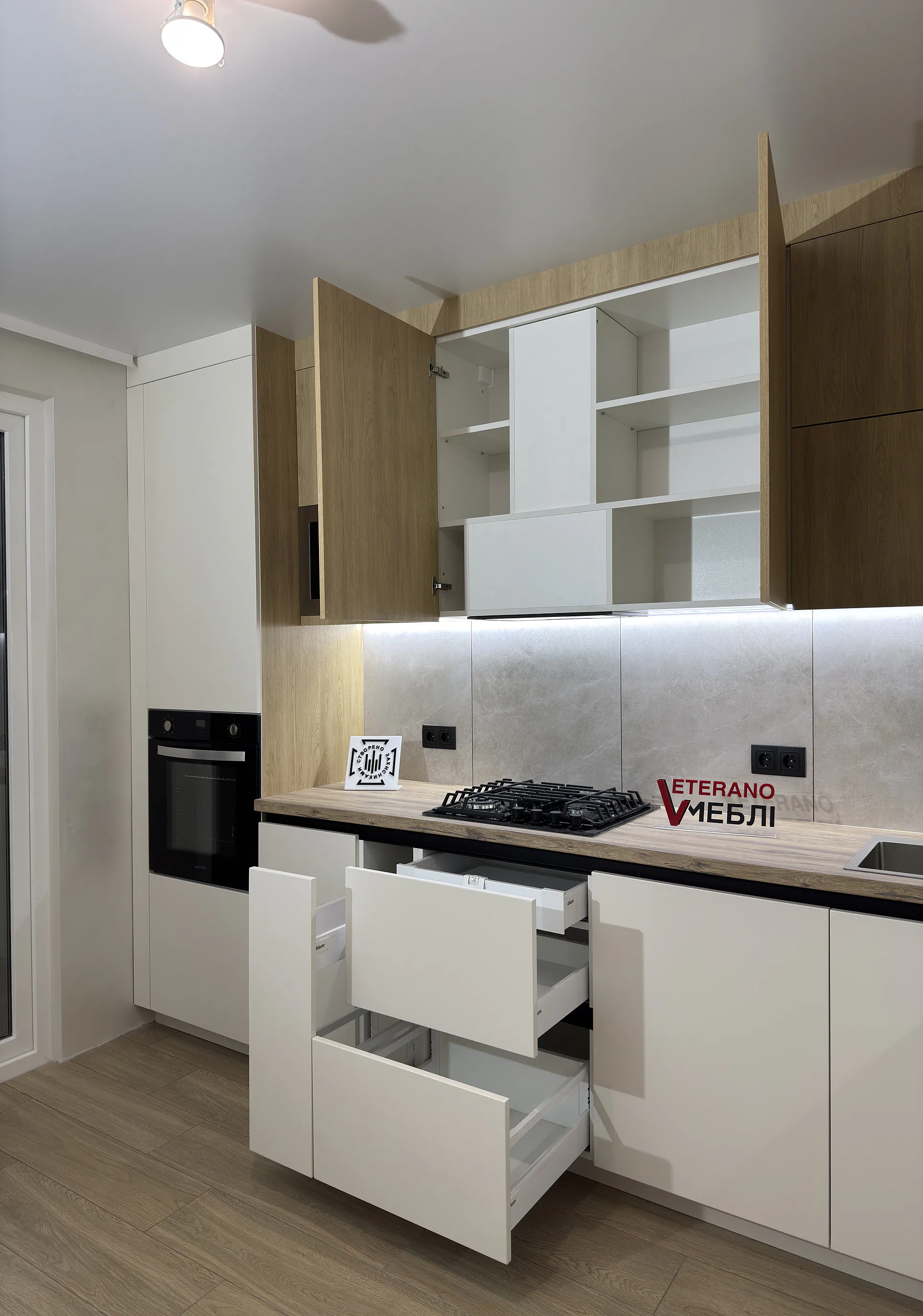 Фурнітура Blum забезпечує плавну та надійну роботу механізмів, тому ця кухня на замовлення у Тернополі поєднує сучасний вигляд, практичні матеріали та продумане виконання. Саме такі рішення команда Ветераномеблі реалізовує для тих, хто хоче отримати кухню під себе, а не шаблонний варіант.
