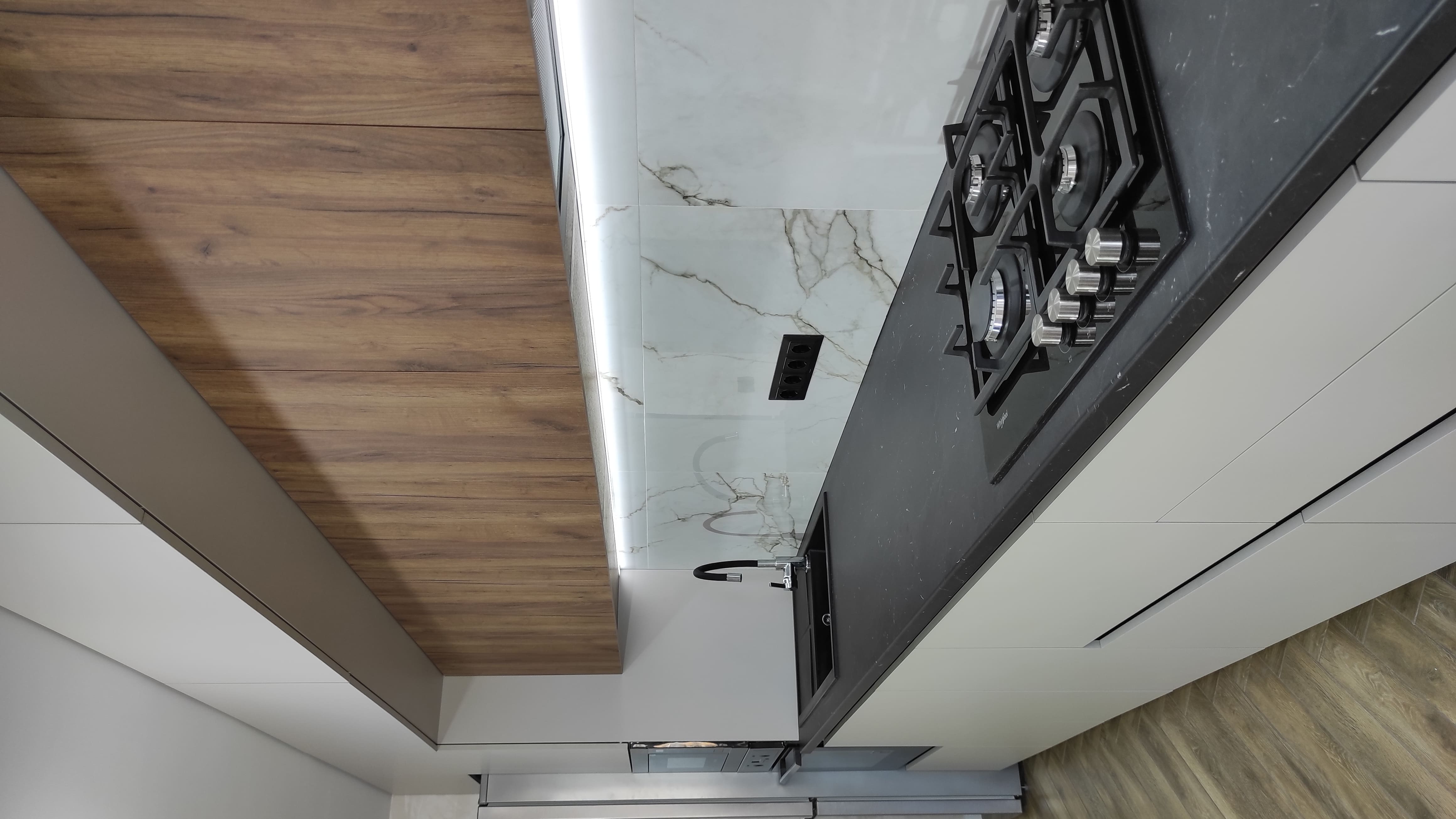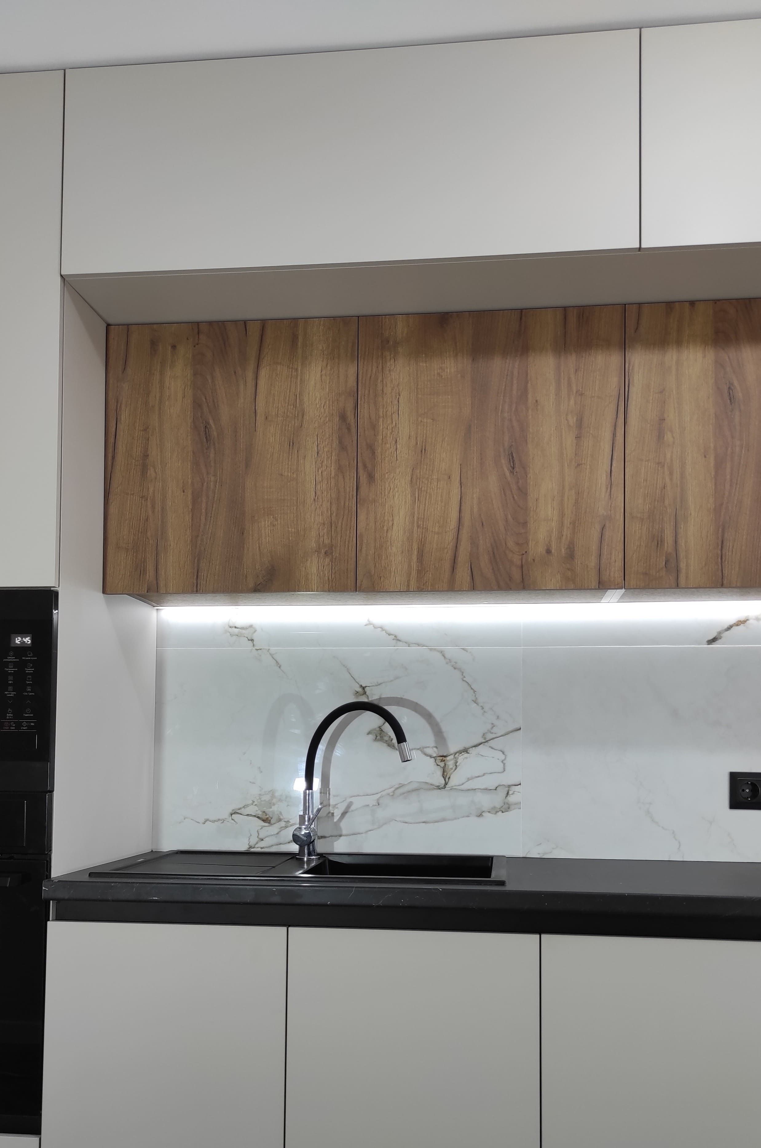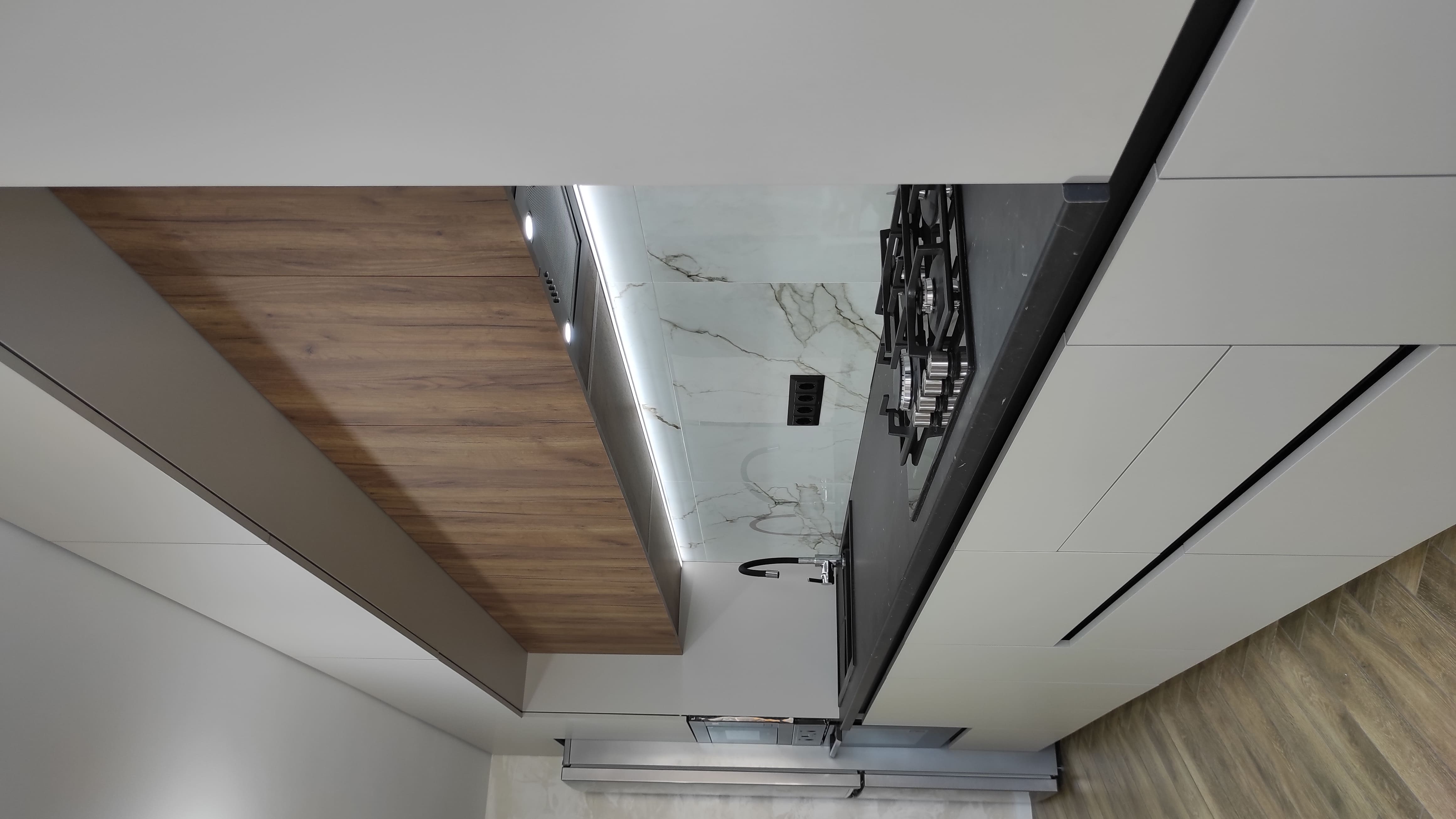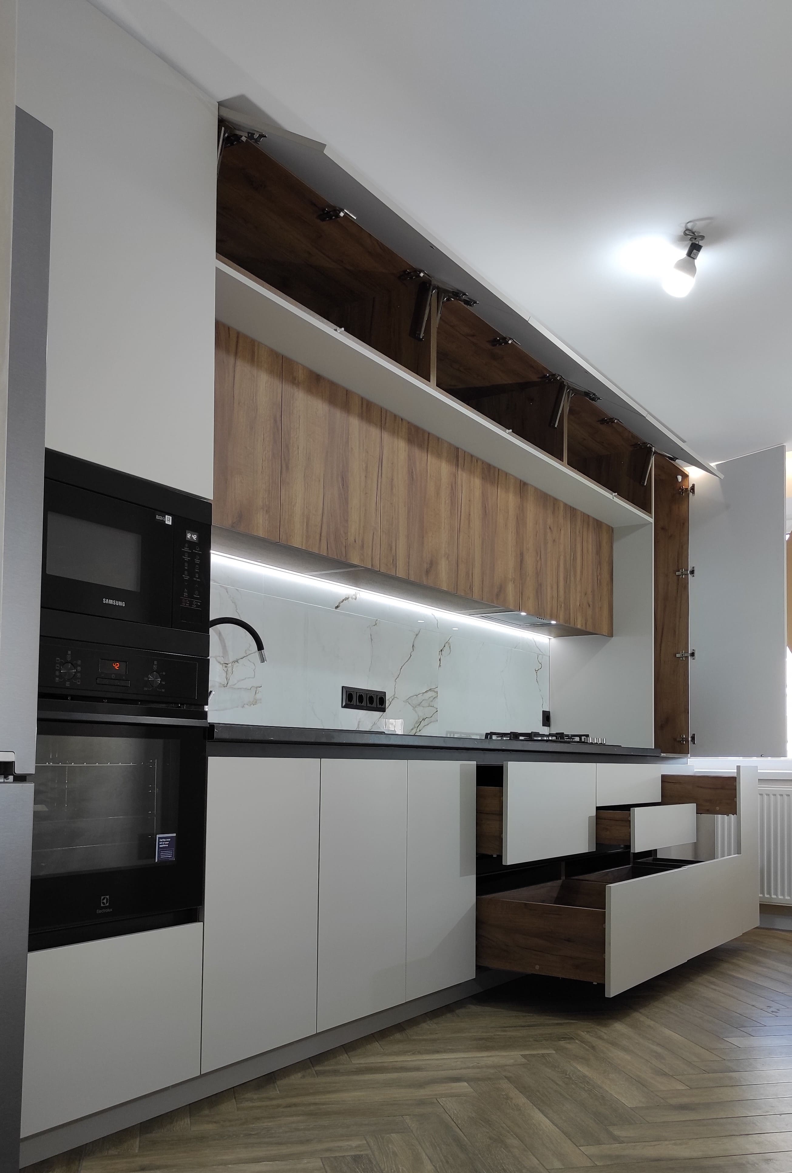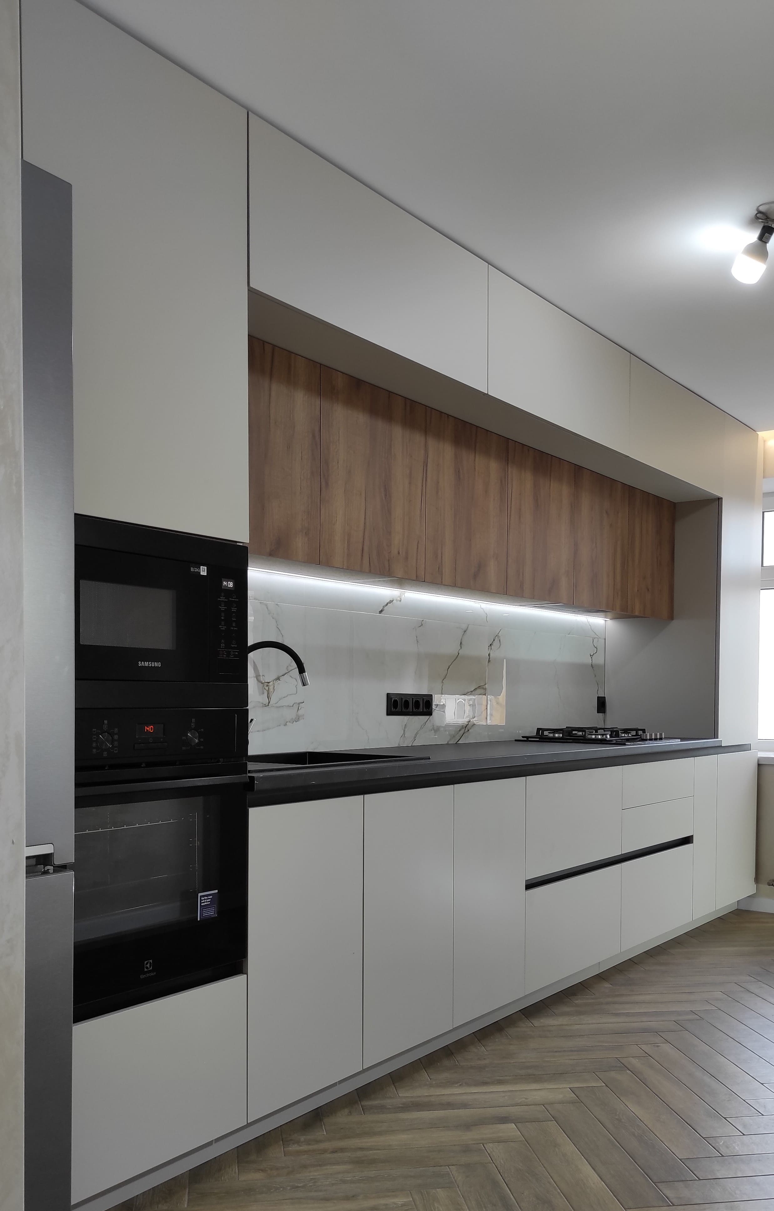 Дворівнева кухня з чудовим поєднанням кольорів, стильним дизайном та потужним функціоналом. Фасади - акрил + ЛДСП. Фурнітура blum. Стільниця Pfleiderer. LED -підсвітка