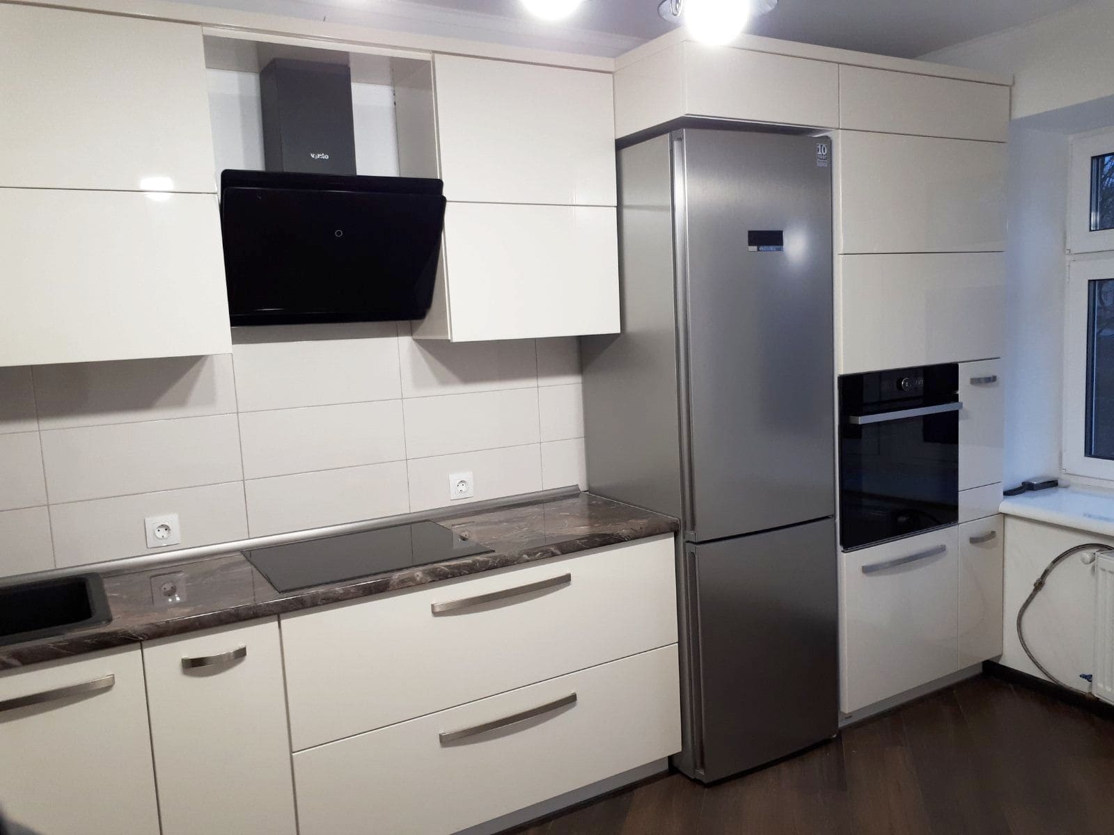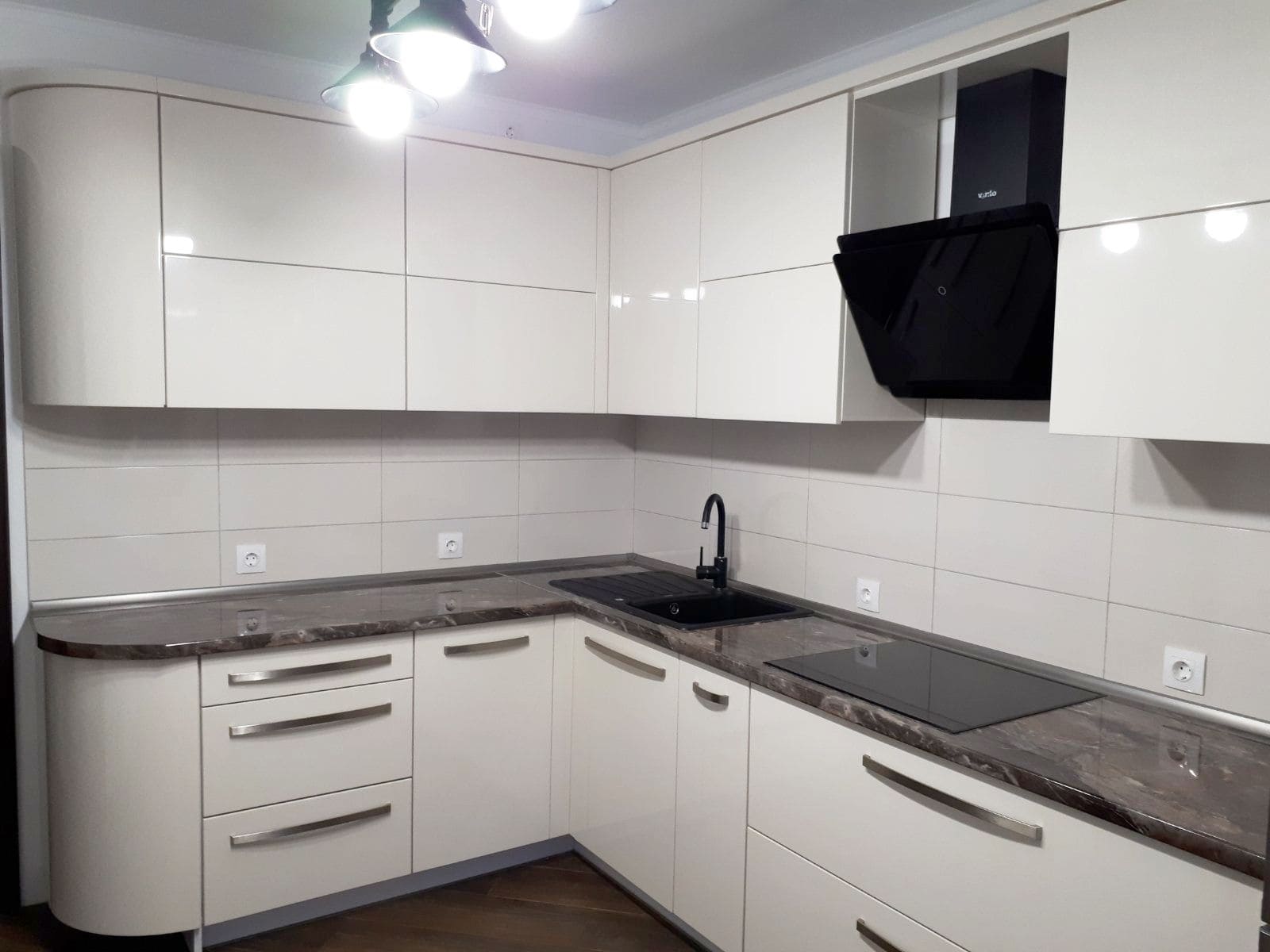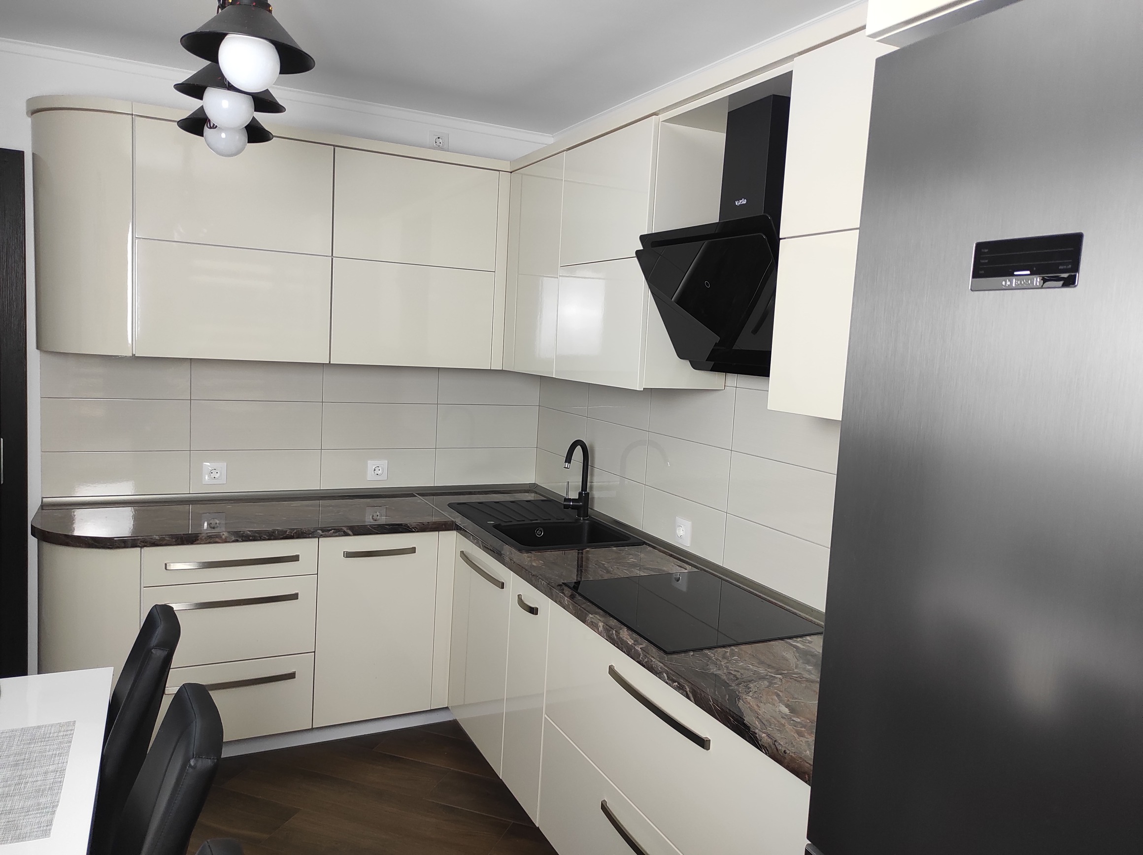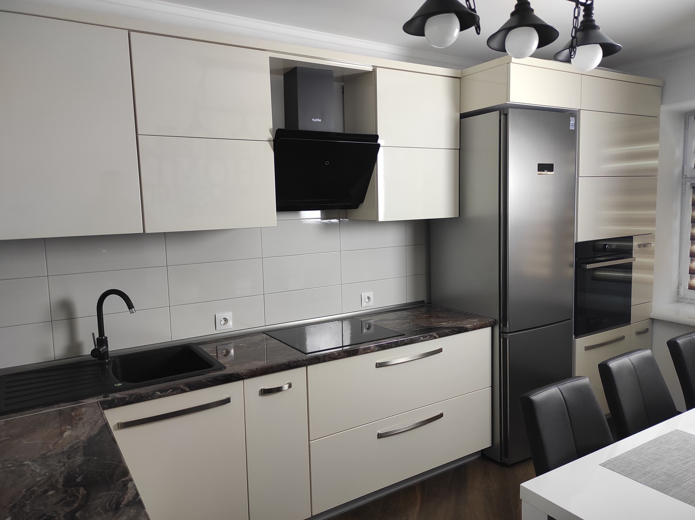 Кухня з фасадами з фарбованого МДФ. Фурнітура Blum. Cтільниця Luxeforme.