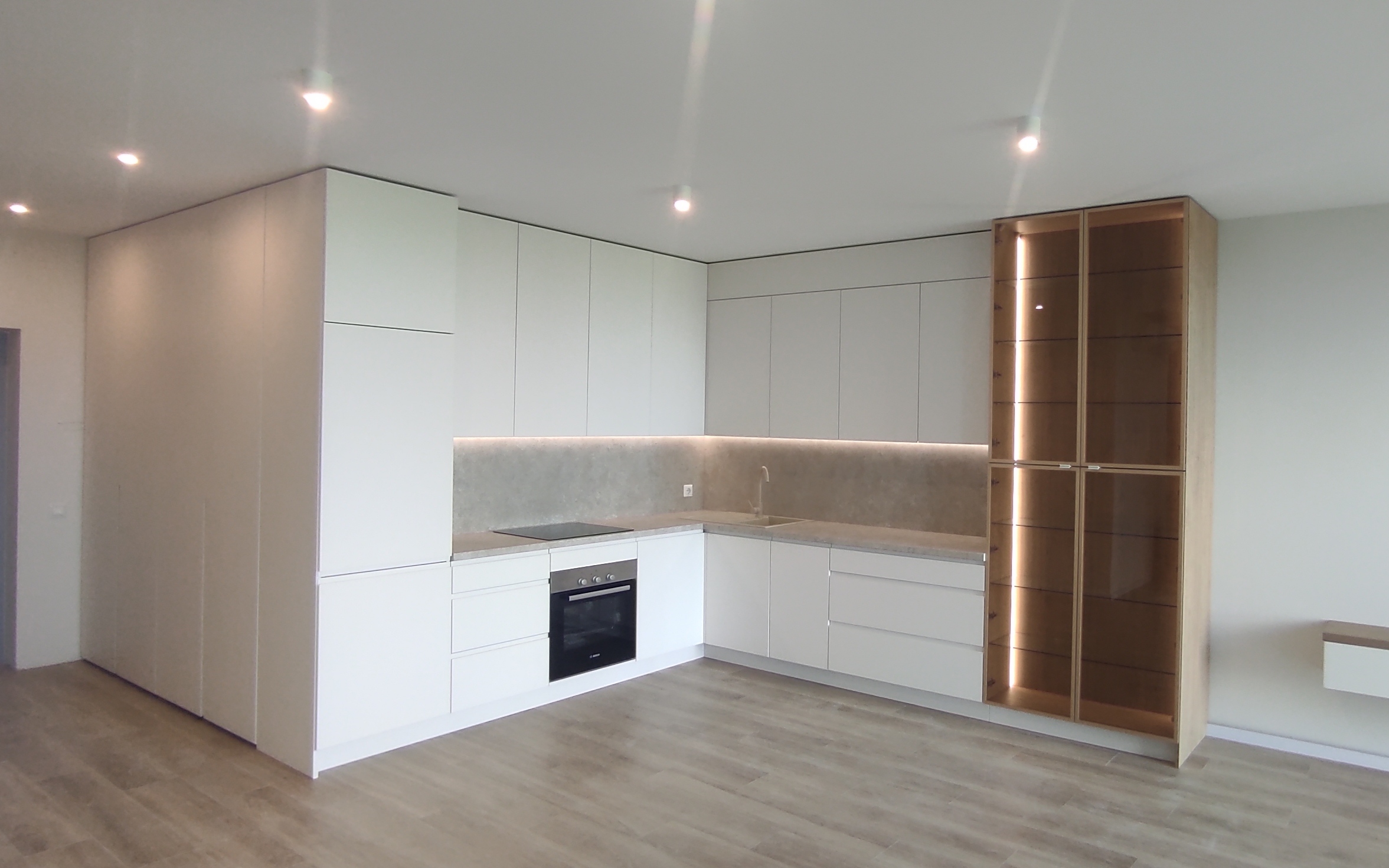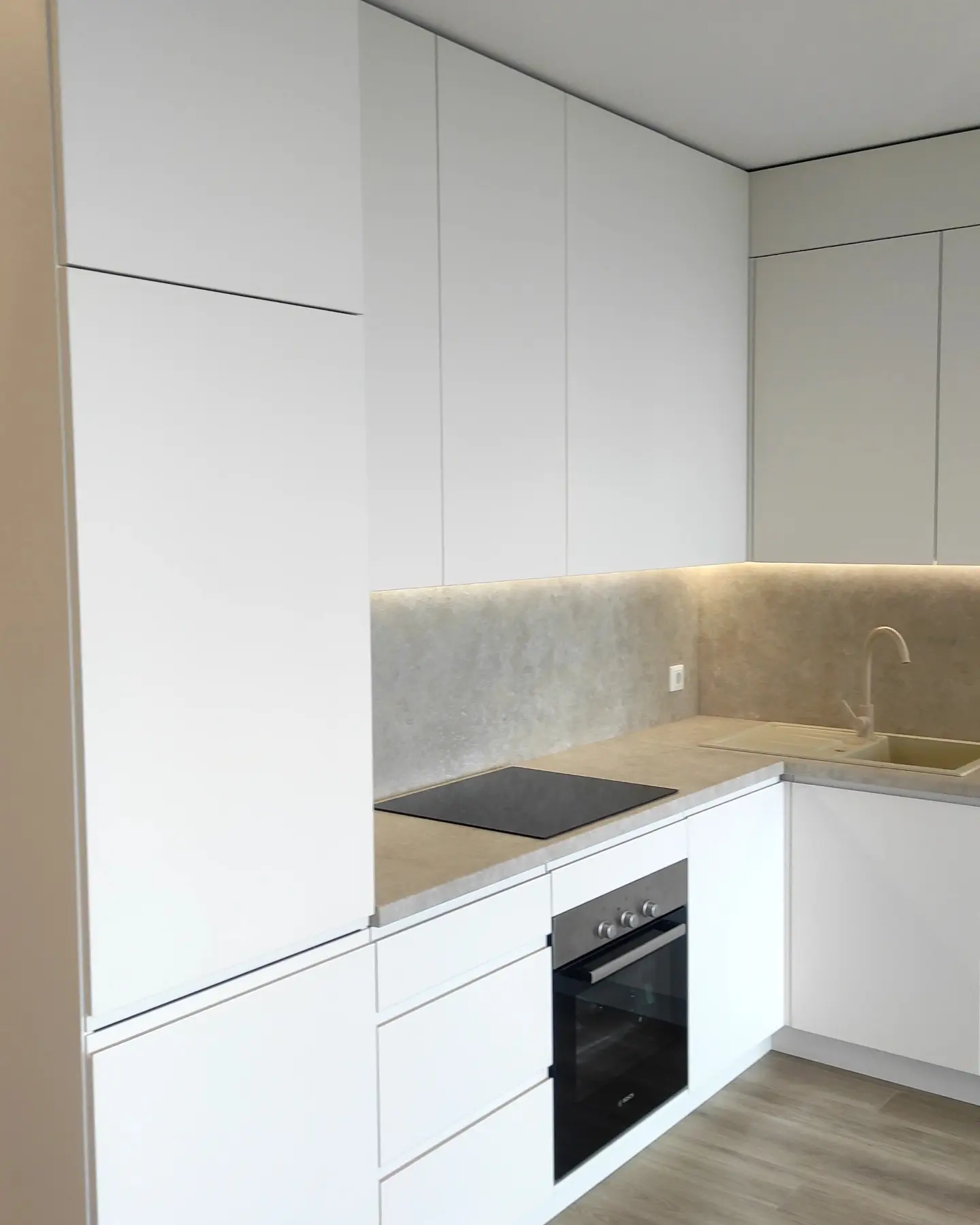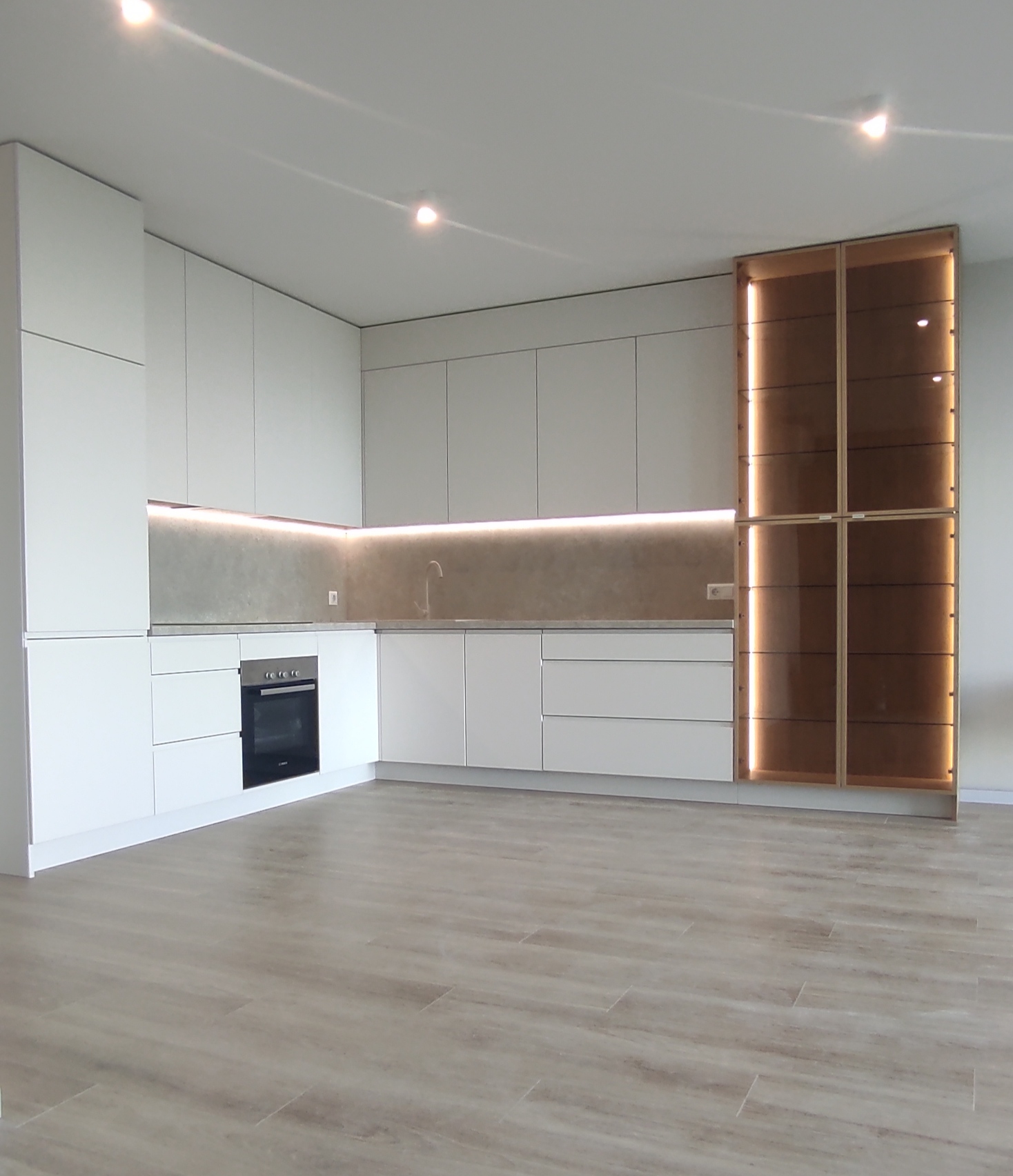 Всі меблі в цьому проекті виконані в одному стилі, що гармонійно поєднуються та доповнюють одне одного. Фасади та видимі частини - фарбоване МДФ (мат); ◽фурнітура Blum; ◽стільниця вологостійка Egger; ◽стінова панель в колір стільниці; ◽LED - підсвітка в вітрині та робочої зони; ◽вмонтована побутова техніка