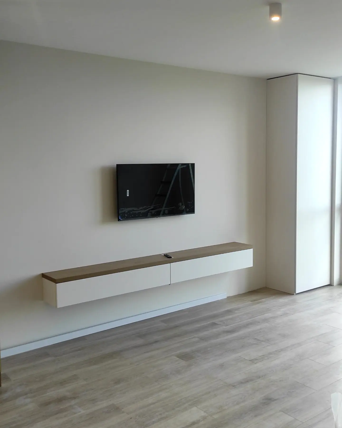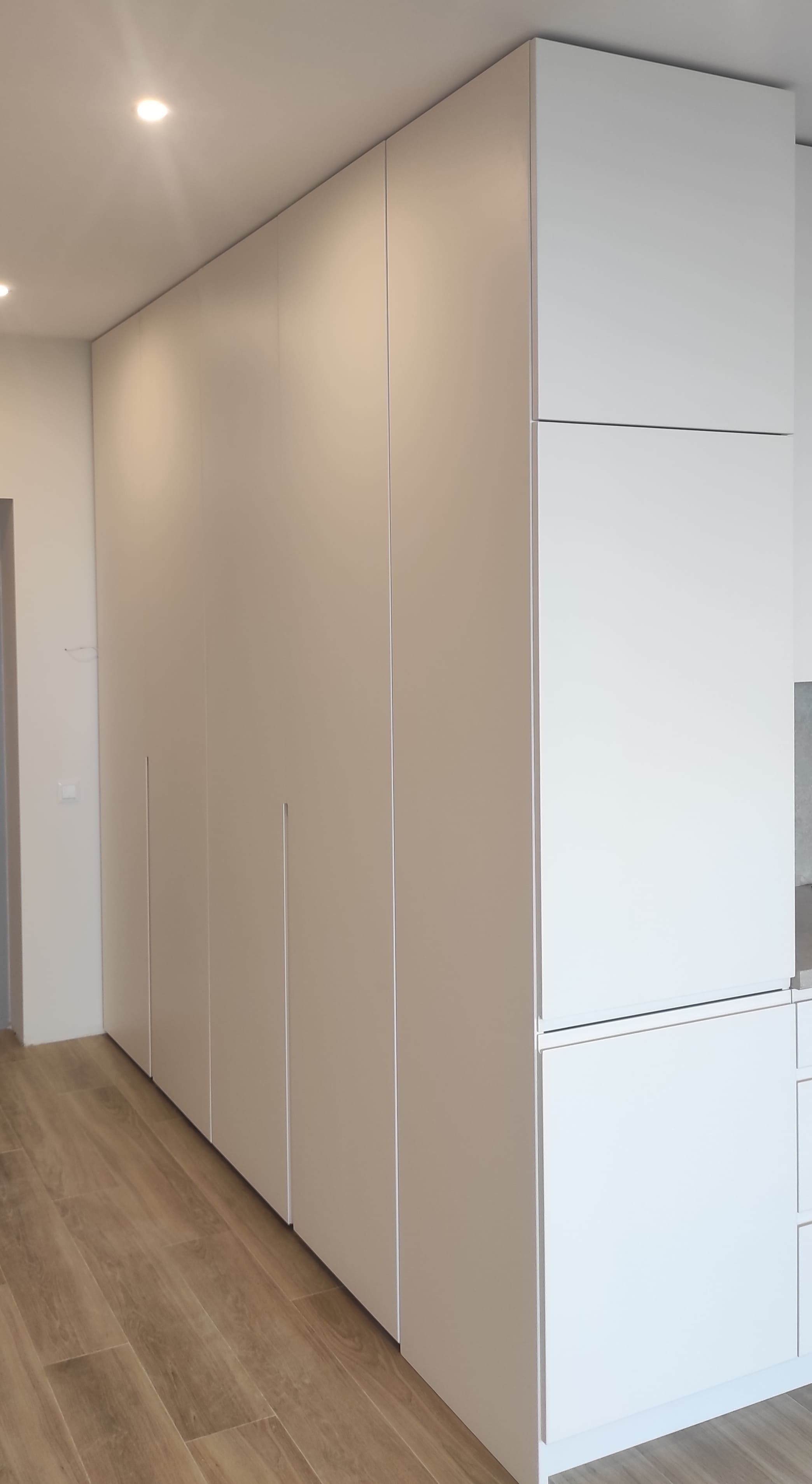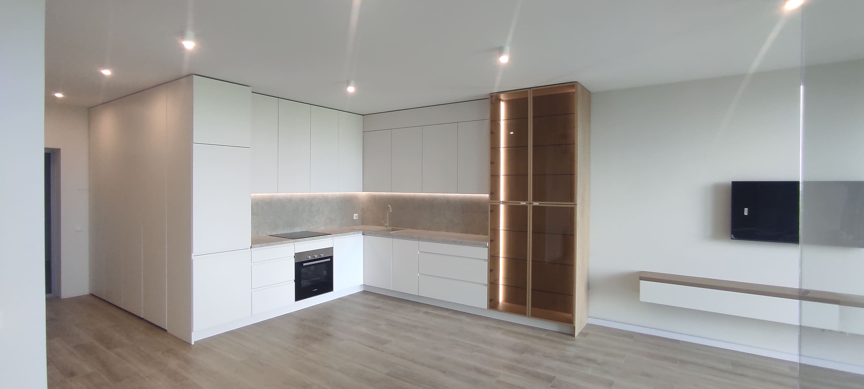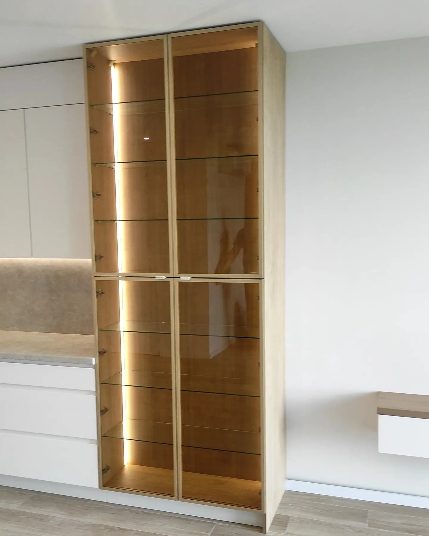 Всі меблі в цьому проекті виконані в одному стилі, що гармонійно поєднуються та доповнюють одне одного. Фасади та видимі частини - фарбоване МДФ (мат); ◽фурнітура Blum; ◽стільниця вологостійка Egger; ◽стінова панель в колір стільниці; ◽LED - підсвітка в вітрині та робочої зони; ◽вмонтована побутова техніка