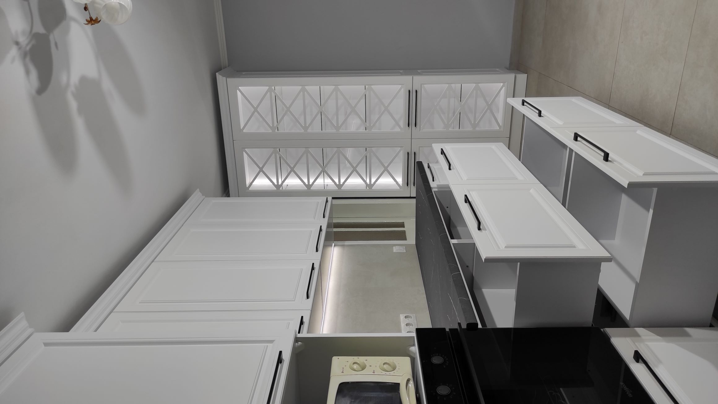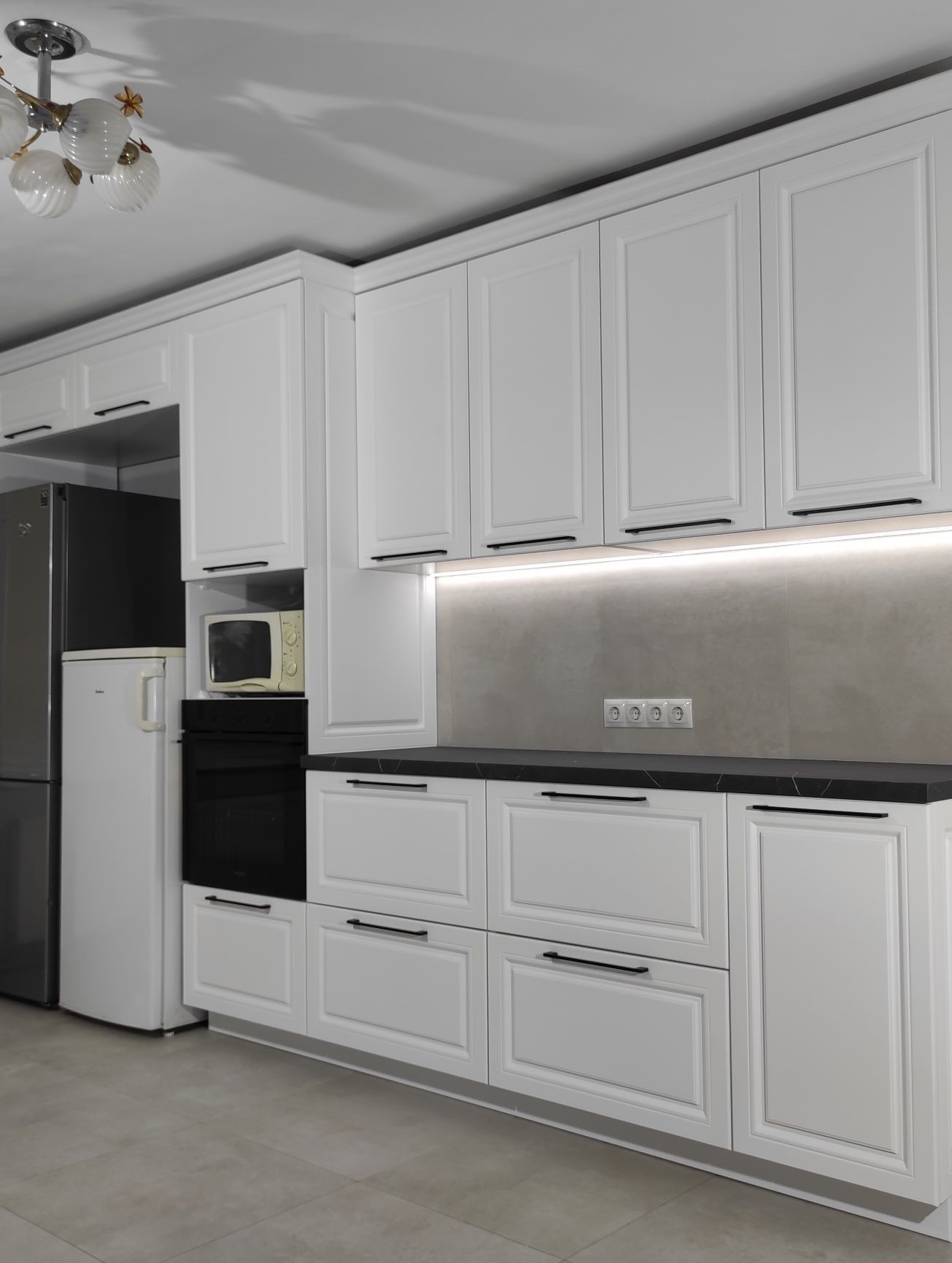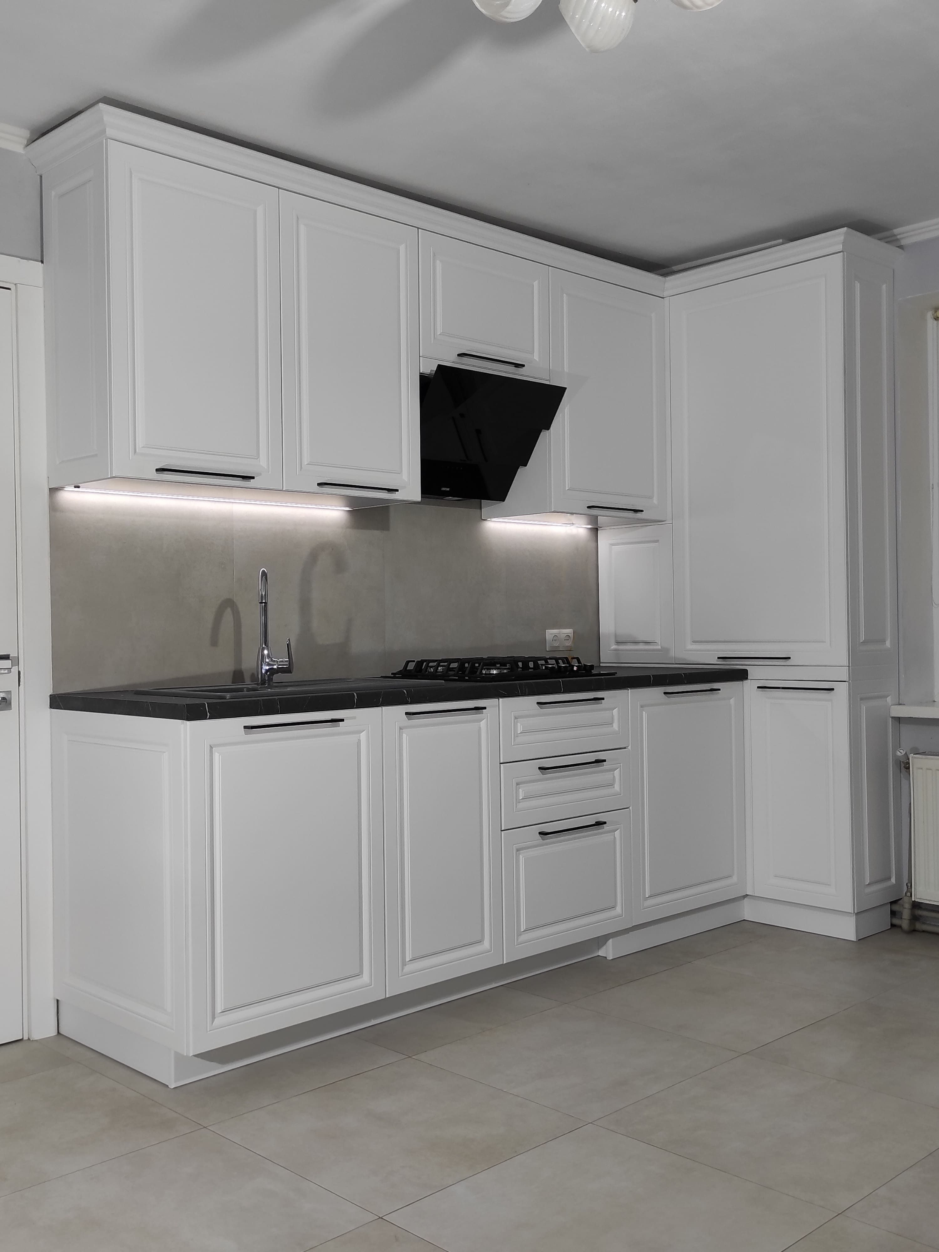 Біла кухня на замовлення з фарбованими фасадами МДФ в класичному стилі.