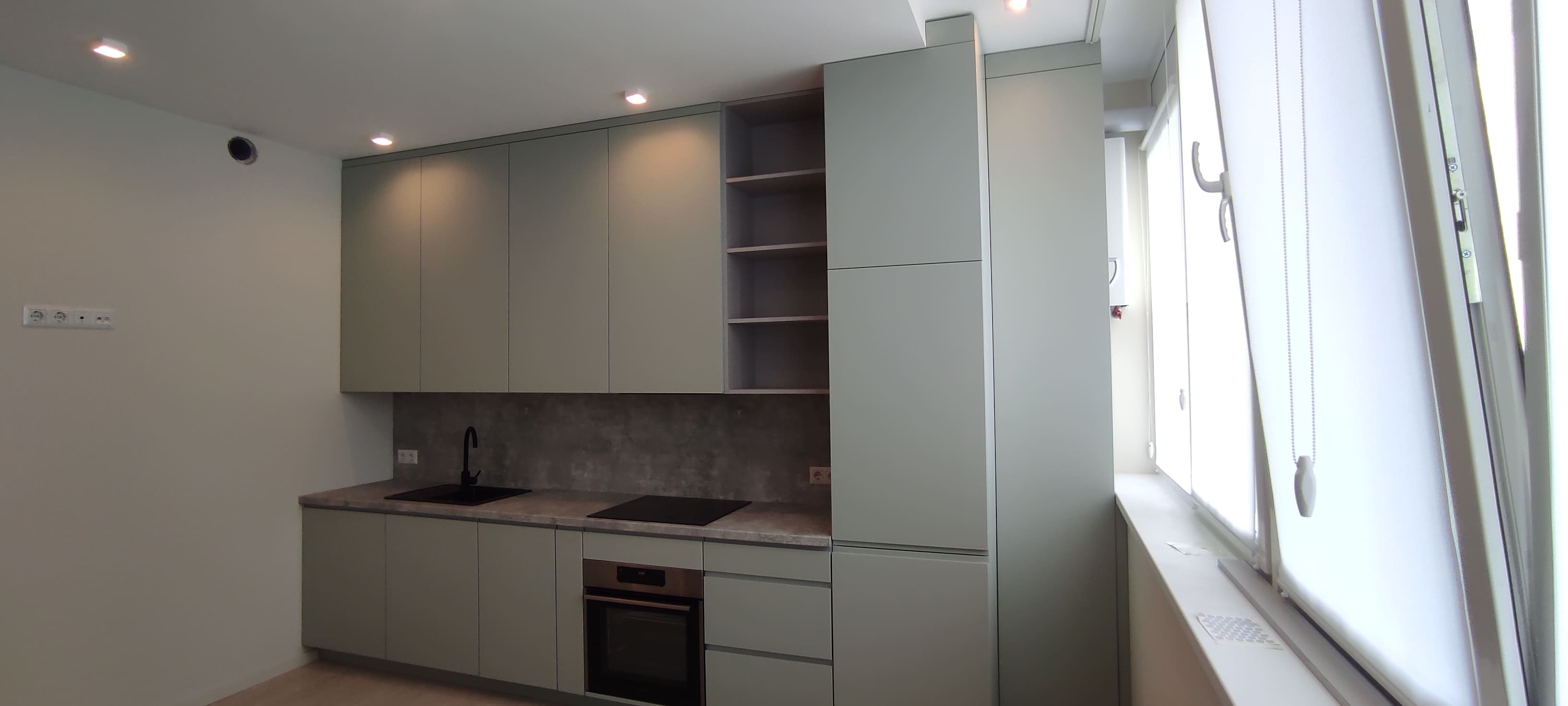 Кухня під замовлення без ручок, з фасадами з фарбованого МДФ. Фурнітура Blum
