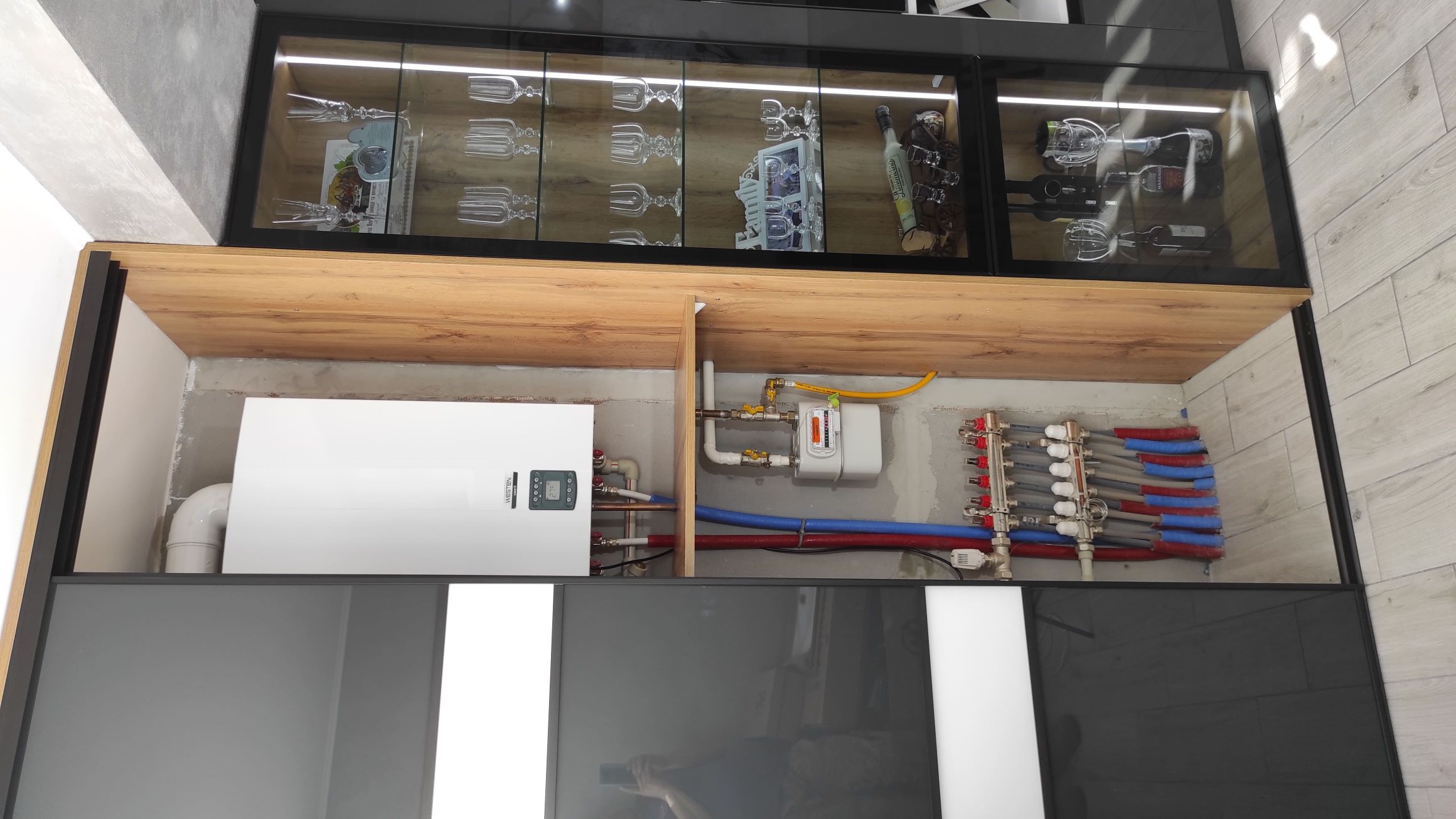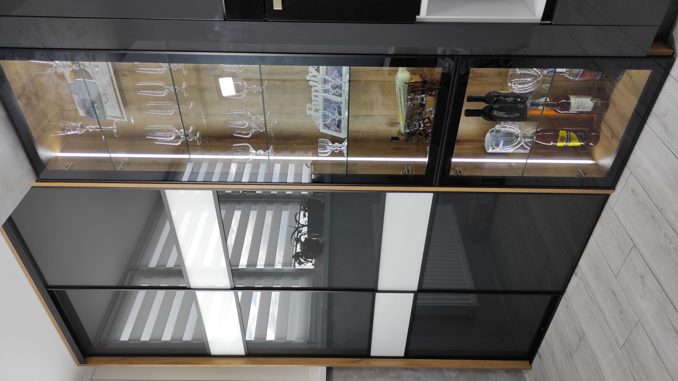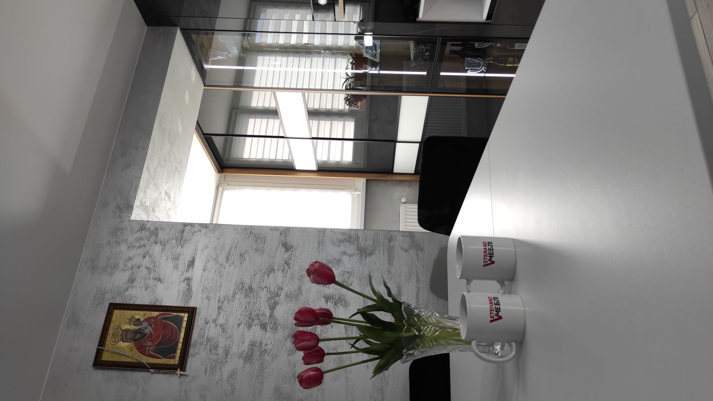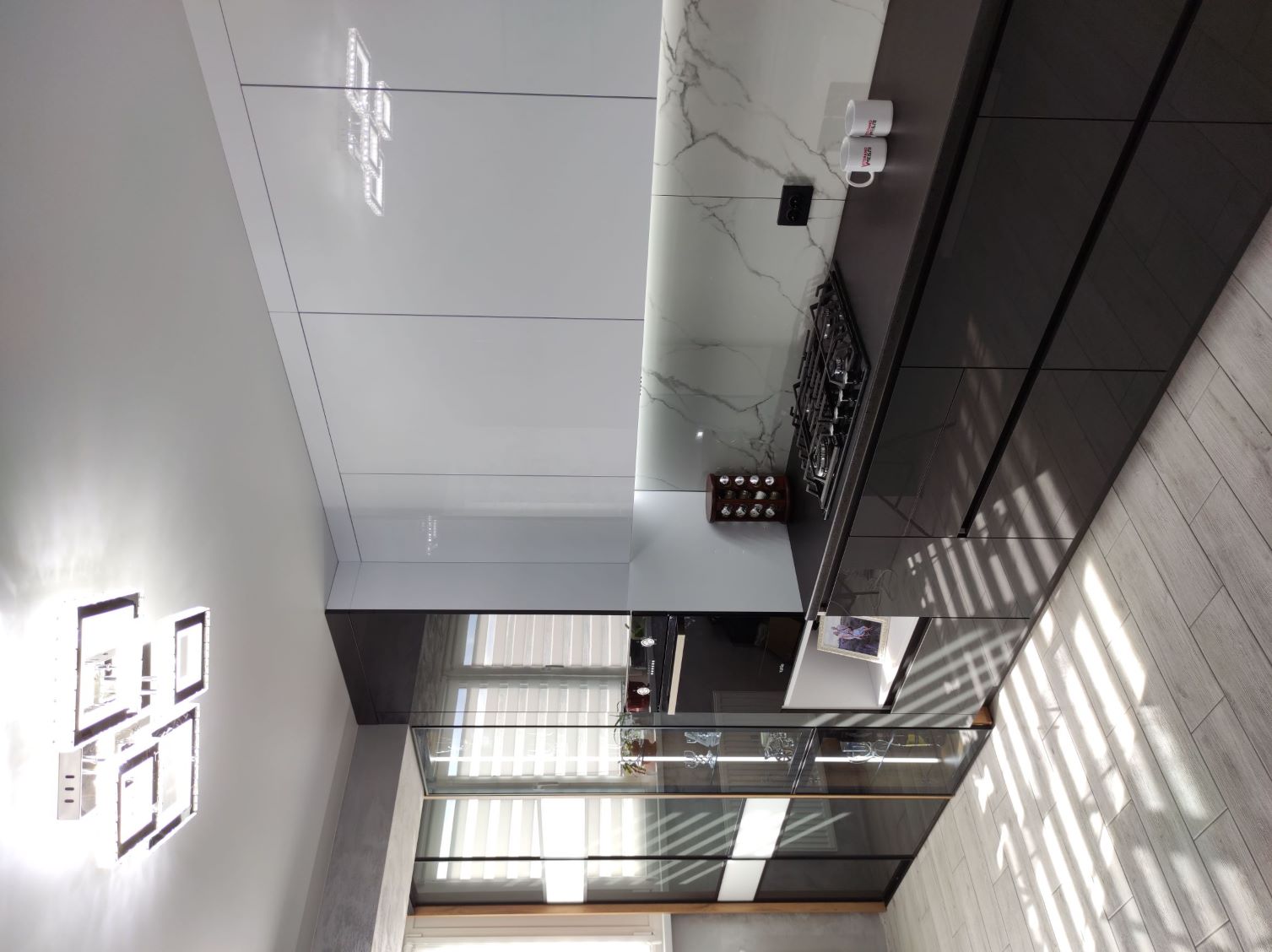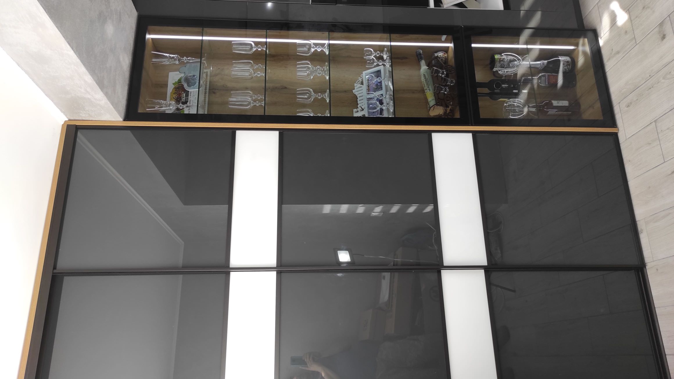 Сучасна шафа-купе для розширення кухні з дзеркалом лакобель від Ветераномеблі. Ось так можна збільшити функціонал кухні, коли вона плавно переходить в балкон. Шафа-купе з дверима з дзеркала лакобель зі вставками, вмонтована під стелю. Двері - скло лакобель зі вставками. Якщо Ви шукаєте стильну та практичну шафу для спальні - зверніть увагу на дану шафу-купе. Вона допоможе заощадити простір та стати елегантним доповненням вашої кухні.