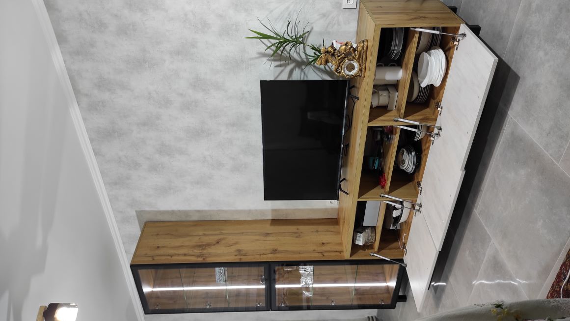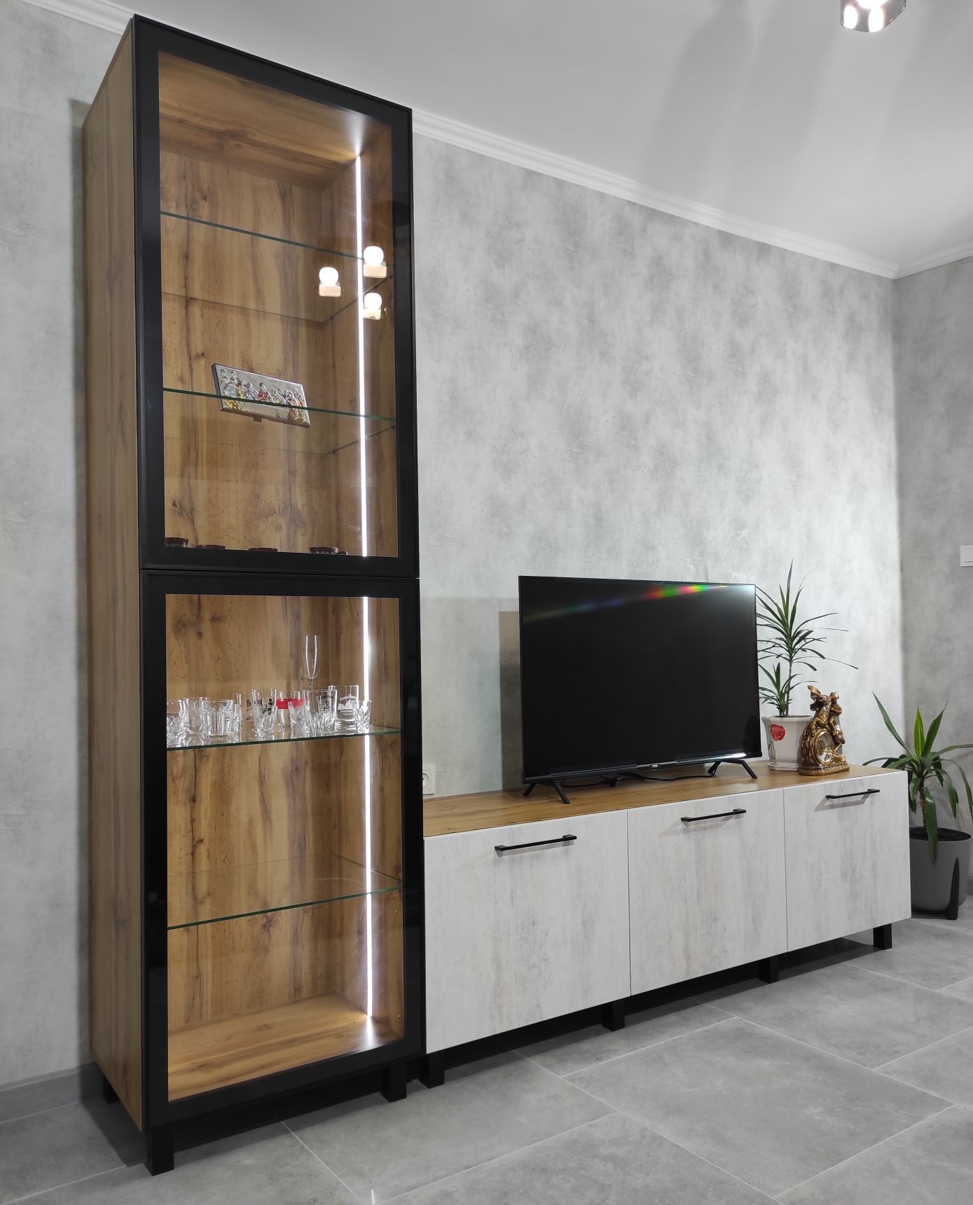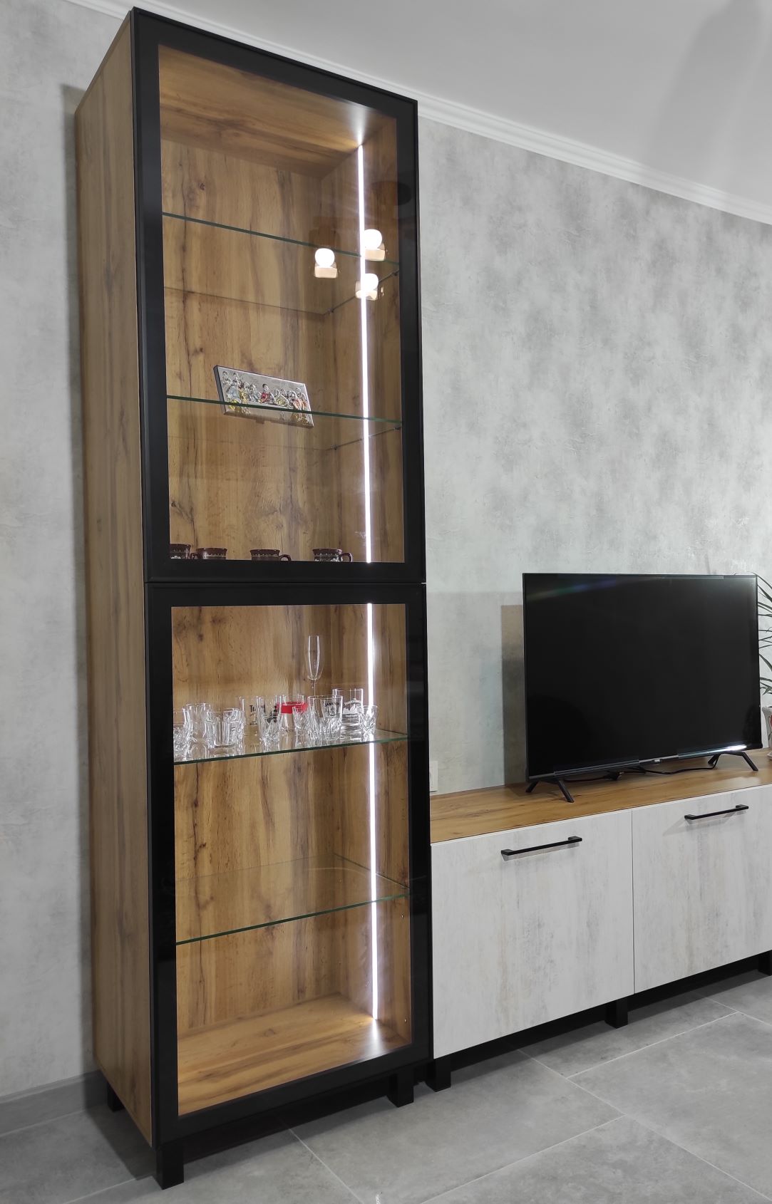 Стінка у вітальню зі скляною вітриною виконана на замовленні у Ветераномеблі
