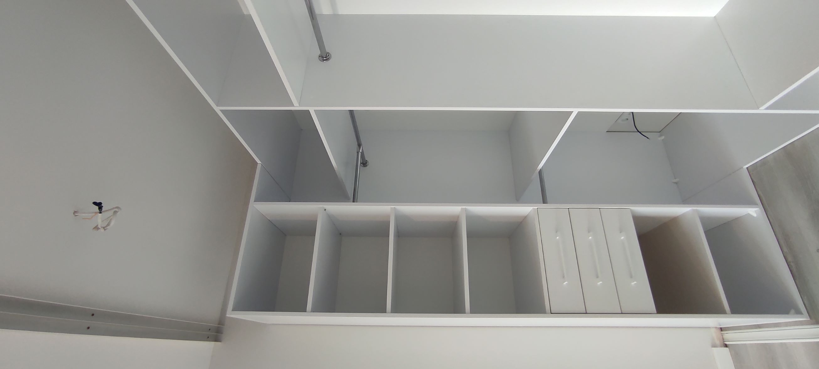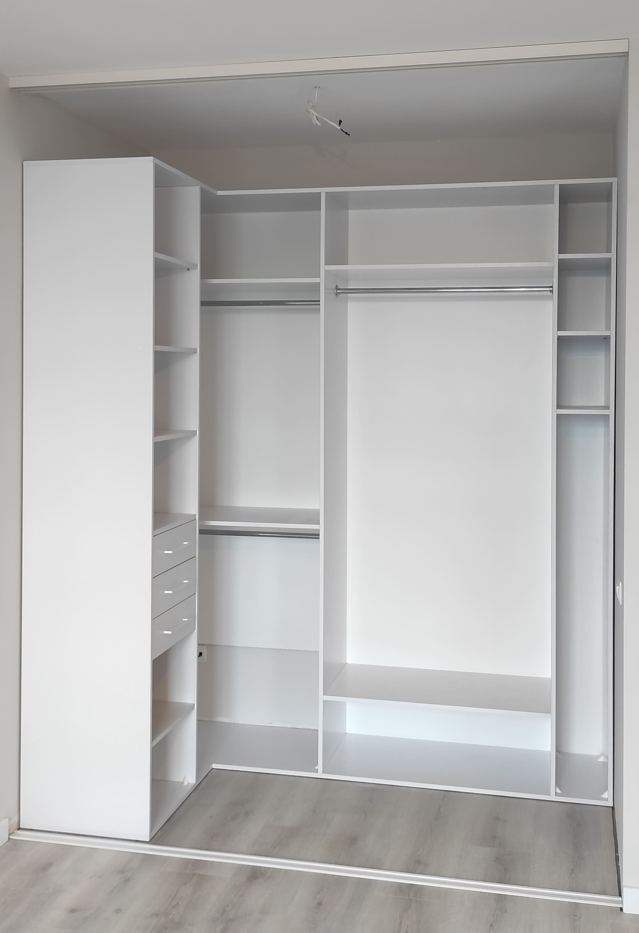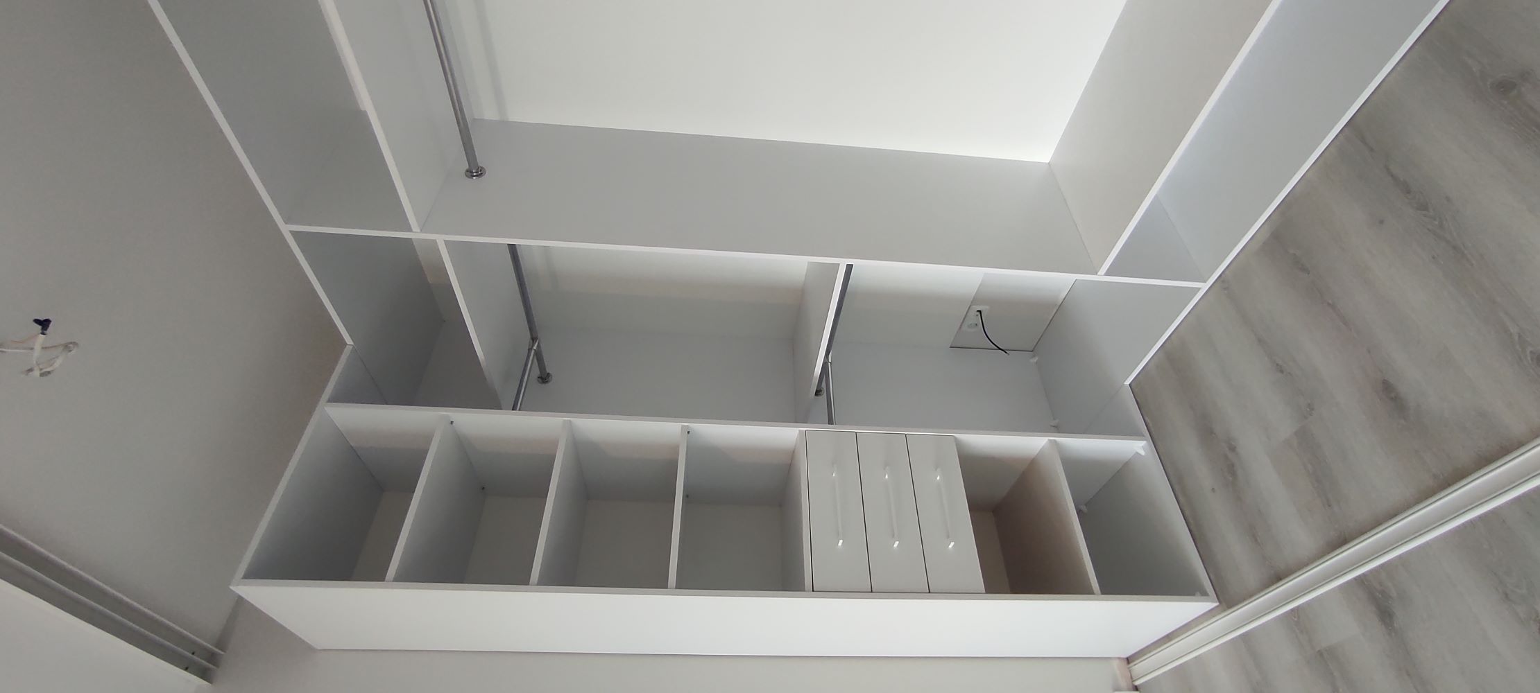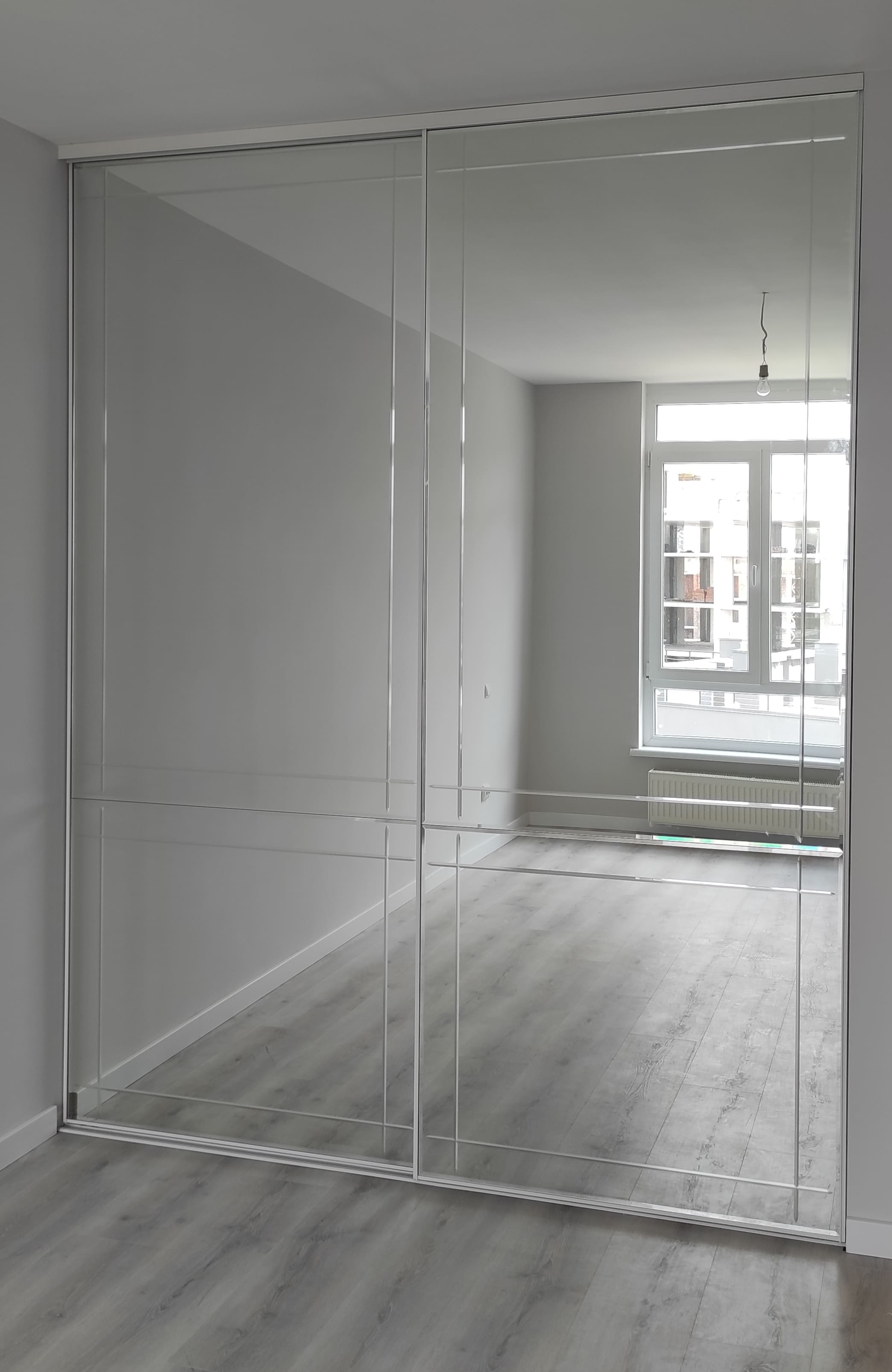 Вбудована шафа-купе в ніші за індивідуальним замовленням- хороша ідея для однокімнатної квартири з нішею. У вмісткій шафі багато місця для одягу, а дзеркальні двері візуально збільшують простір.